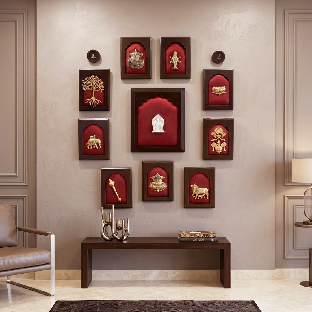 10 Auspicious Elements Wall Art Set with Kubera Center | Red Silk Backdrop Wooden Frame | Luxury Vastu Decor for Home Entrance & Living Room
