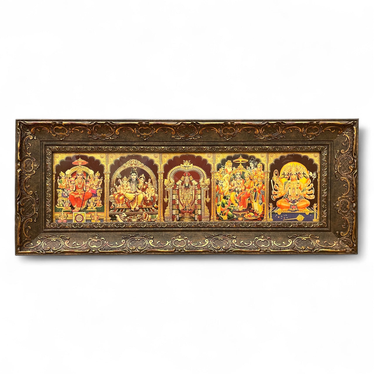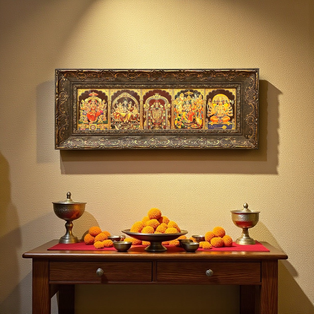 Embrace divine harmony and spiritual strength with our 5 Gods in One Frame, featuring Lalitha Tripura Sundari, Shiva Parivar, Tirupati Balaji, Rama Pattabhisheka, and Panchamukhi Hanuman. Each deity is intricately handcrafted in brass and beautifully arranged in a single elegant frame, representing beauty, strength, devotion, protection, and prosperity. This sacred composition unites the most revered gods, making it a perfect choice for homes, offices, and gifting. A symbol of divine unity and blessings, it fills your space with peace, positivity, and spiritual energy.