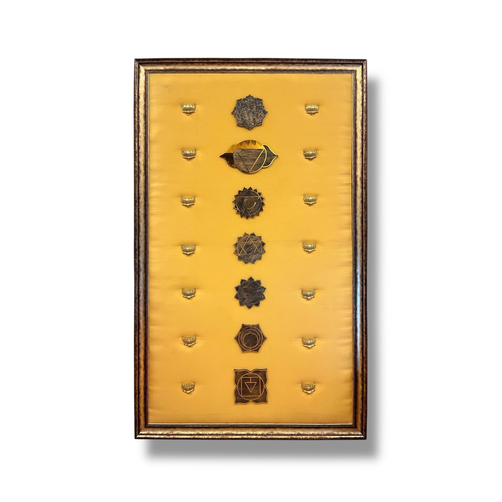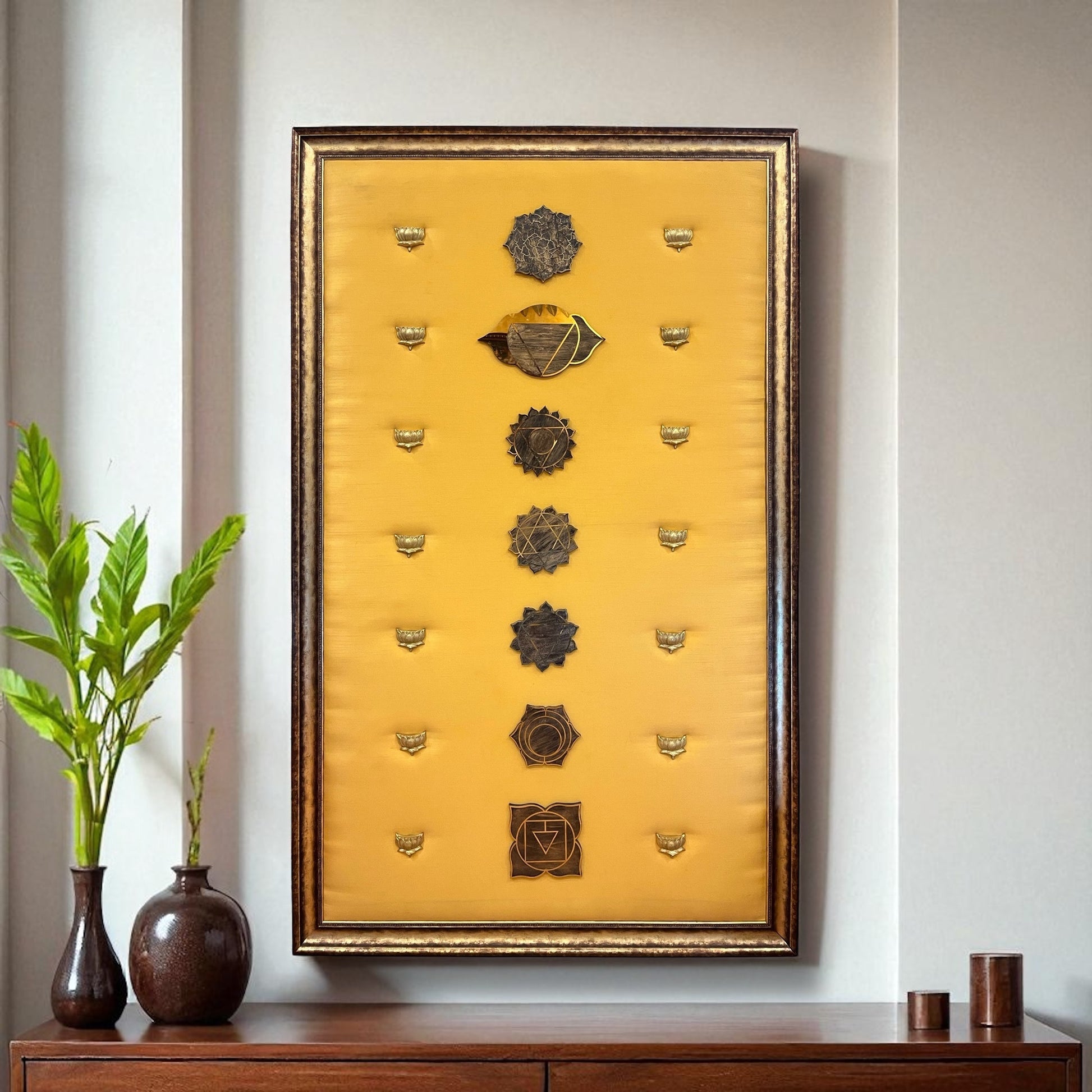 7 Chakra Wall Art | Sacred Energy Symbols crafted in titanium with brass lotus embellishments on Golden Silk | Framed decor to make a statement.