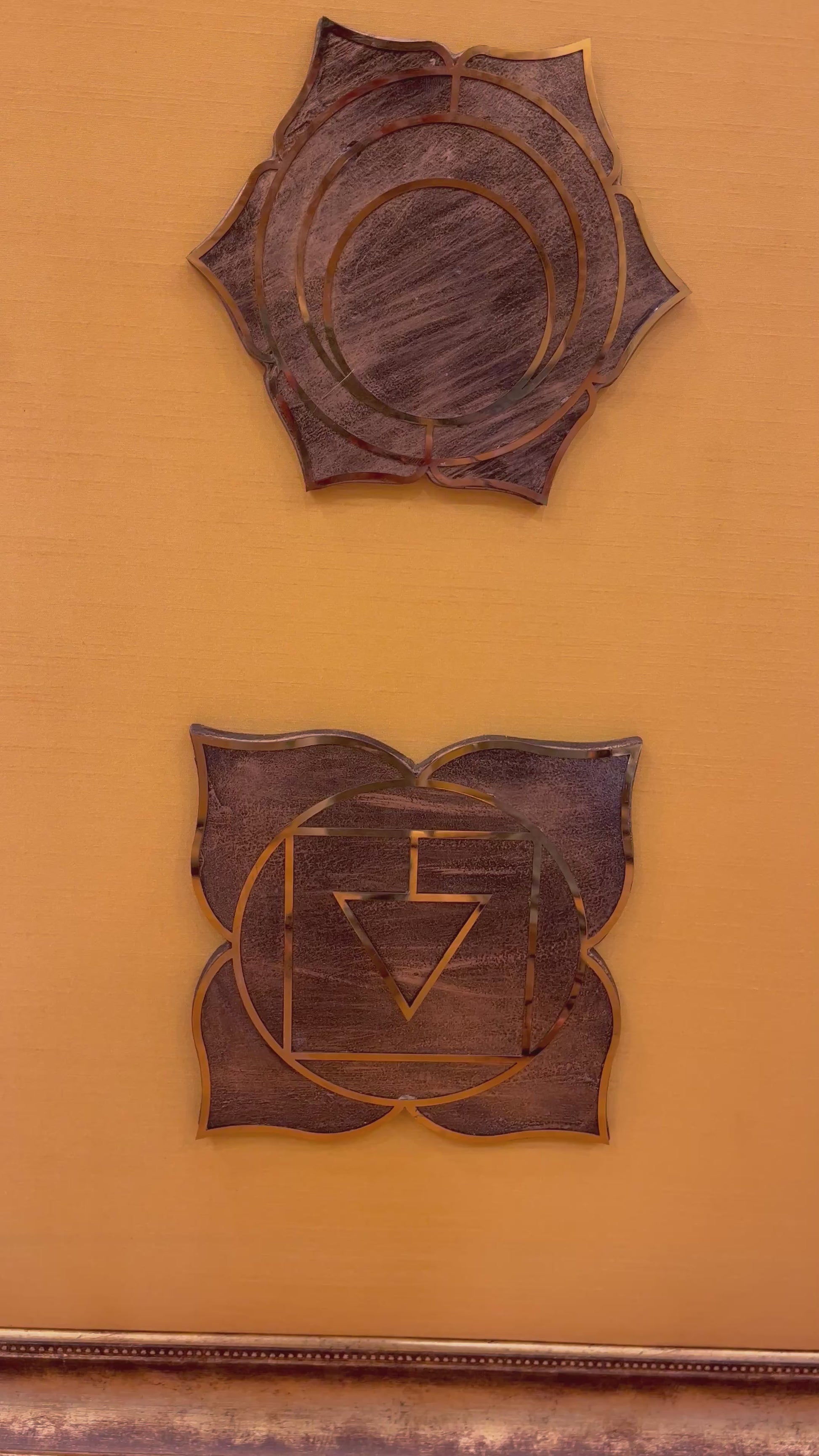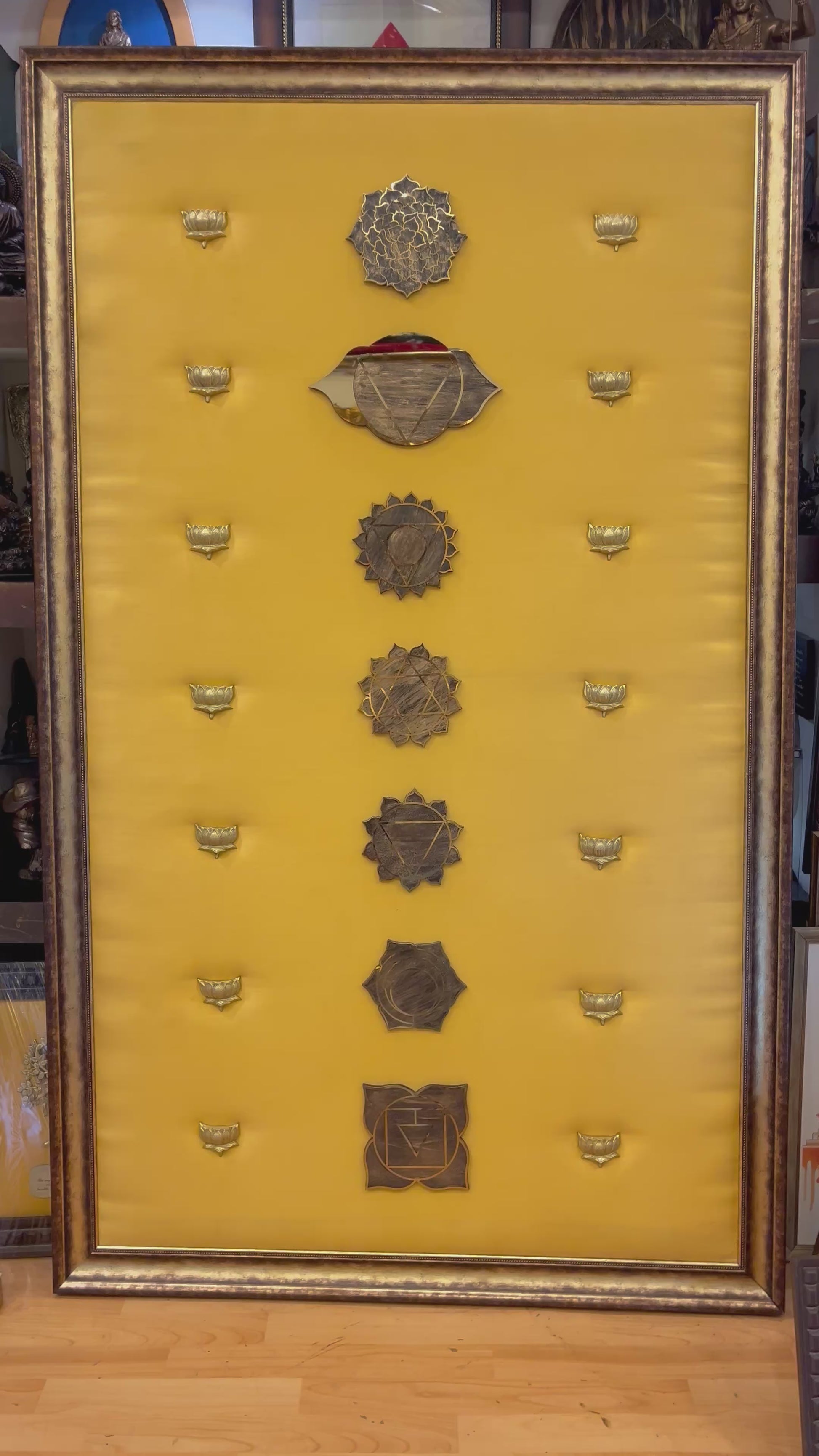 Elevate your space with this exquisite 7 Chakra Wall Art, a handcrafted tribute to the ancient energy centers within the human body. Each chakra is meticulously represented using titanium metal symbols and brass lotus, set against a golden silk backdrop that symbolises grounding, strength, and spiritual vitality.its a depiction of these 7 energies that we are composed of.ot is a live size depiction when you stand against it you feel the sensual energy forms just outside and in front of you. This is an artistic depiction by Artist Kaushalya.