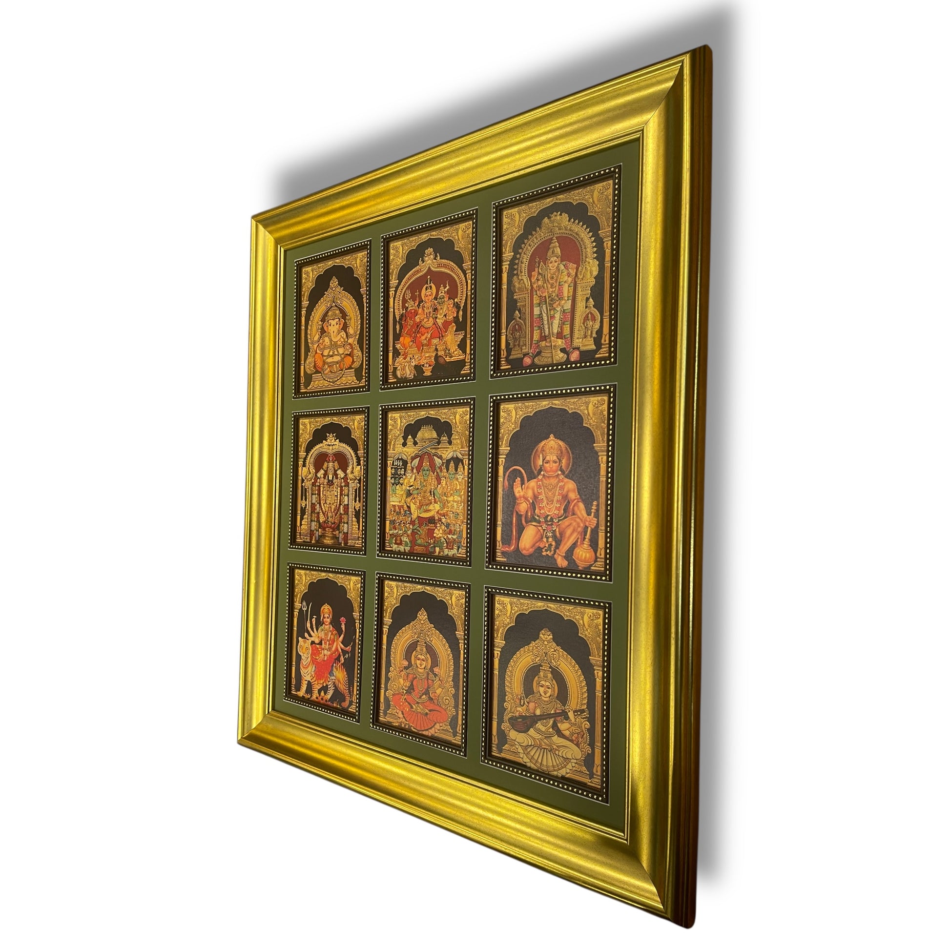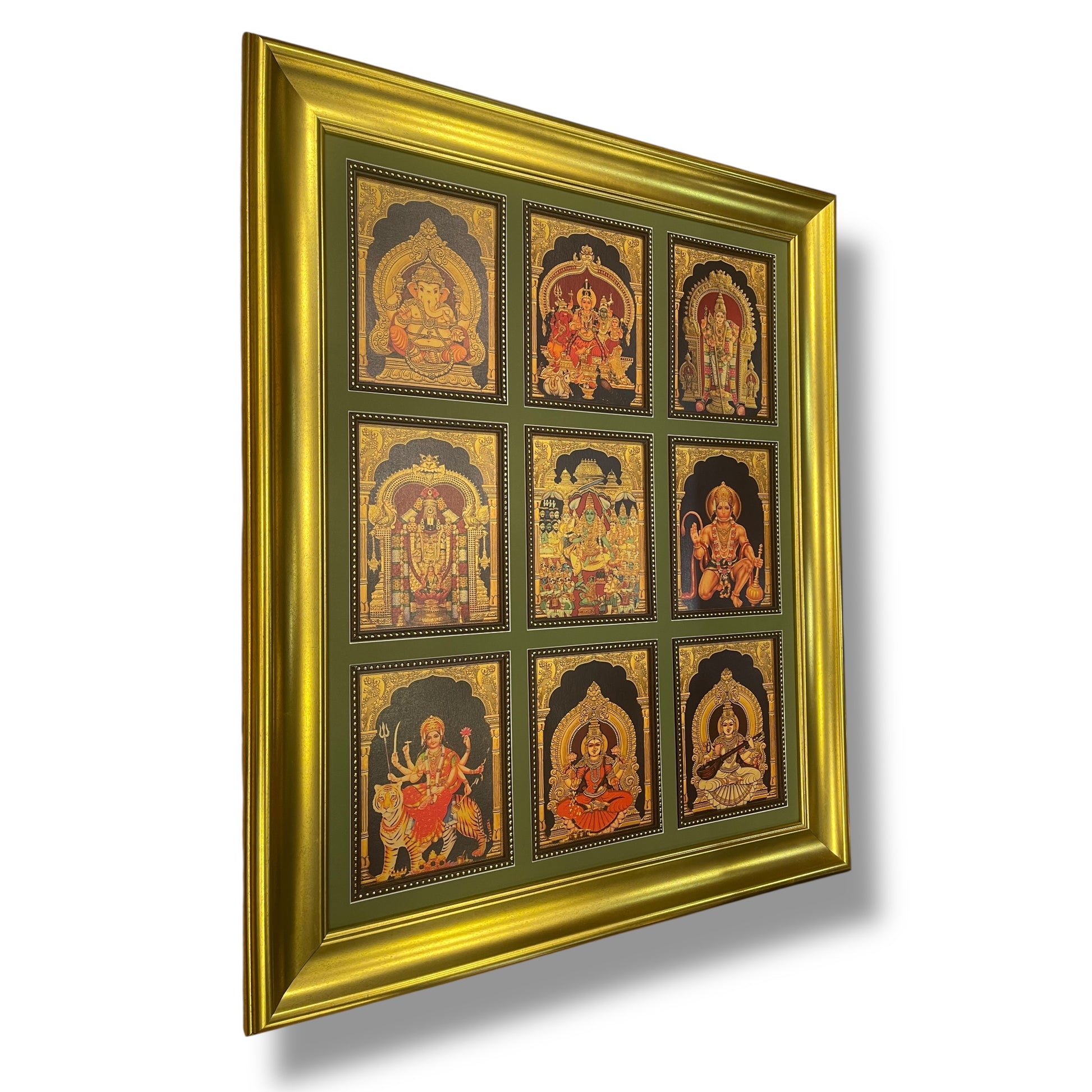 This elegant Tanjore-style artwork brings together nine powerful deities, radiating blessings, harmony, and positive energy: