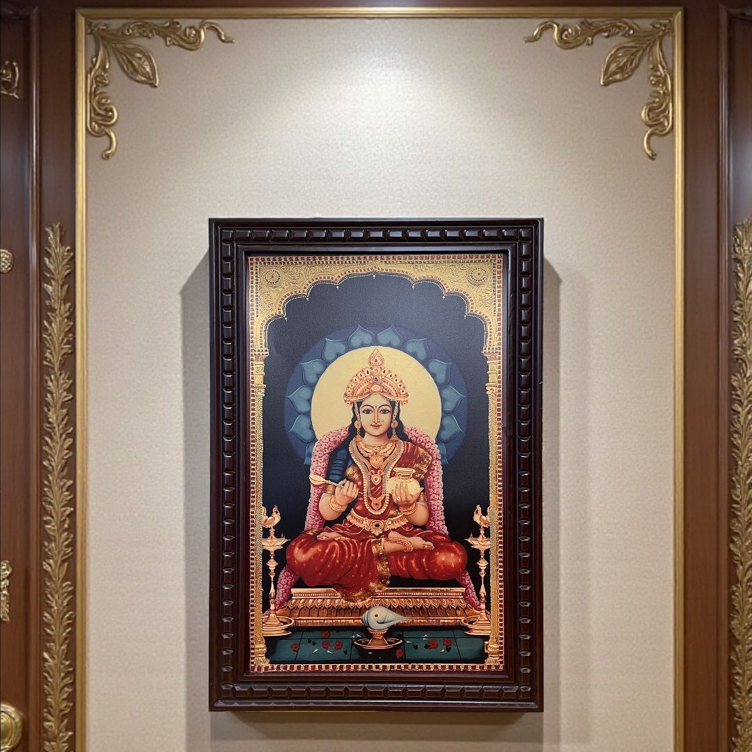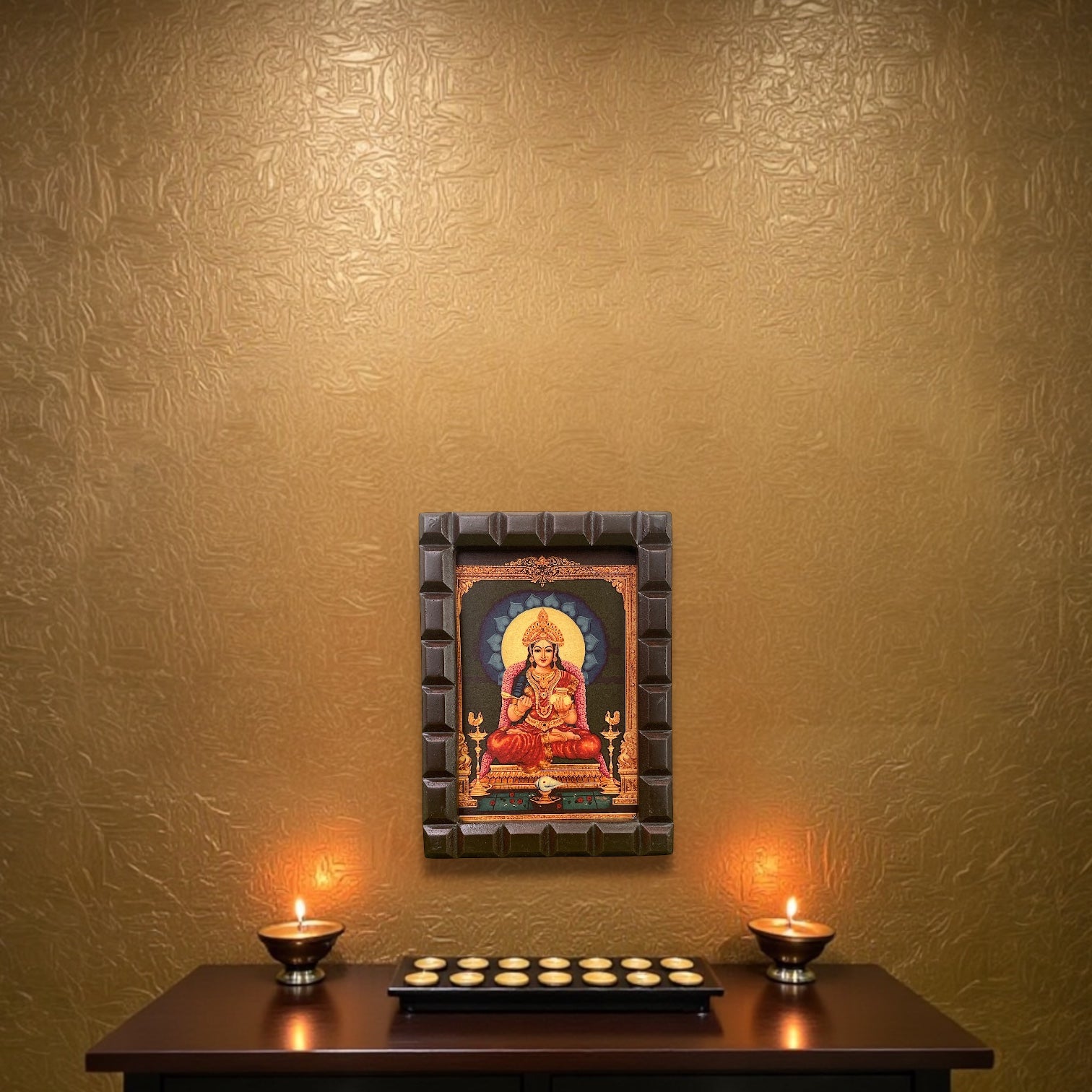 The Annapurna wooden frame, featuring the Hindu Goddess Annapurna, symbolizes nourishment and abundance. Annapurna is revered as the goddess of food and sustenance for her divine provision of nourishment to humanity. A beautifully crafted wooden frame depicting Annapurna adds an aesthetic and spiritual element to any space and invokes blessings of prosperity and well-being. This frame serves as a reminder of the importance of gratitude and sharing in ensuring abundance for all.