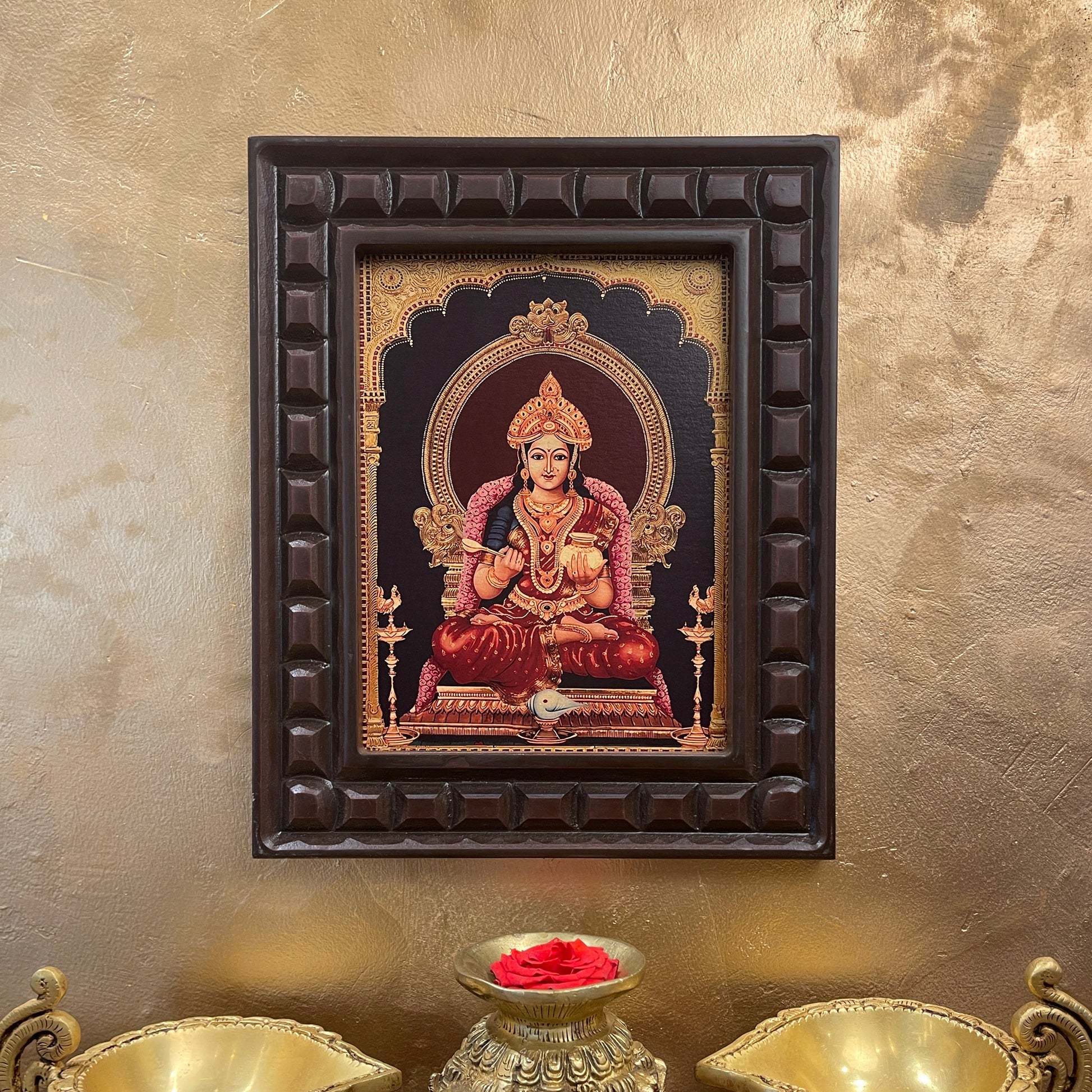The artwork is set in a hand-carved wooden frame, giving it a premium and authentic temple-style look. Displayed with warm lighting and traditional brass décor, this frame instantly elevates the spiritual ambience of your pooja room, home temple, kitchen altar, meditation corner, or sacred space.