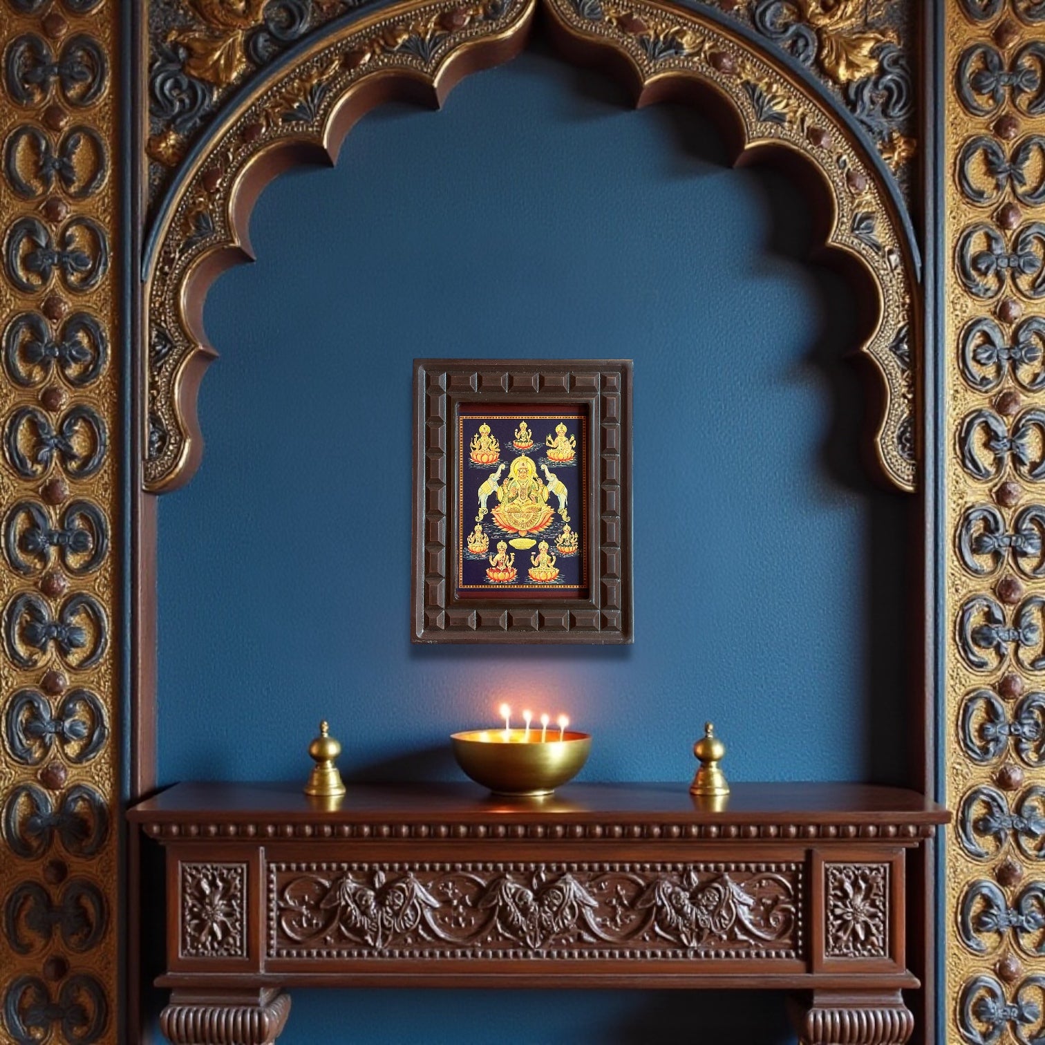 Introducing our Exquisite Asta Lakshmi Frame, Ashta Lakshmi or the eight forms of the goddess Lakshmi, represent various aspects of prosperity and well-being. Each form—Adi Lakshmi, Dhana Lakshmi, Dhanya Lakshmi, Gaja Lakshmi, Santana Lakshmi, Veera Lakshmi, Vidya Lakshmi, and Vijaya Lakshmi—symbolizes different blessings such as wealth, knowledge, courage, and victory. Worshipped together, Ashta Lakshmi is believed to bestow a complete and balanced life, encompassing both material and spiritual riches. Devotees revere Ashta Lakshmi for a prosperous, harmonious, and fulfilling life.