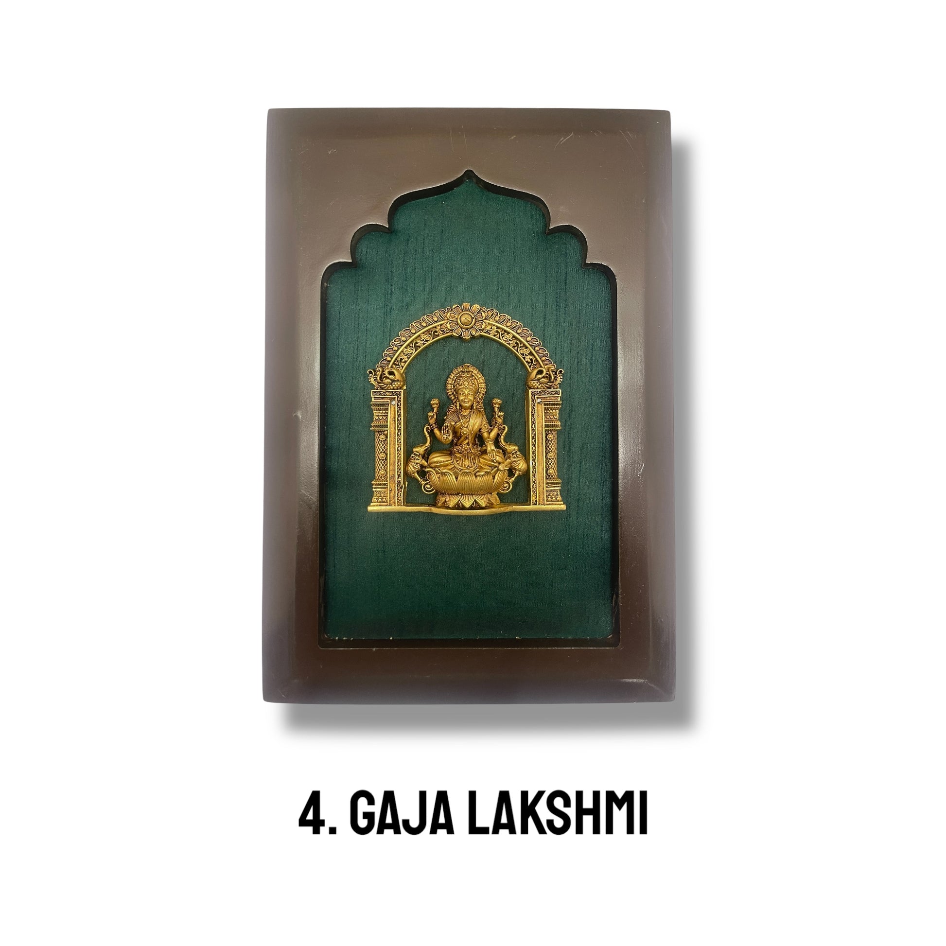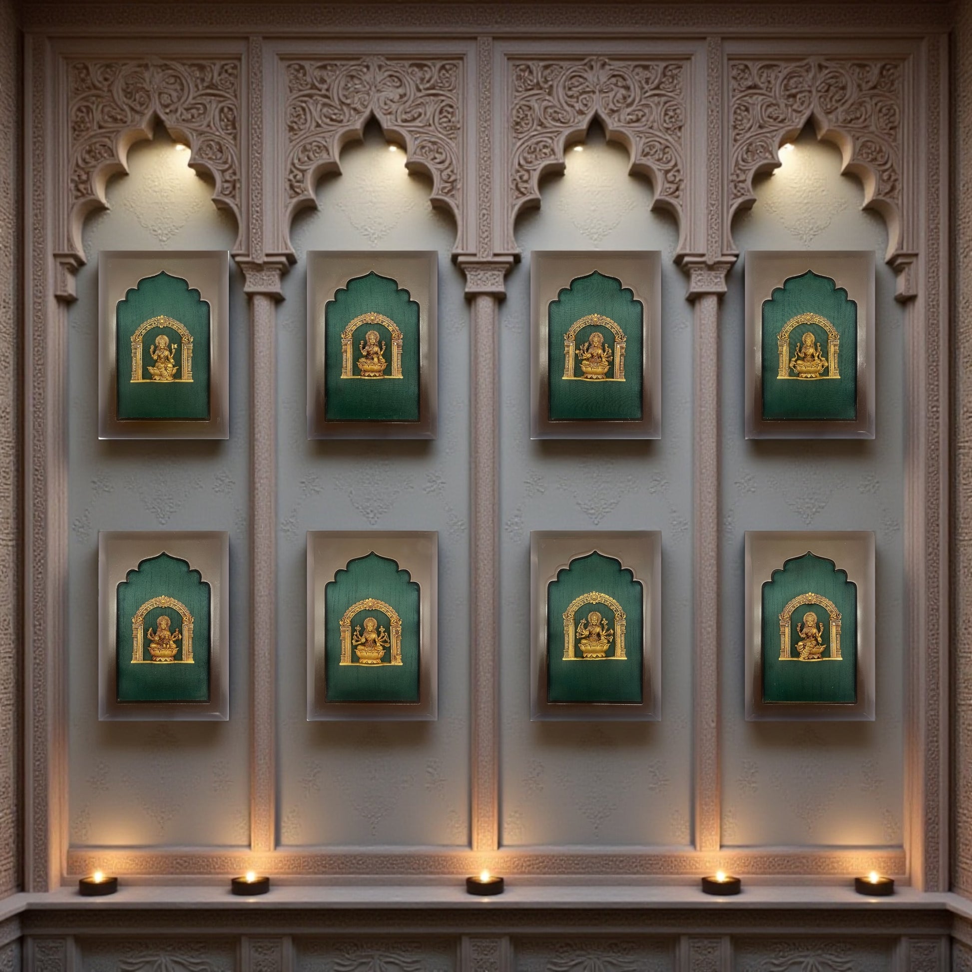 Each piece is mounted on a luxurious Rama Green silk backdrop and encased in a premium wooden frame with a traditional temple-arch design, highlighting the intricate craftsmanship and golden detailing.