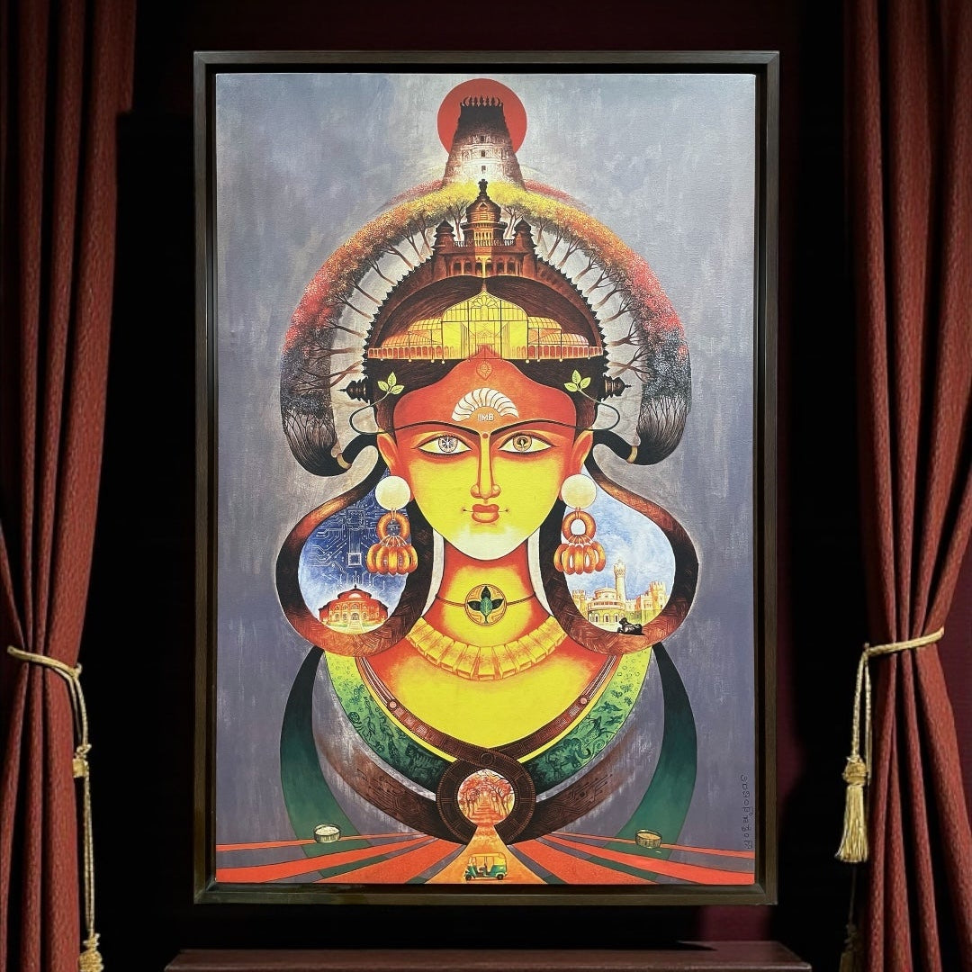 This artwork reimagines Bengaluru as a divine form — a vibrant goddess embodying the city’s landmarks, culture, and spirit.