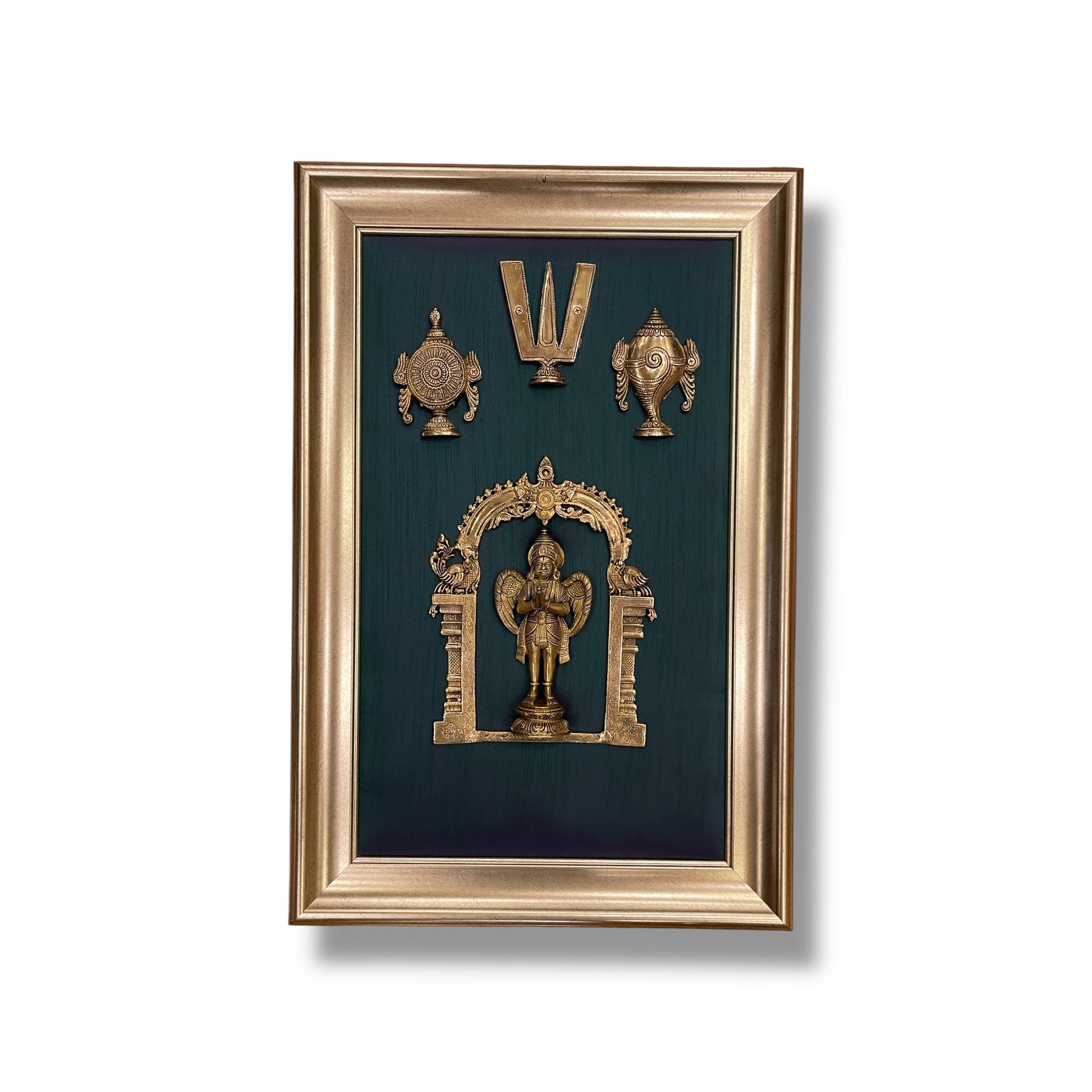 Brass Garuda Devata with Shanku Chakra Namman on Rama Green Silk in Antique Gold Frame