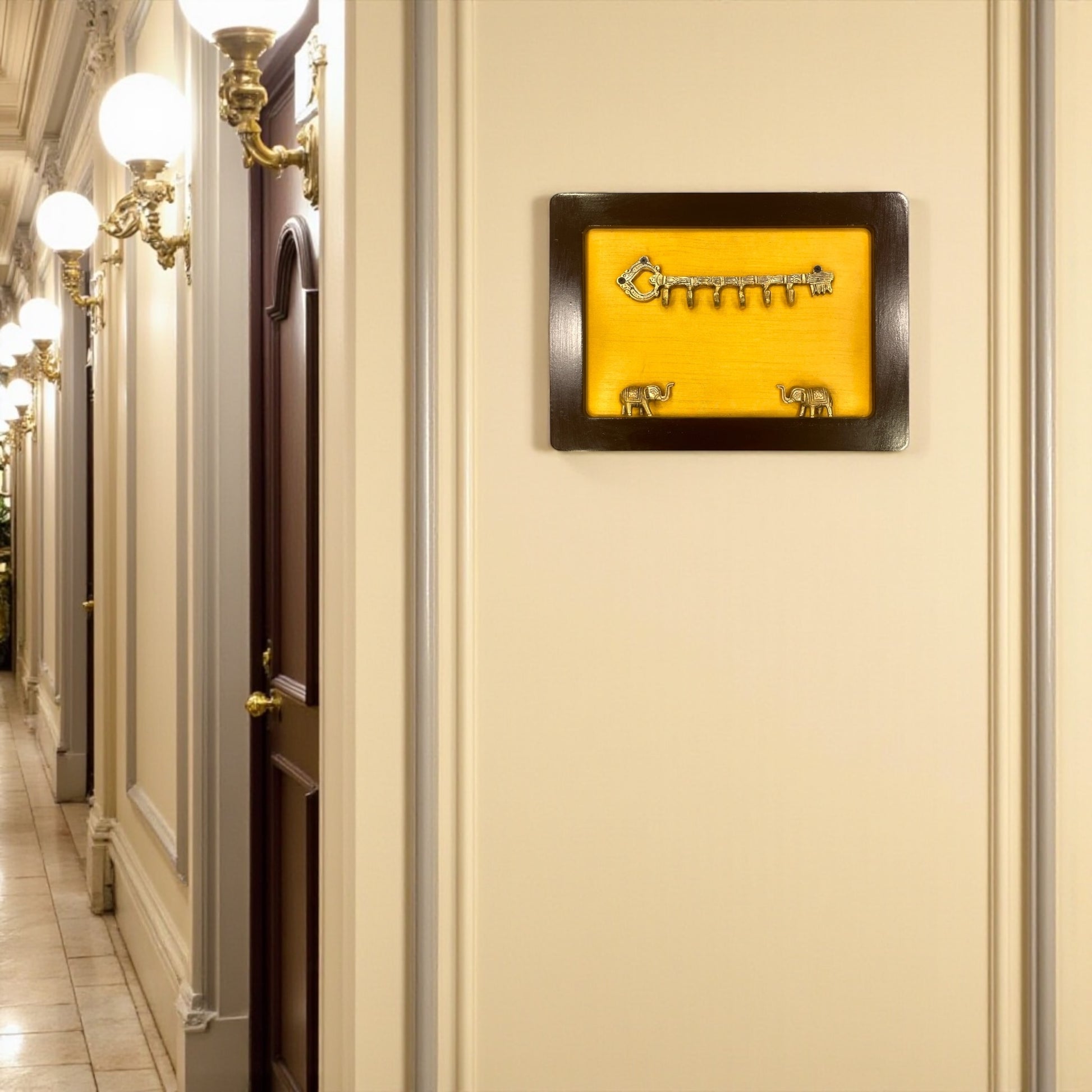 Brass Key Hanger with Elephants on Golden Silk in Wooden Frame