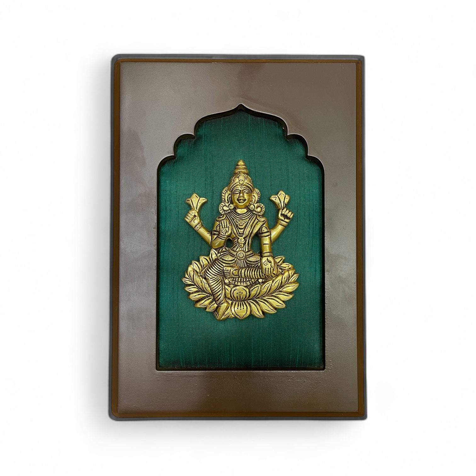 Invite wealth, prosperity, and positivity into your space with our Brass Lakshmi with Green Silk Backdrop. Handcrafted in pure brass, this elegant frame showcases Goddess Lakshmi, the deity of abundance and good fortune, seated gracefully against a serene green silk background that symbolizes growth and harmony. Perfect for home décor, offices, or gifting, this piece adds a divine and luxurious touch to any setting while radiating auspicious energy and grace.