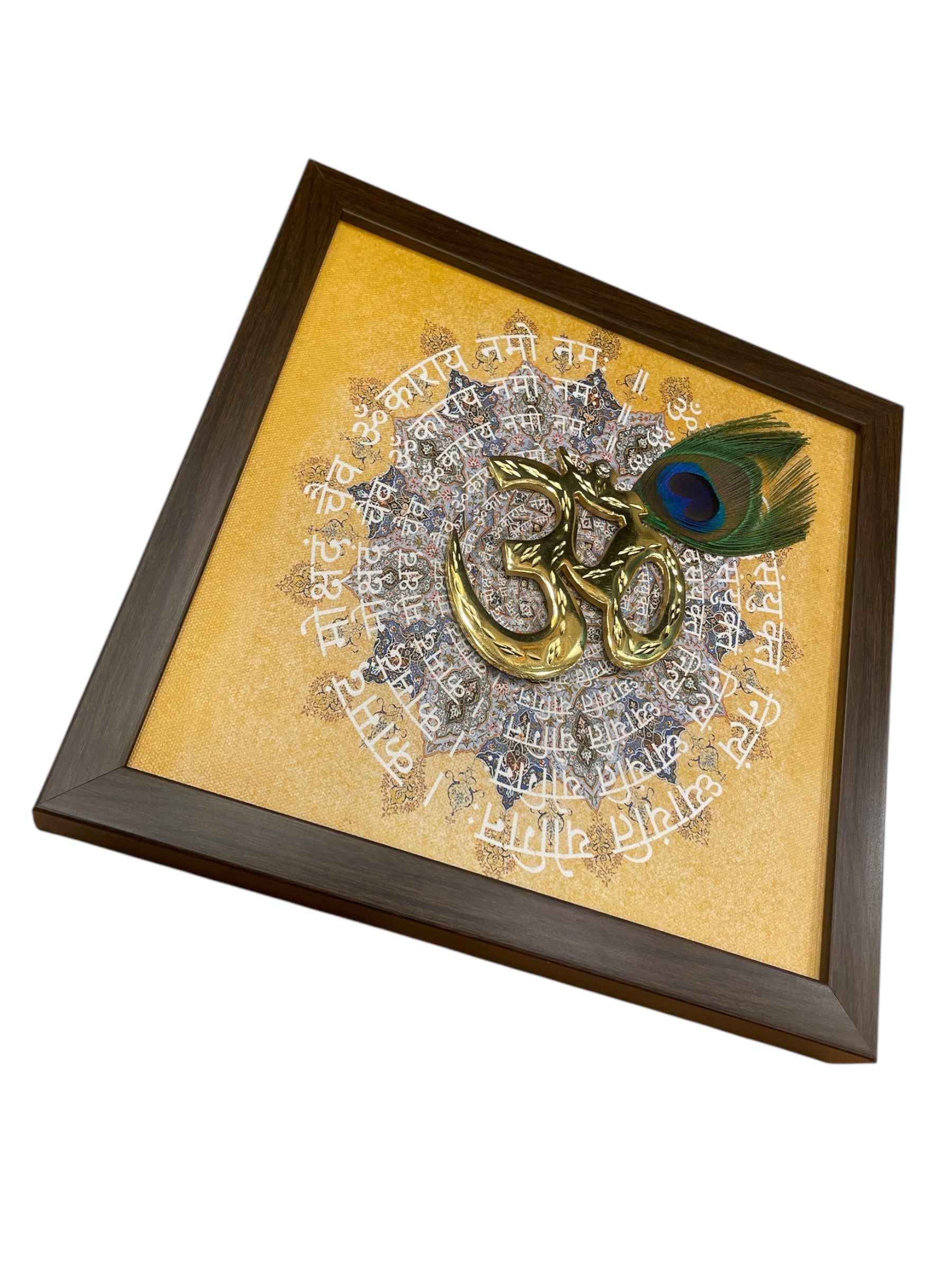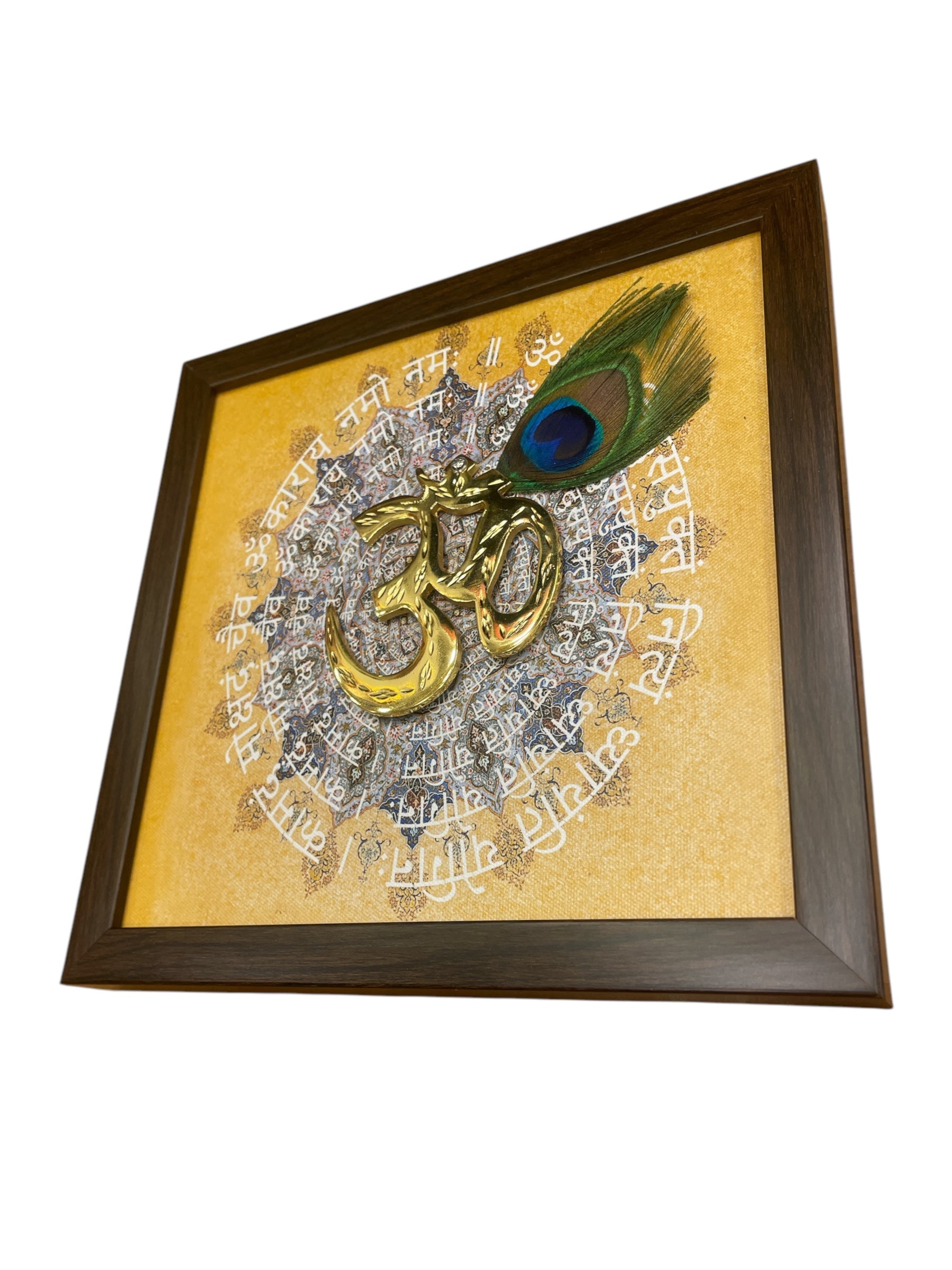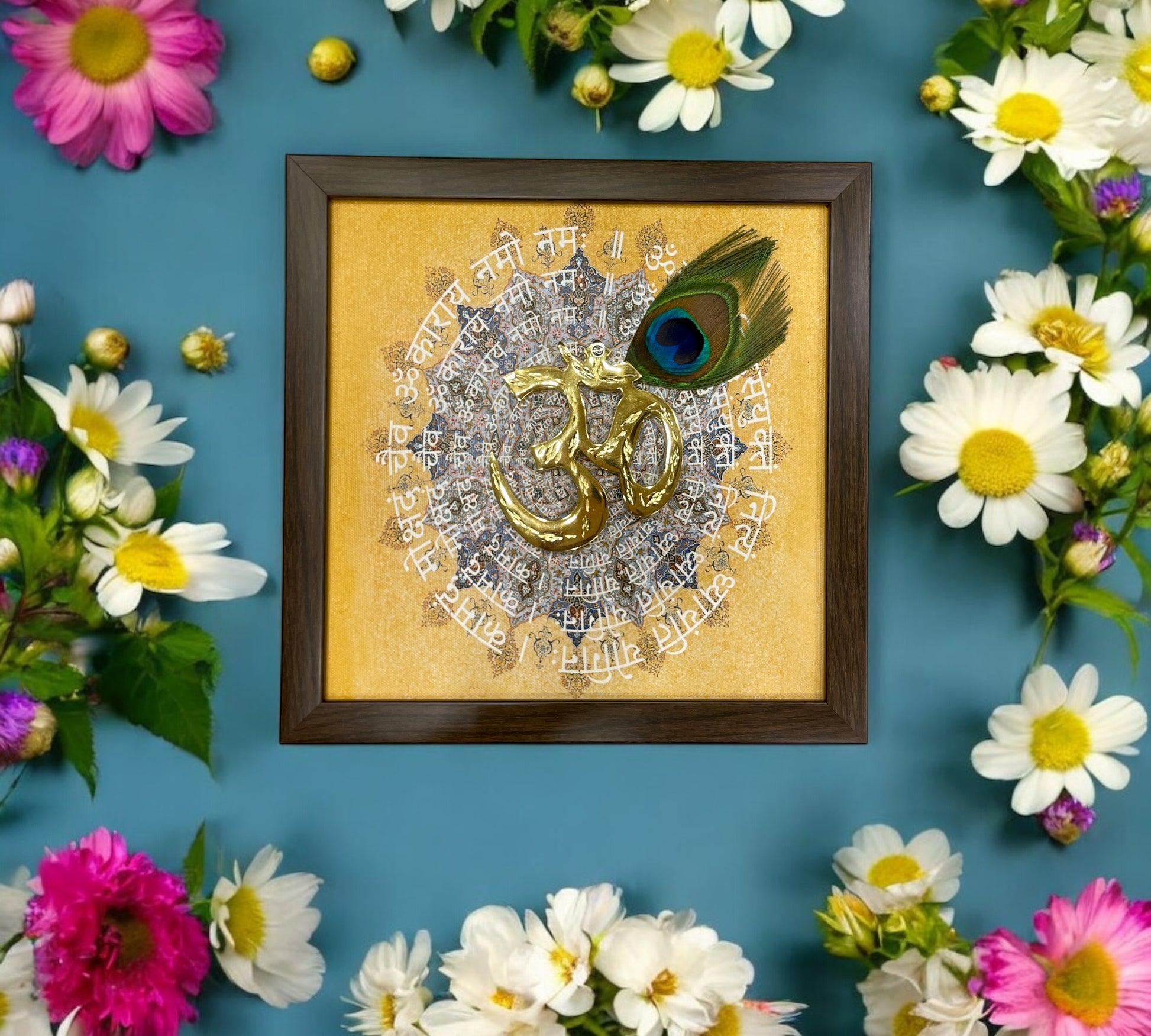 Brass Om with Peacock Feather & Omkara Mantra in Brown frame