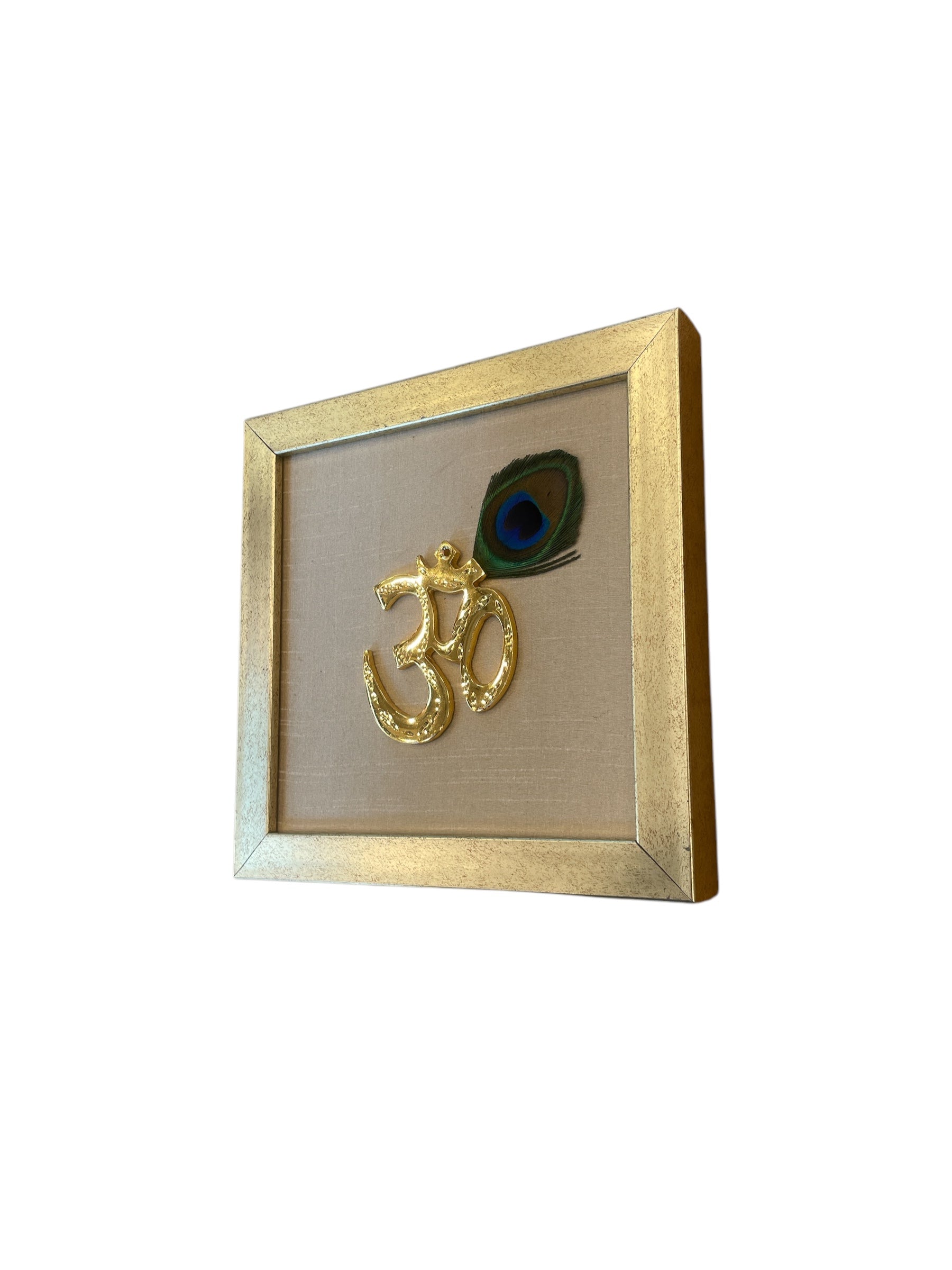 Brass Om with peacock Feather& white silk in Antique gold frame
