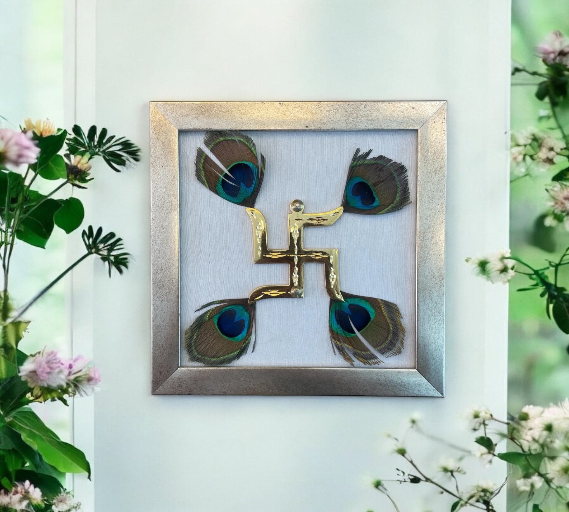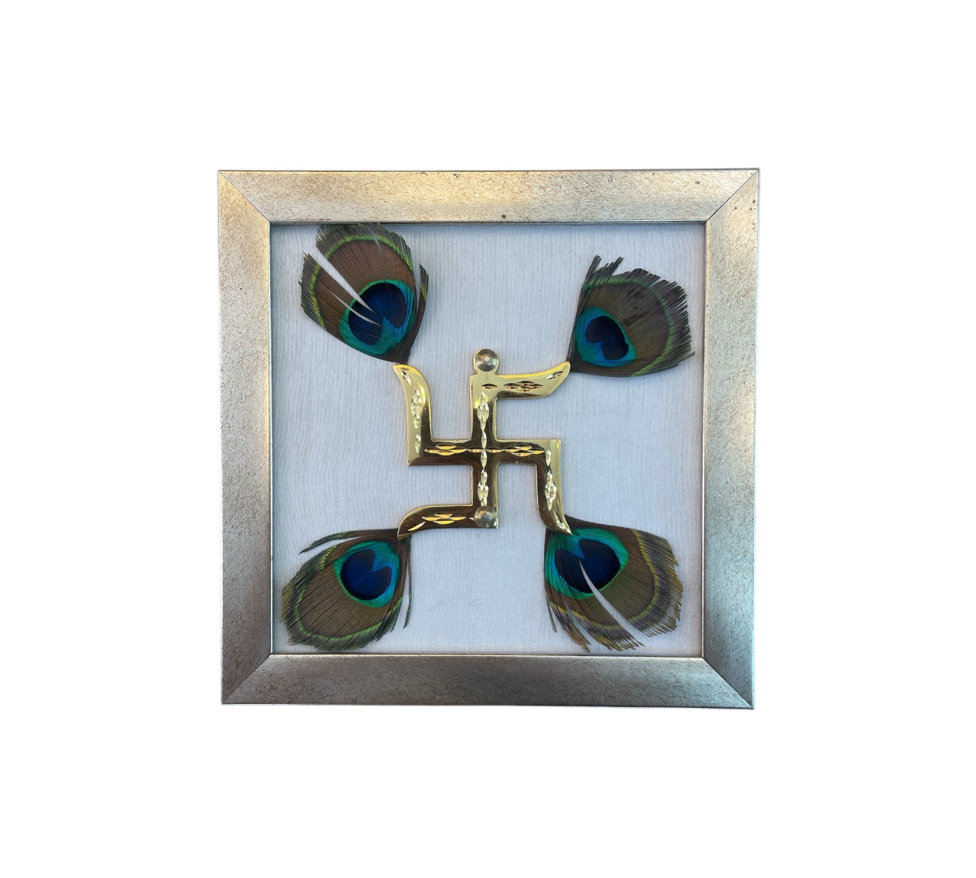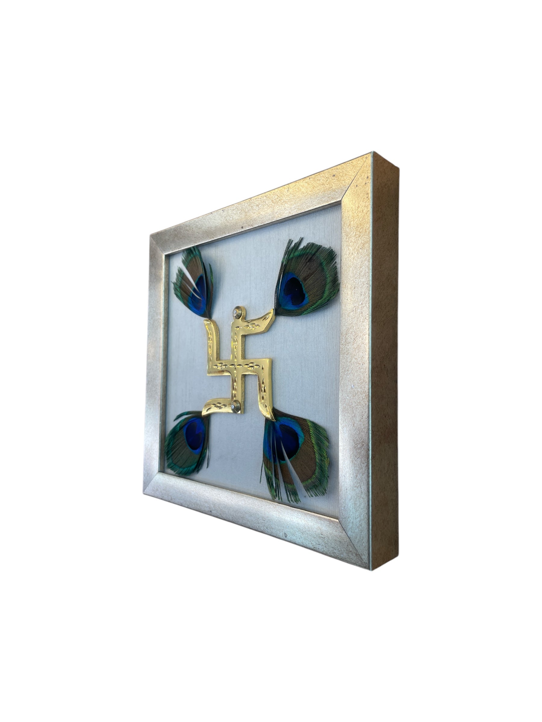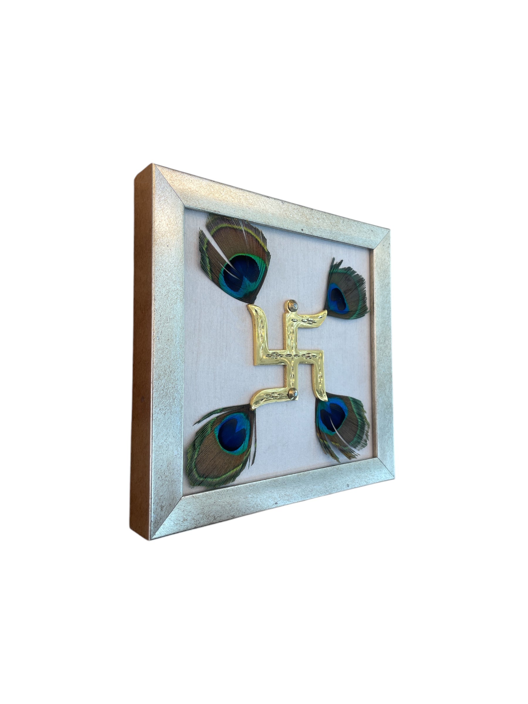 Brass Swastik with Peacock Feather and White silk in antique gold Frame