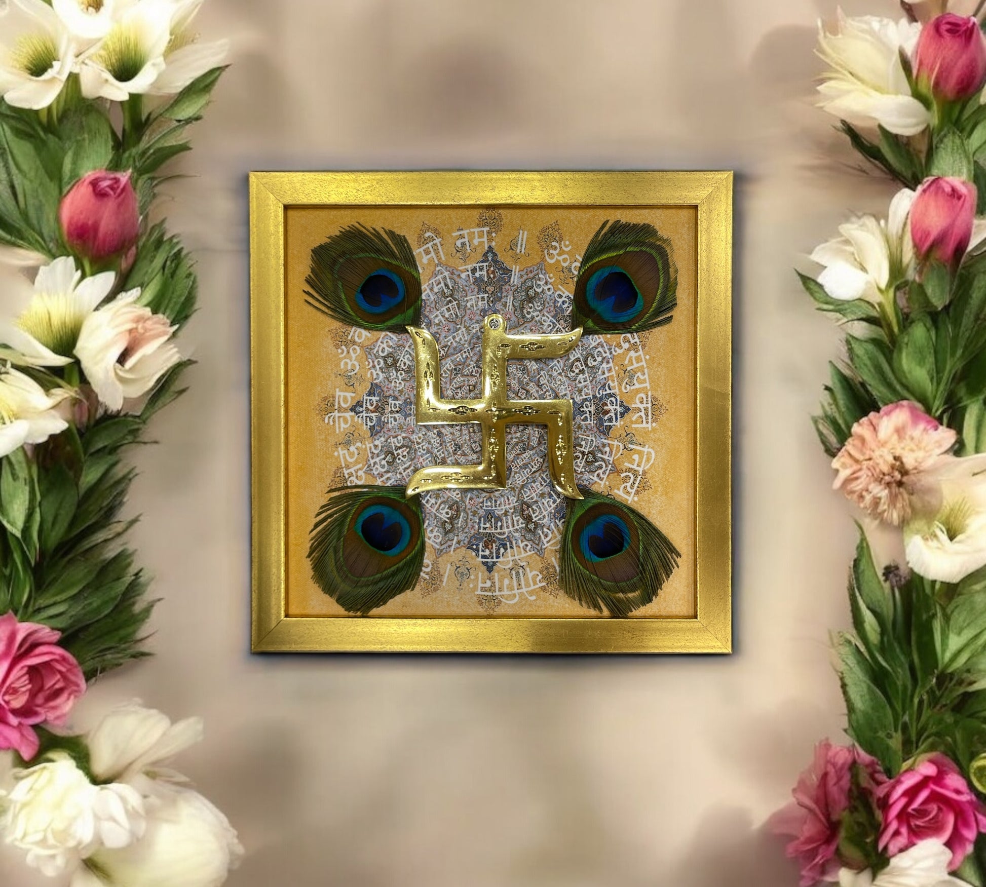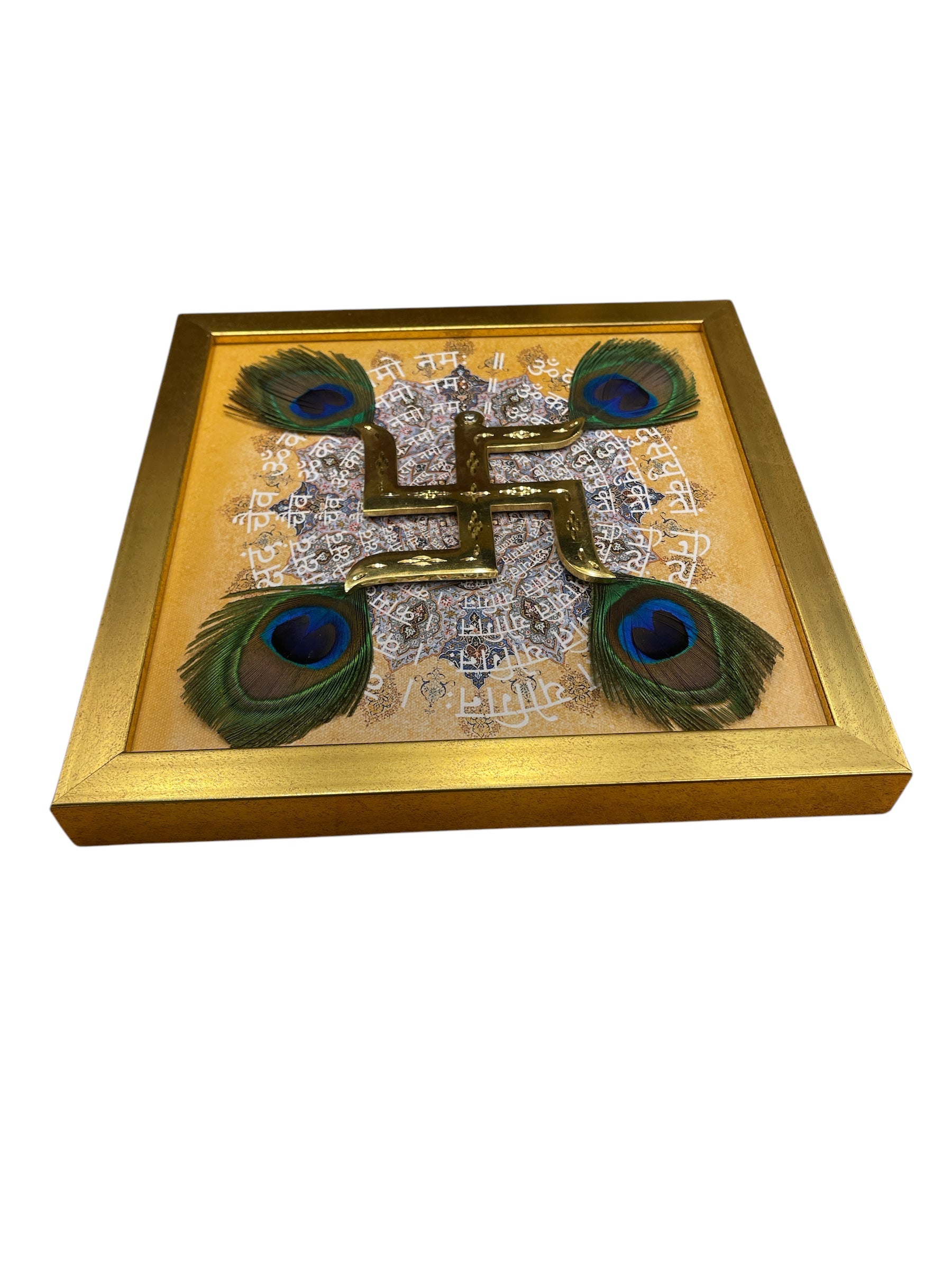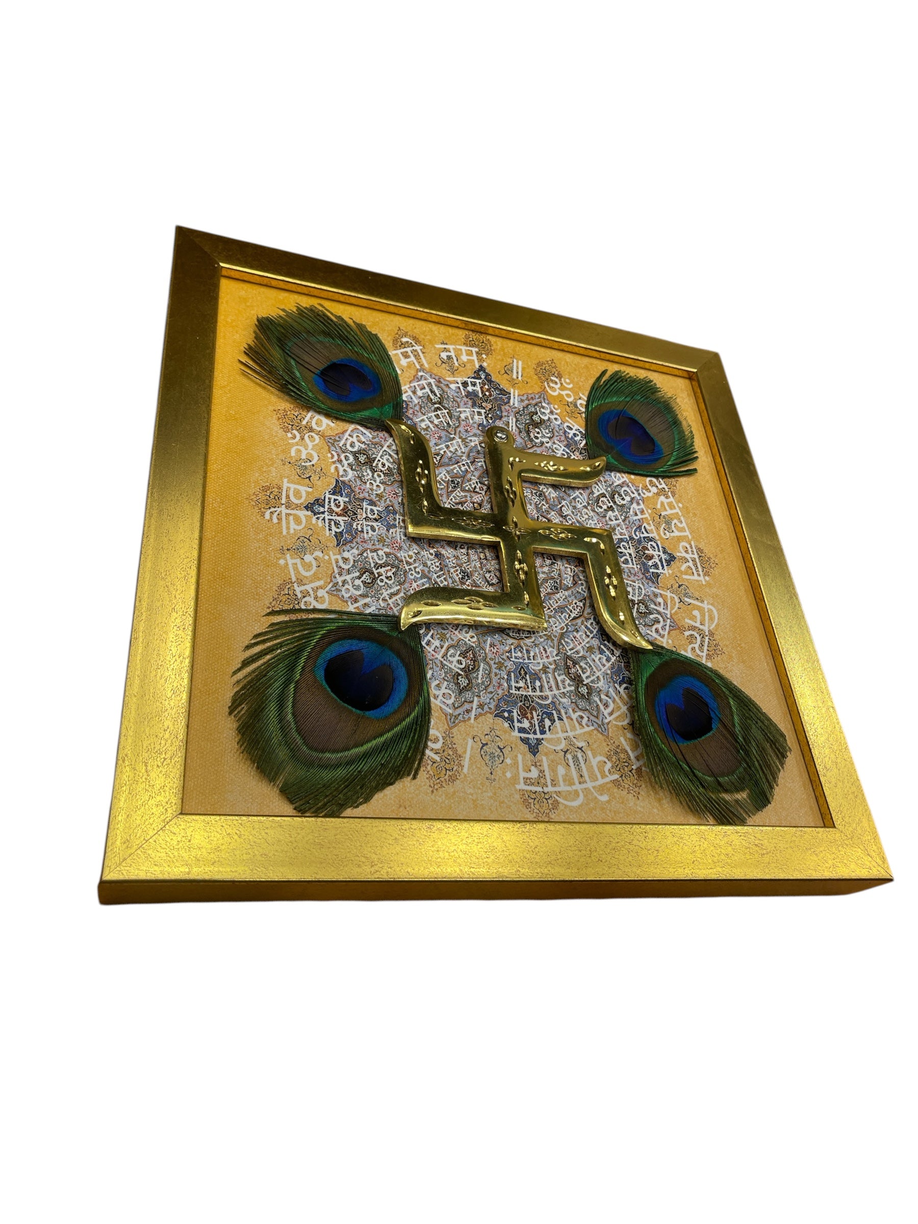 Brass Swastik with Peacock Feather & Omkara Mantram in Gold frame
