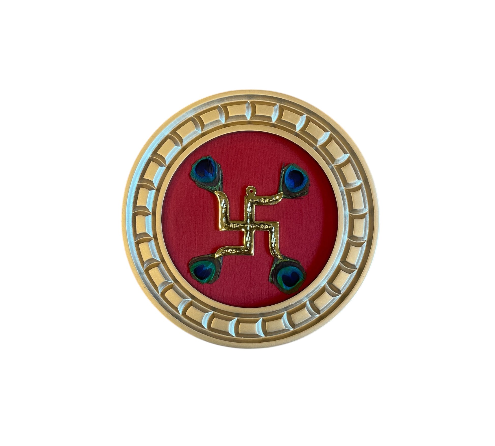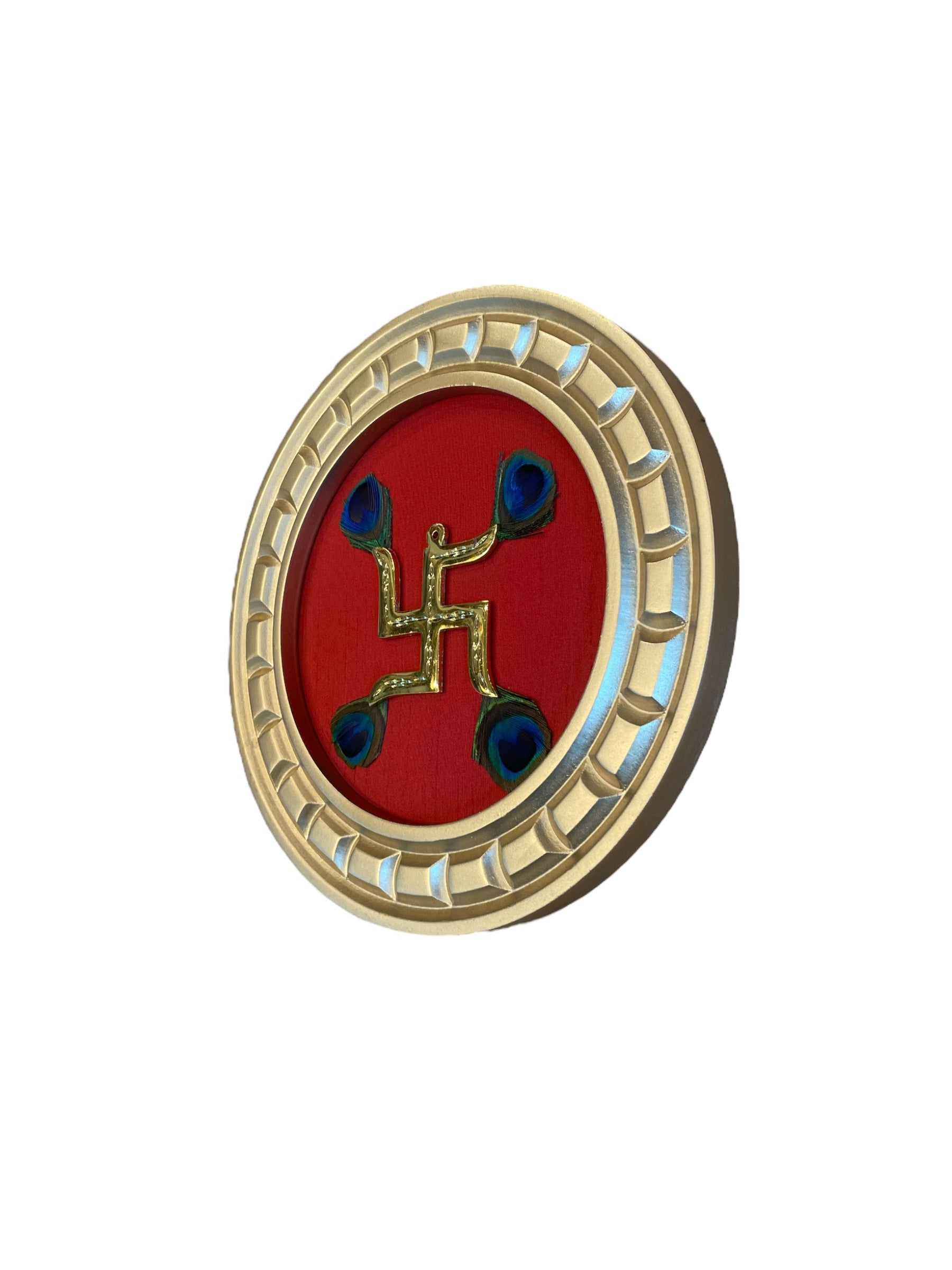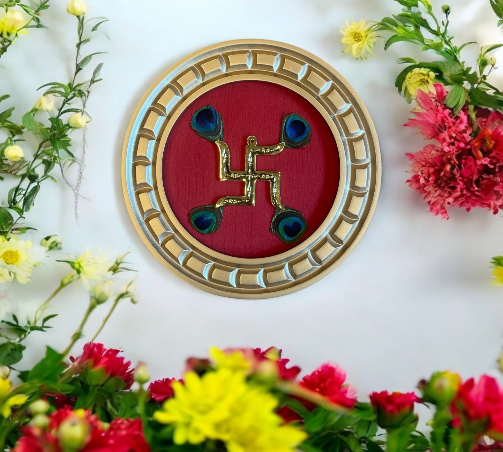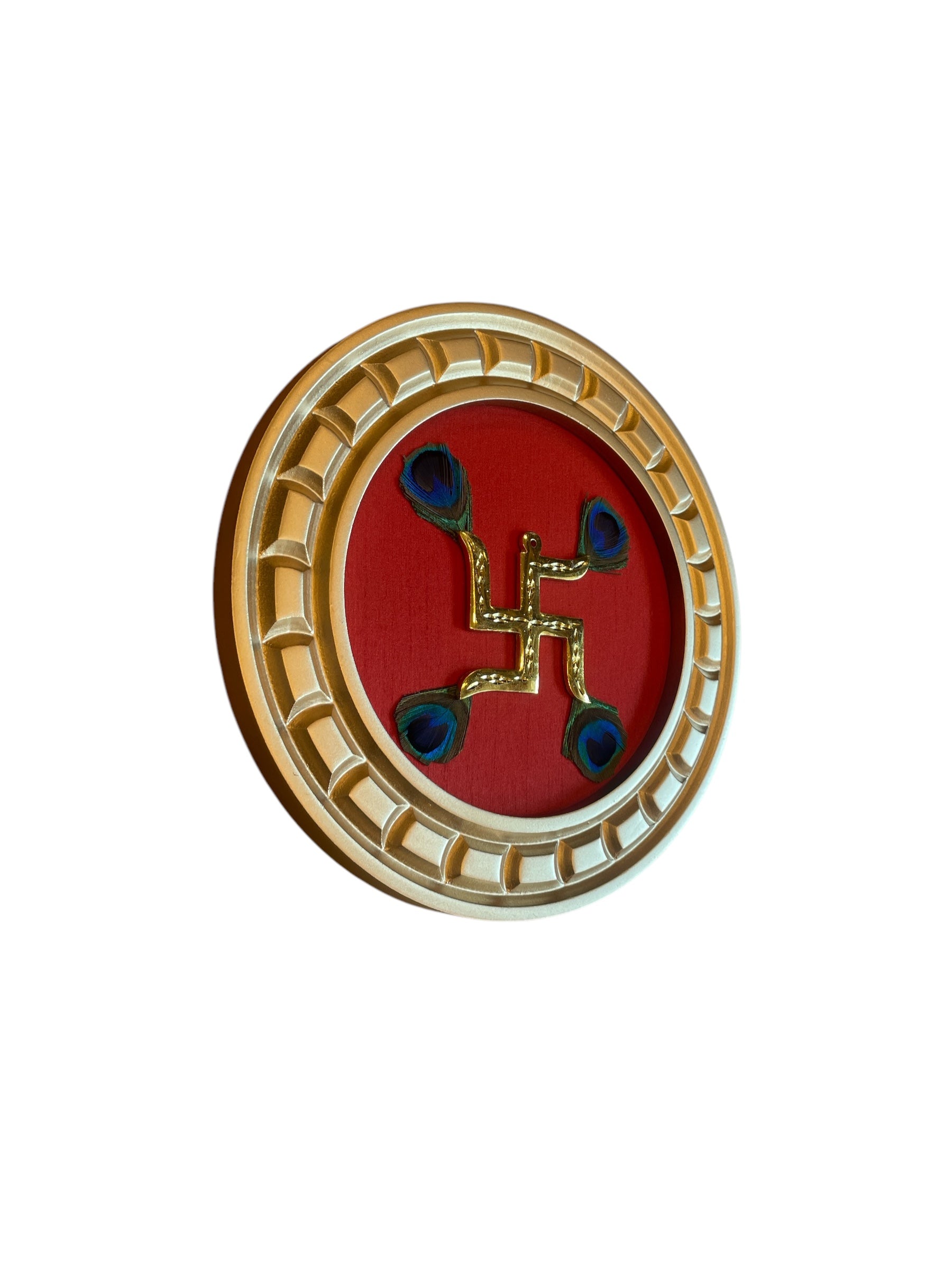 Brass Swastik with peacock Feather & Wine red Backdrop in Gold circular wooden frame