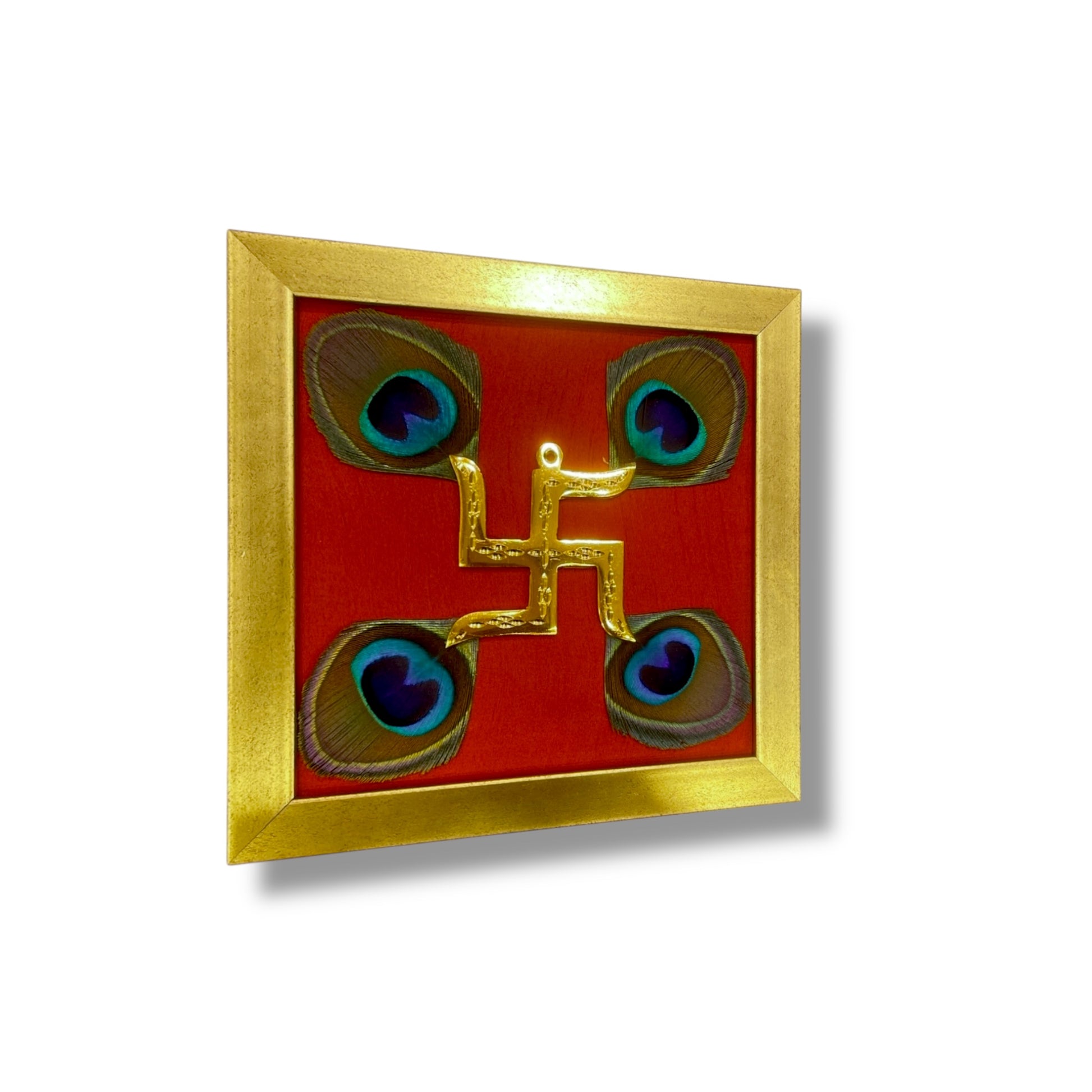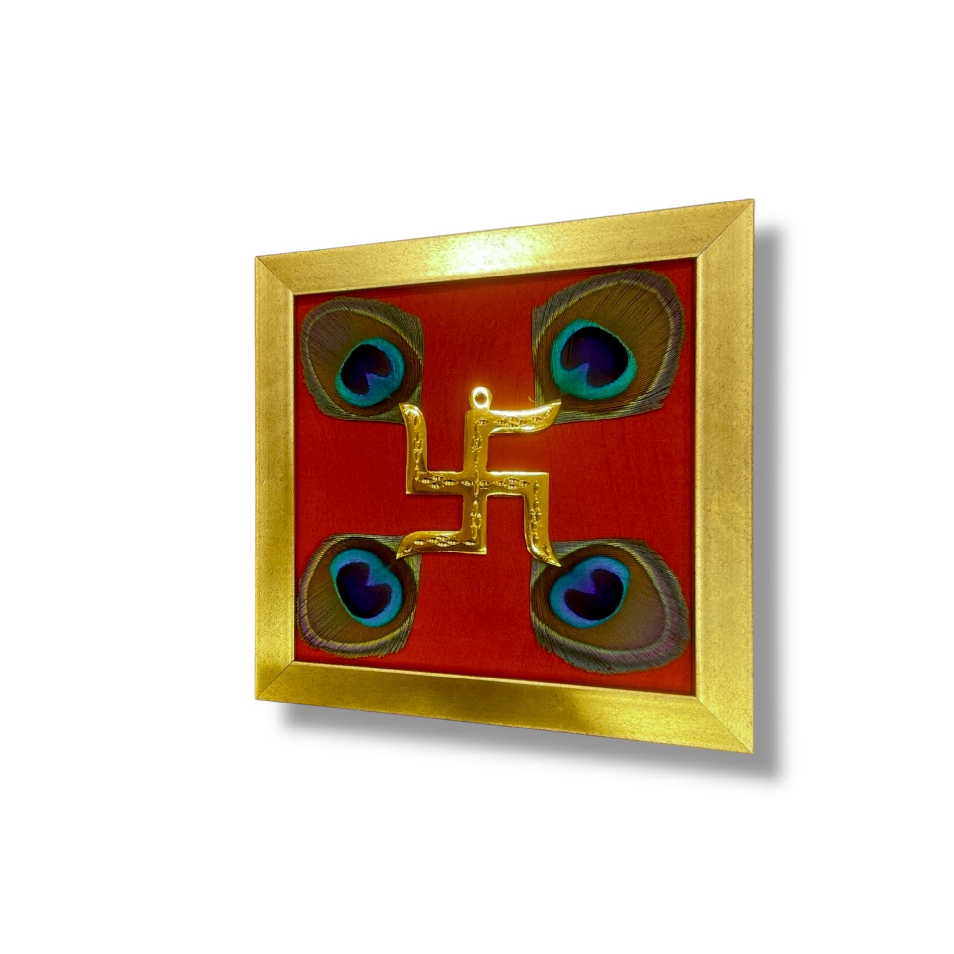 Brass Swastik With Peacock Feathers with Red silk in Gold frame