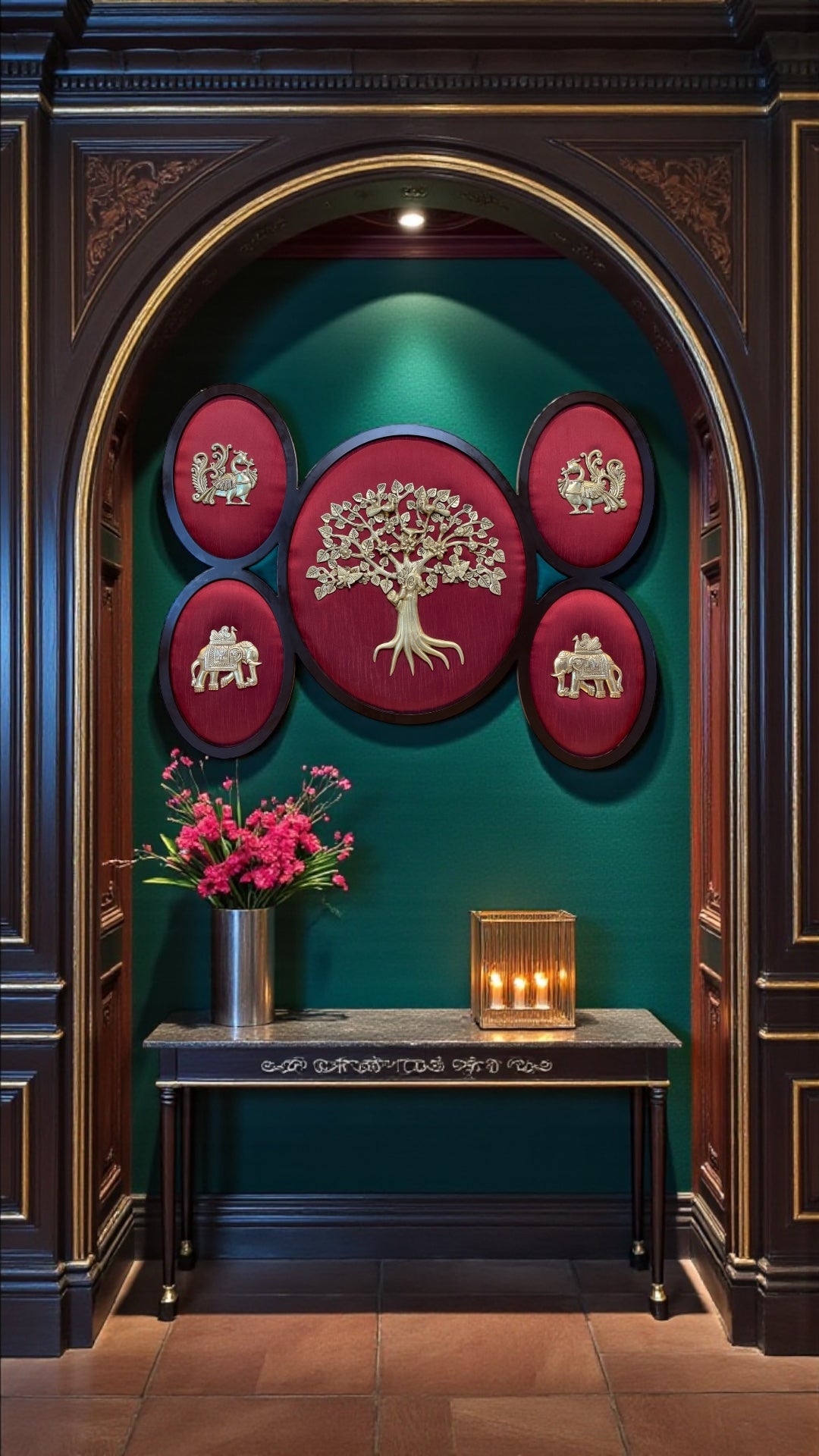Enhance your home with this elegant Brass Wall Art featuring a beautifully crafted Tree of Life centerpiece surrounded by five traditional brass motifs, set against a rich red silk backdrop and finished with a premium wooden frame. Symbolizing growth, strength, prosperity, and protection, this handcrafted décor adds a royal and cultural touch to your living room, pooja space, or entrance. A perfect blend of heritage craftsmanship and modern luxury styling, ideal for home décor and festive gifting.