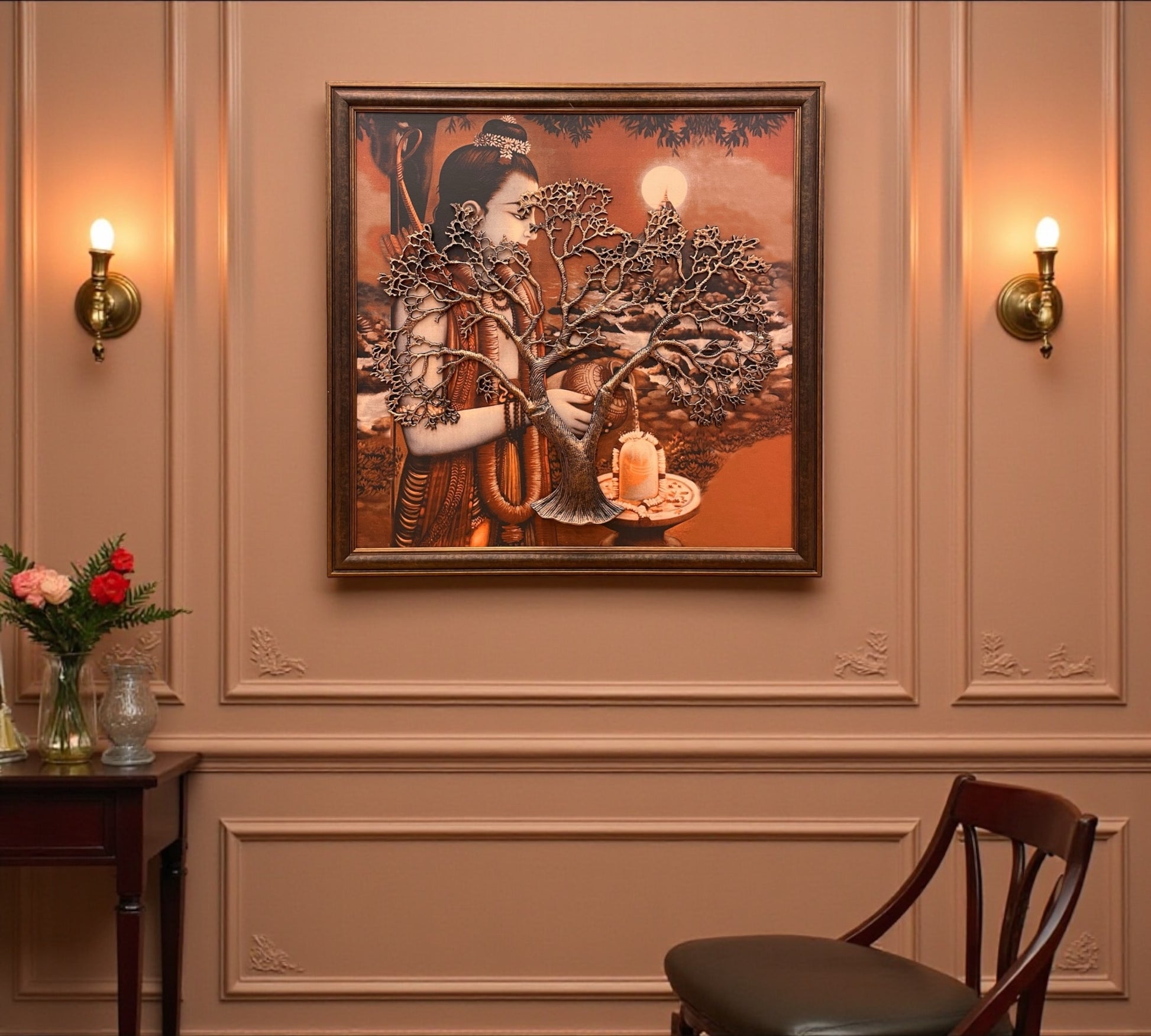 "Divine Arboretum" exudes devotion with a Metal Kalpavriksha Tree Frame featuring a sublime Lord Rama photo print. This artwork melds craftsmanship with divine imagery, creating a sacred focal point. The Metal Kalpavriksha Tree, symbolizing growth and enlightenment, cradles the serene photo of Lord Rama. Encased in an antique gold frame, this masterpiece invites spiritual connection and inspiration, perfect for a shrine, meditation room, or yoga studio, blending elegance and sacred significance.