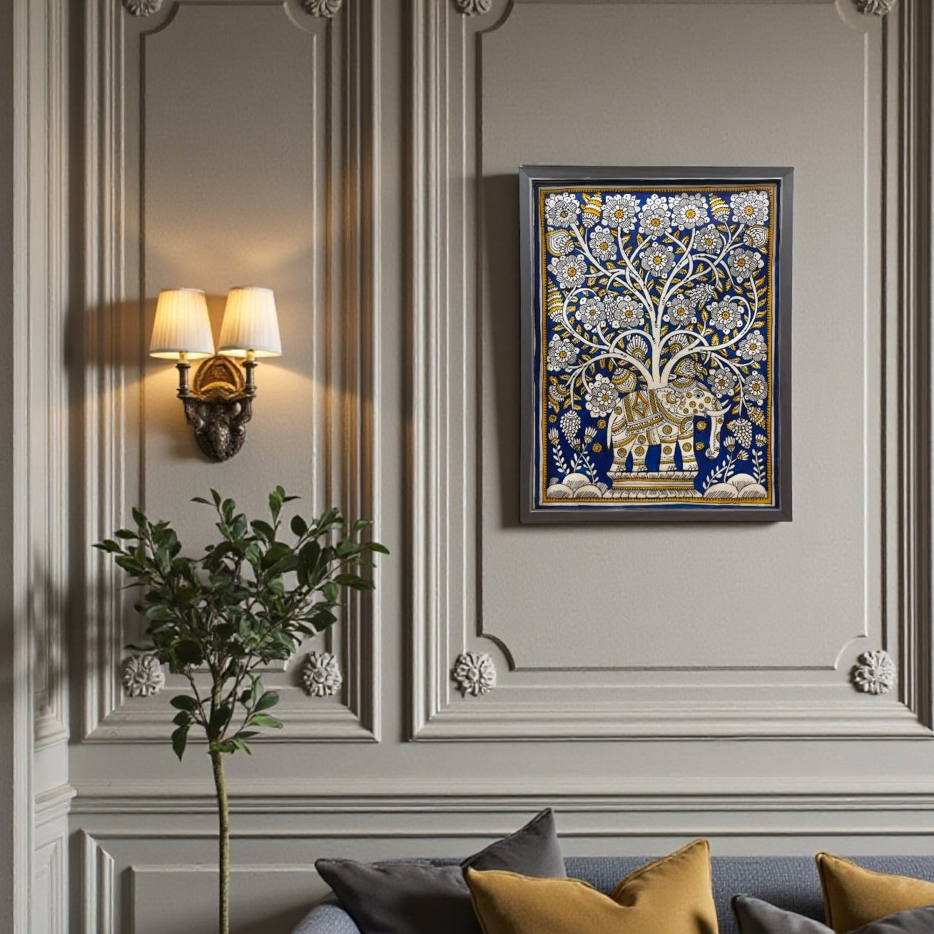 Enhance your home or office décor with this Authentic Handpainted Elephant & Tree Wall Art. Skillfully created by hand, the artwork depicts an elephant beneath a tree, symbolizing wisdom, strength, growth, and prosperity. Encased in a durable resin frame, it perfectly preserves the intricate hand-painted details while adding a modern and elegant touch. Ideal for living rooms, pooja spaces, or as a meaningful gift for art lovers.