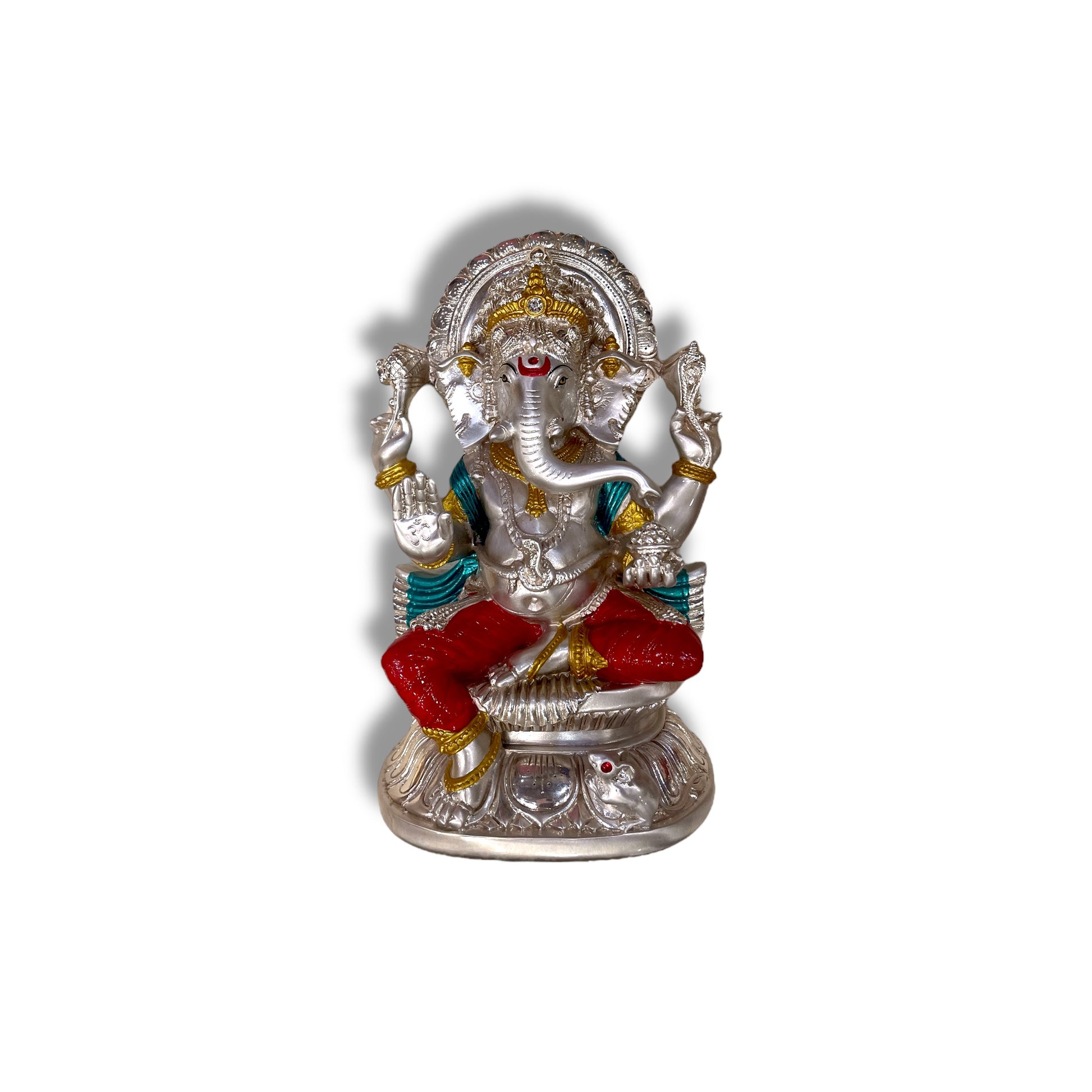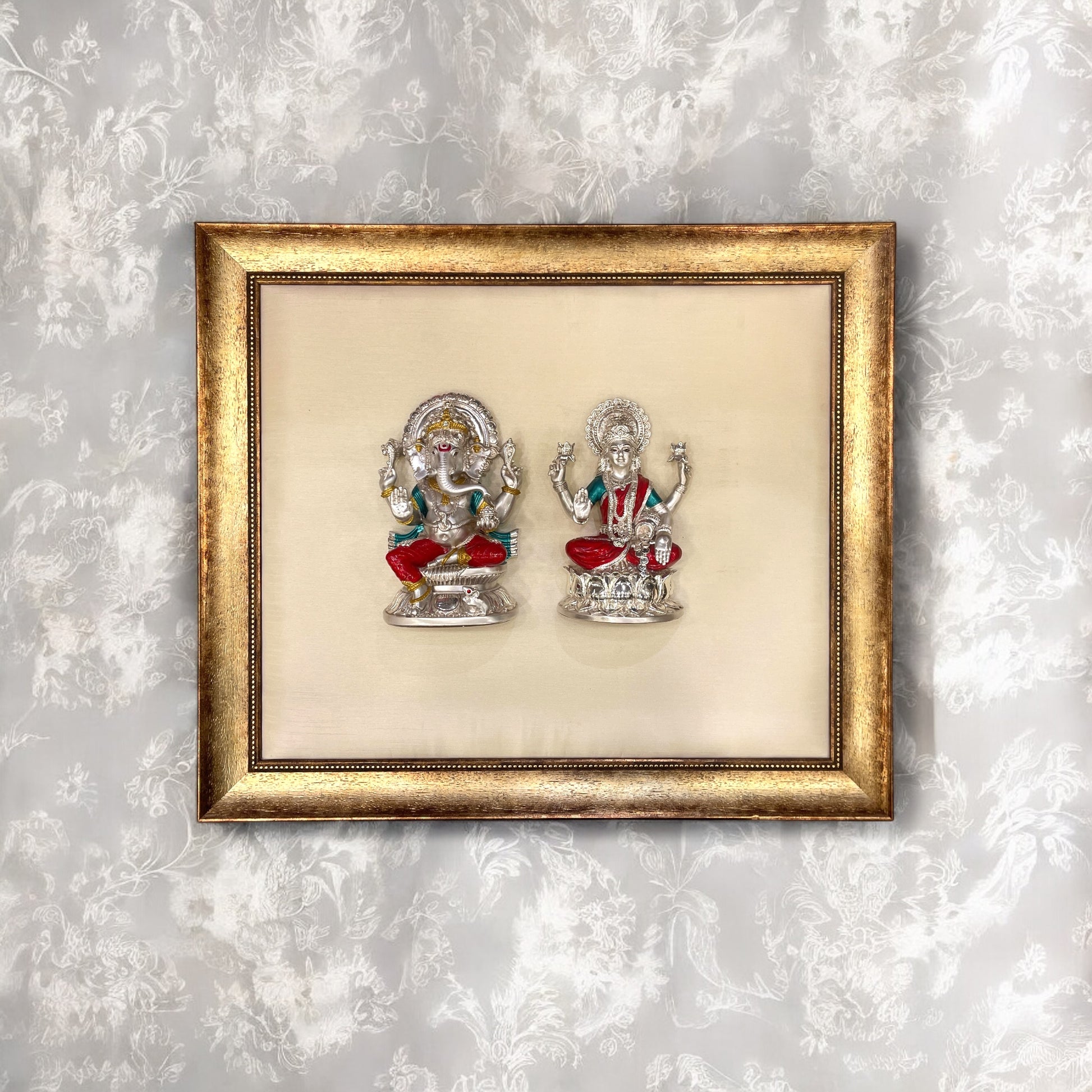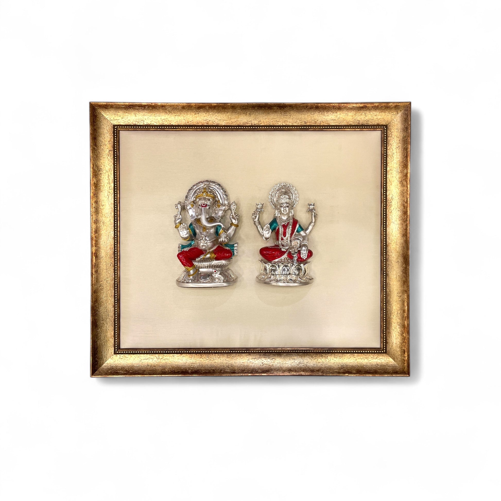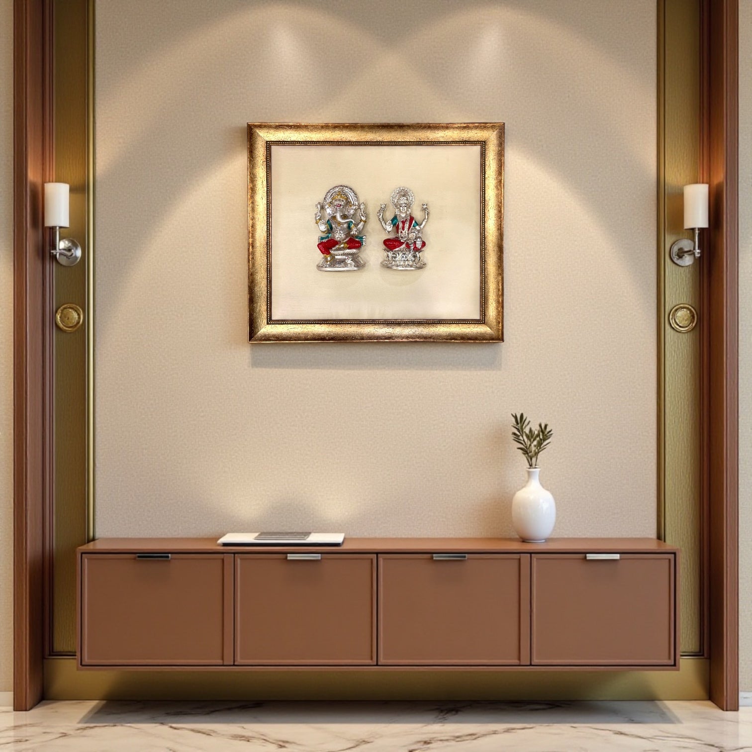 Elevate your décor with this exquisite 92.5 sterling silver Lakshmi Ganesha wall art, set in a luxurious golden frame. Handcrafted with fine detailing, the idols of Goddess Lakshmi, symbolizing wealth and prosperity, and Lord Ganesha, the remover of obstacles, radiate divine blessings and positivity. Perfect for living rooms, pooja rooms, offices, or meditation spaces, this silver wall frame blends tradition with elegance. An auspicious and timeless choice for housewarming, Diwali gifting, weddings, or festive occasions.