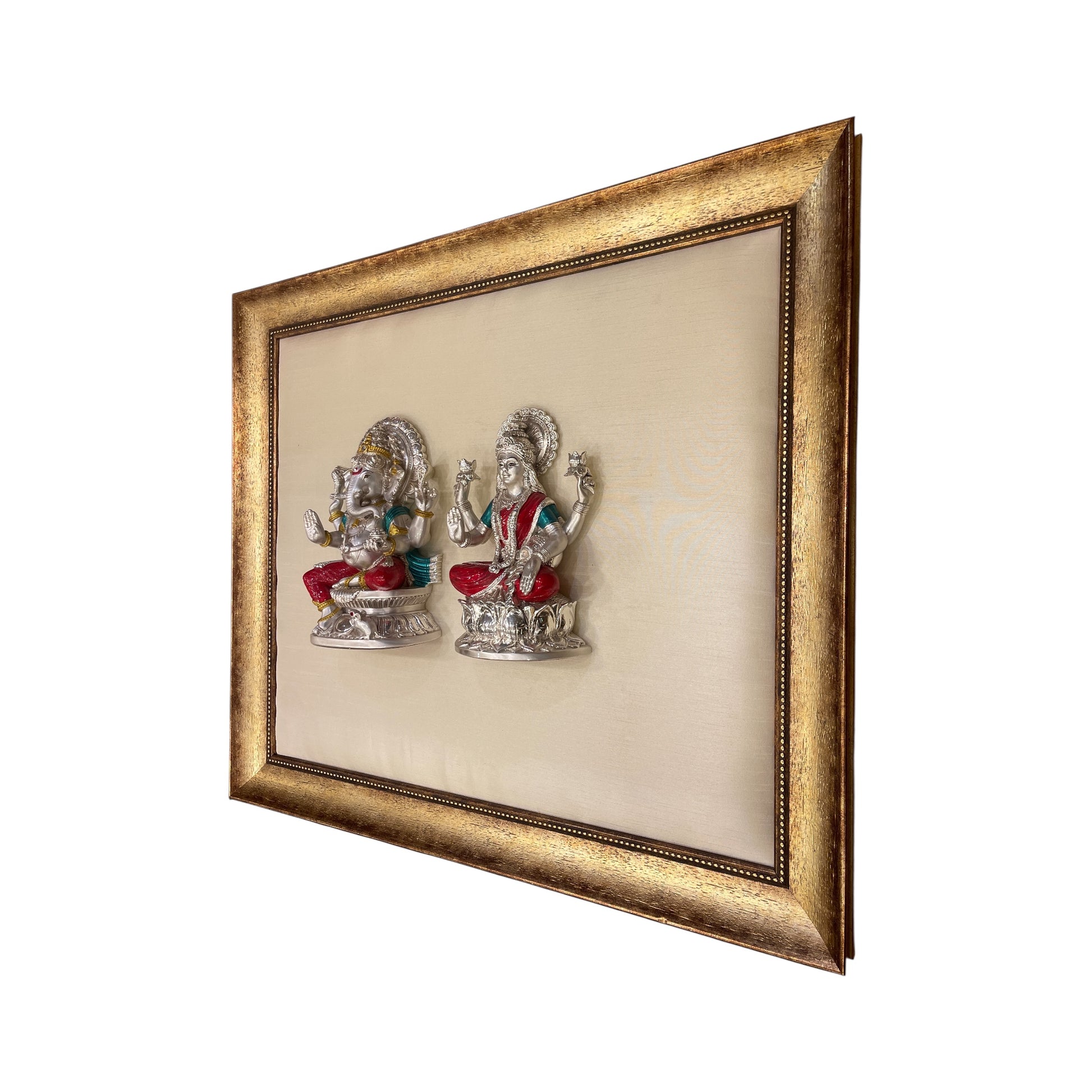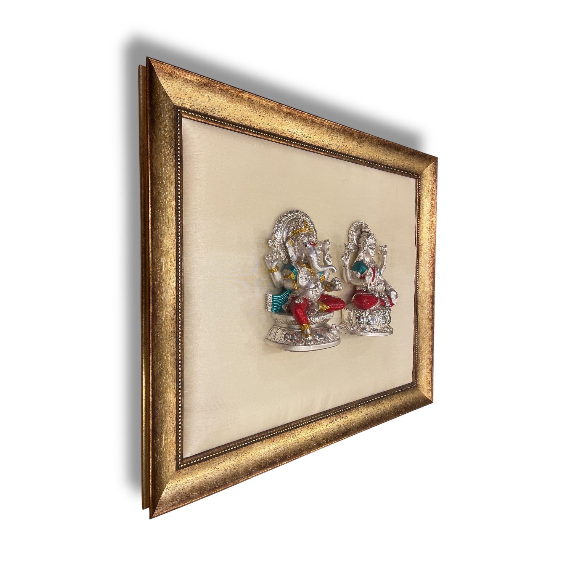 Ganesh Laxmi Silver on White Silk Backdrop in Antique Gold Moulded Frame