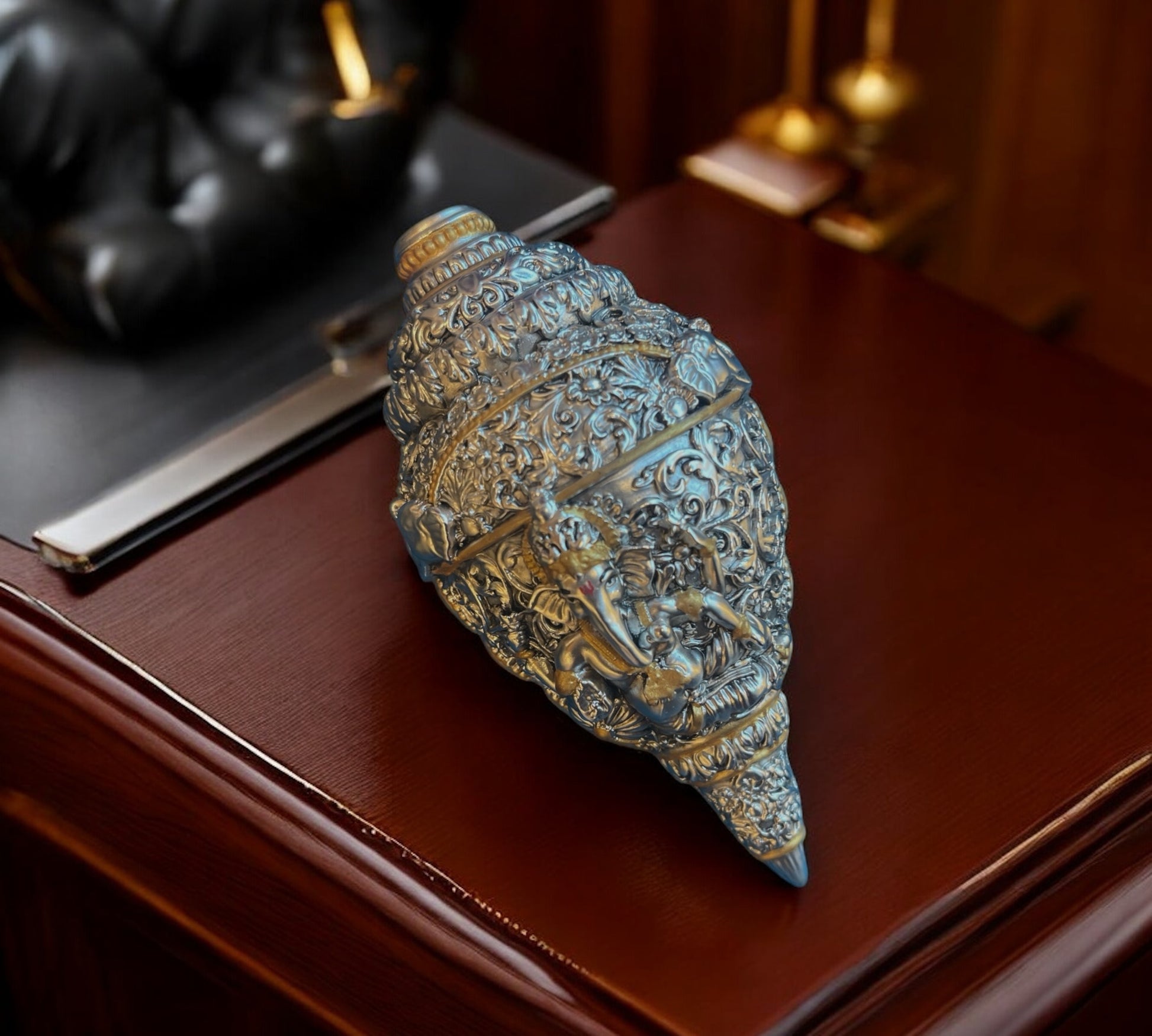 Blending two sacred icons — the shankh (representing the primordial sound Om) and Lord Ganesha — this piece is believed to purify the environment and promote spiritual well-being