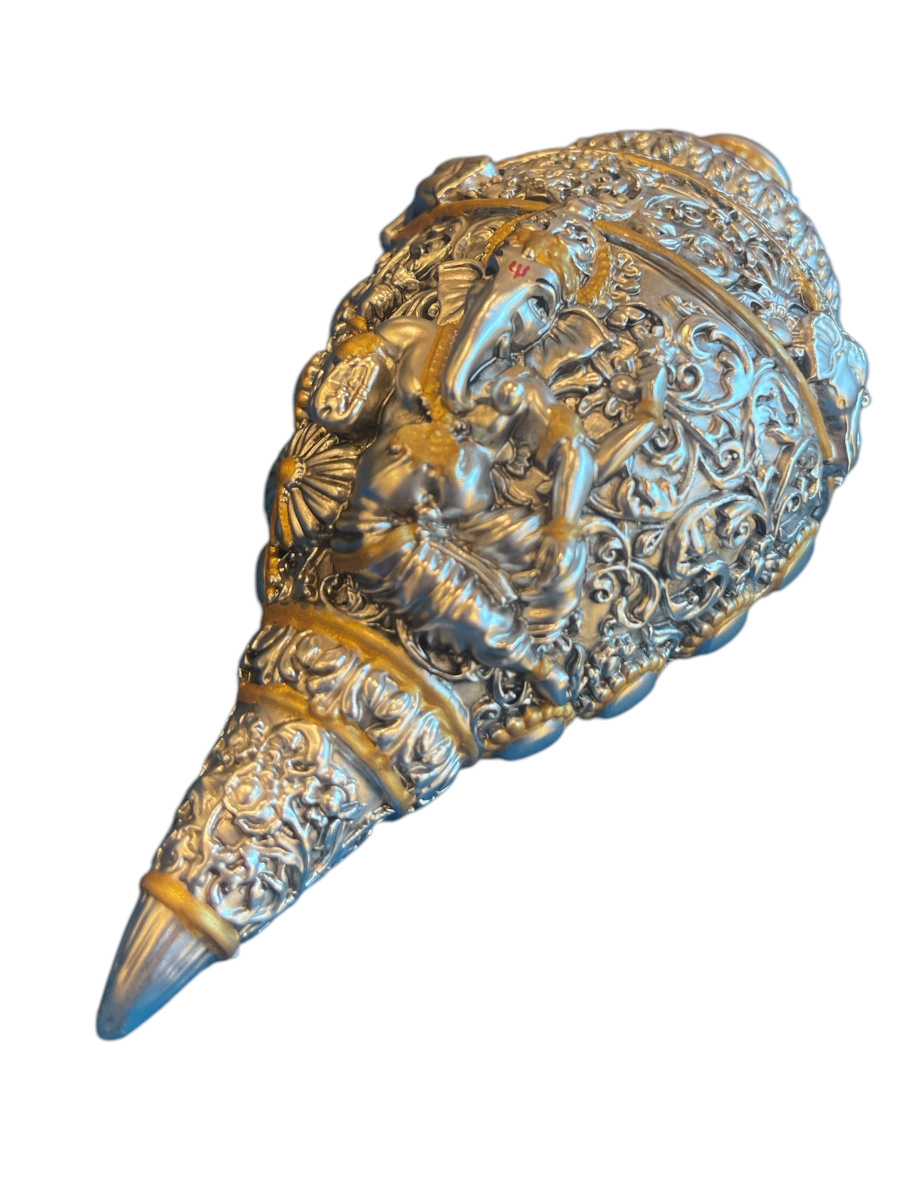 Design: Detailed 3D form of Lord Ganesha engraved into a traditional shankh, surrounded by ornamental motifs