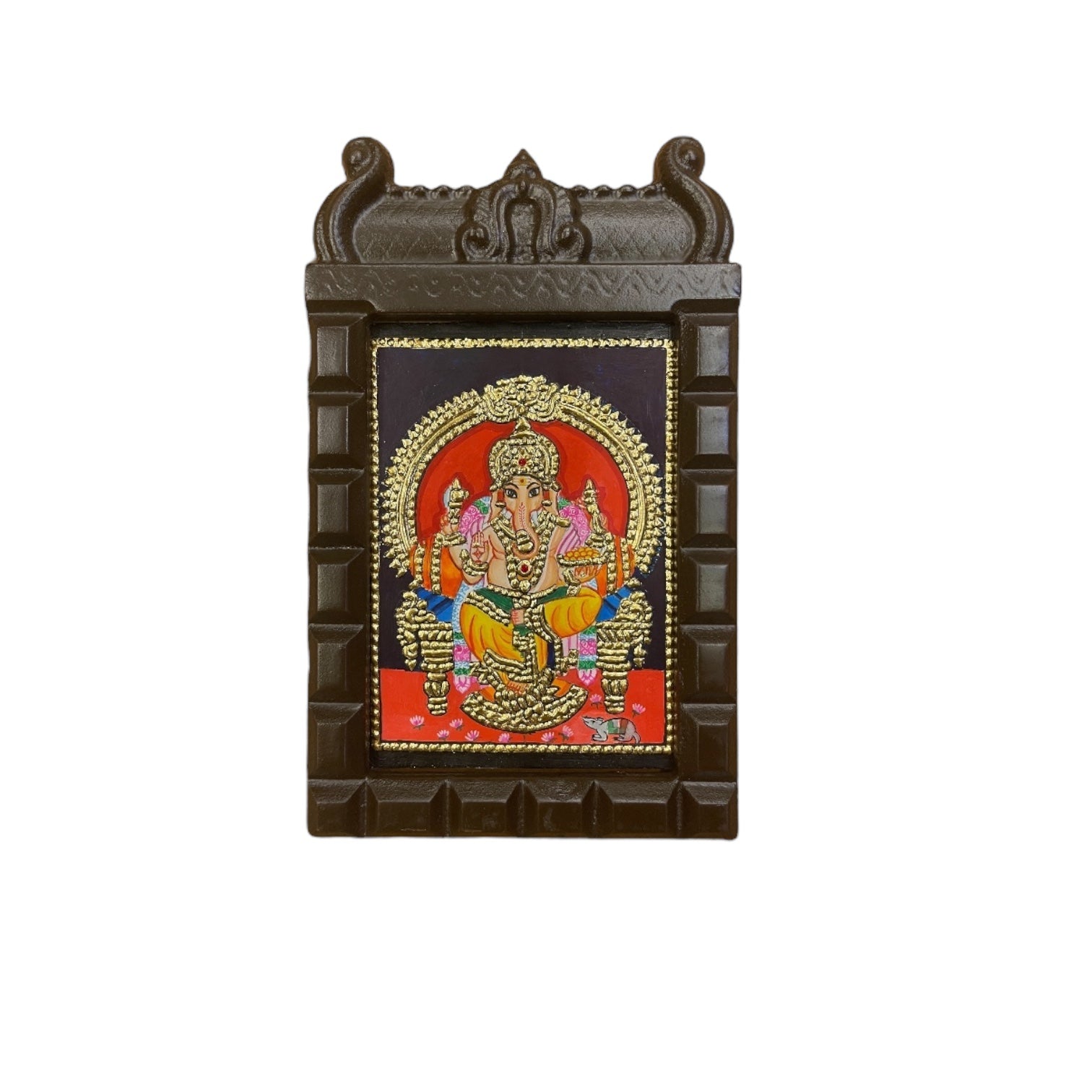 This divine Ganesha Tanjore Painting from Estudio beautifully captures Lord Ganesha, the remover of obstacles and the harbinger of wisdom and prosperity. Crafted in the timeless Tanjore art style, it showcases vibrant colors, intricate detailing, and a traditional wooden frame that enhances its devotional charm. Perfect for your pooja room, entrance, or as an auspicious gift, this artwork brings blessings of success, harmony, and positivity into every home.