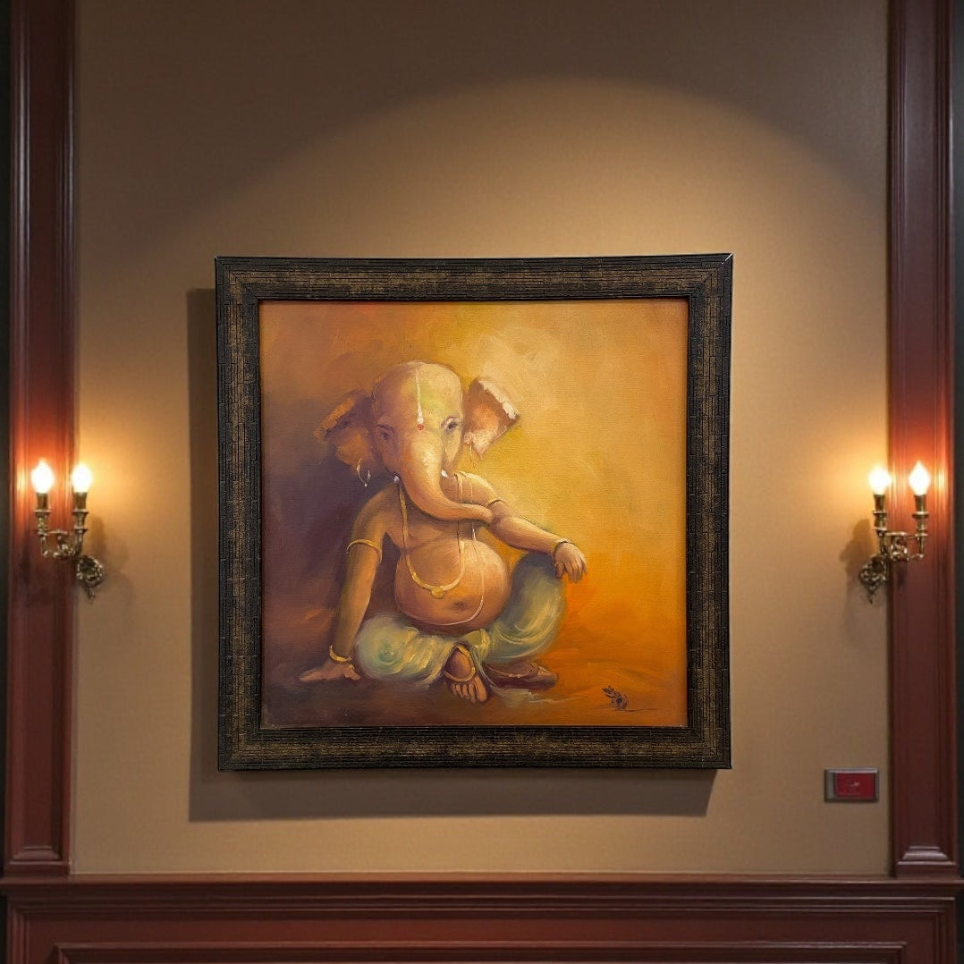 Infuse your living space with the divine presence of Lord Ganesha through this captivating acrylic painting on canvas. With intricate brushwork and vibrant colors, it portrays the beloved Hindu deity in a moment of divine blessing. Each brushstroke captures Ganesha's wisdom, auspiciousness, and protective energy with meticulous detail. Mounted on a pristine white backdrop, it enhances visual appeal against the canvas. Set in a sleek black frame, this masterpiece exudes elegance, ideal for any home, office, or spiritual sanctuary.