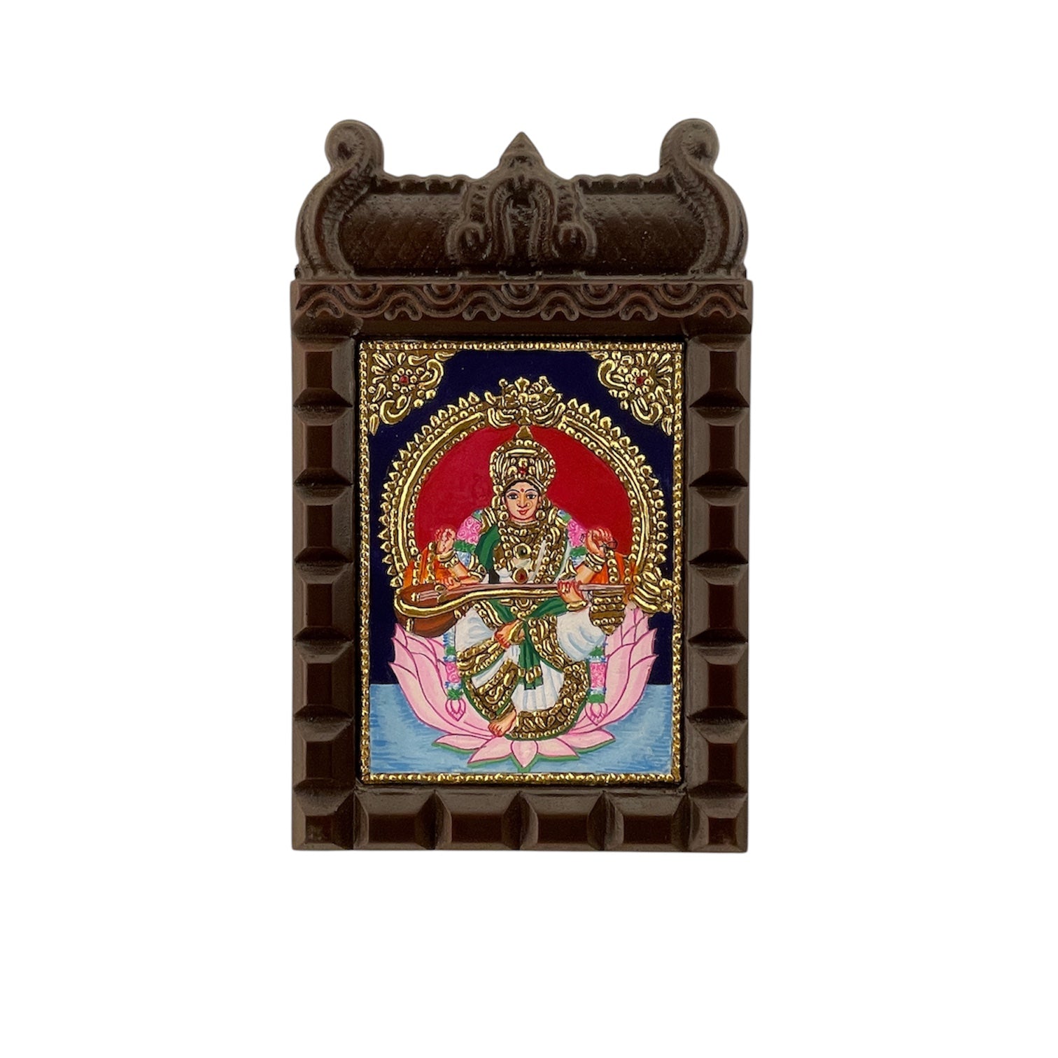 Goddess Saraswati Tanjore Painting in Temple-Style Wooden Frame