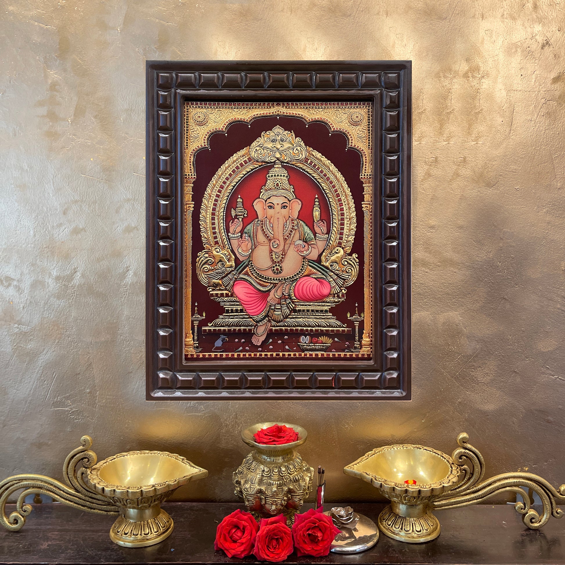 Each element is thoughtfully composed to bring positive energy, vastu harmony, and timeless devotional beauty into your space. A perfect blend of tradition and craftsmanship, this gold leafed Ganesh wall art makes a meaningful addition to any spiritual setting.