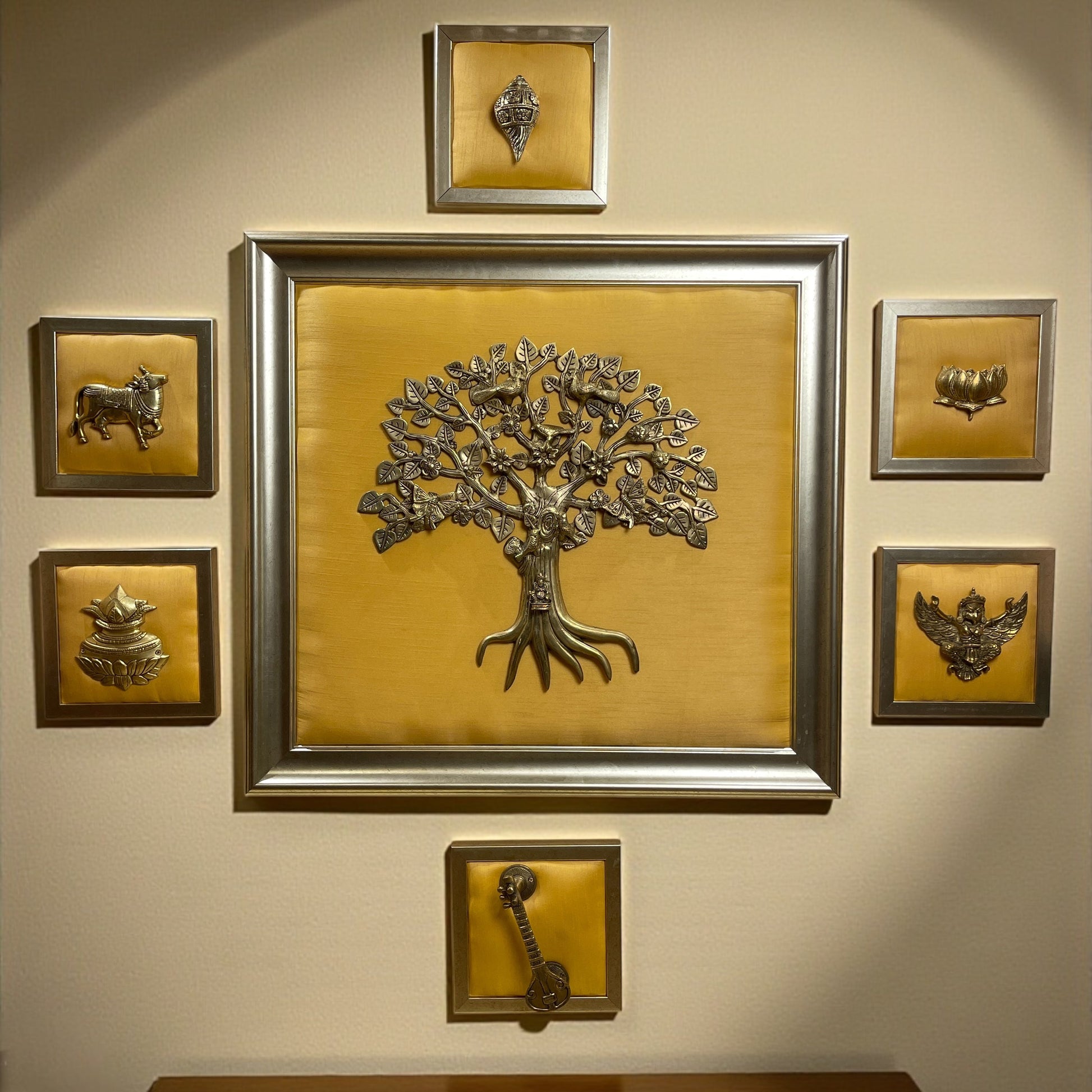 Enhance your living or pooja space with this Golden Brass Wall Art Set from Estudio, featuring the sacred Kalpavriksha Tree surrounded by auspicious symbols like Kamadhenu, Garuda, Shankh, Kuber Kalash, Veena, and Lotus. Each handcrafted brass motif is elegantly mounted on a radiant golden silk background, bordered with a premium metallic frame that adds a touch of luxury and spiritual charm.