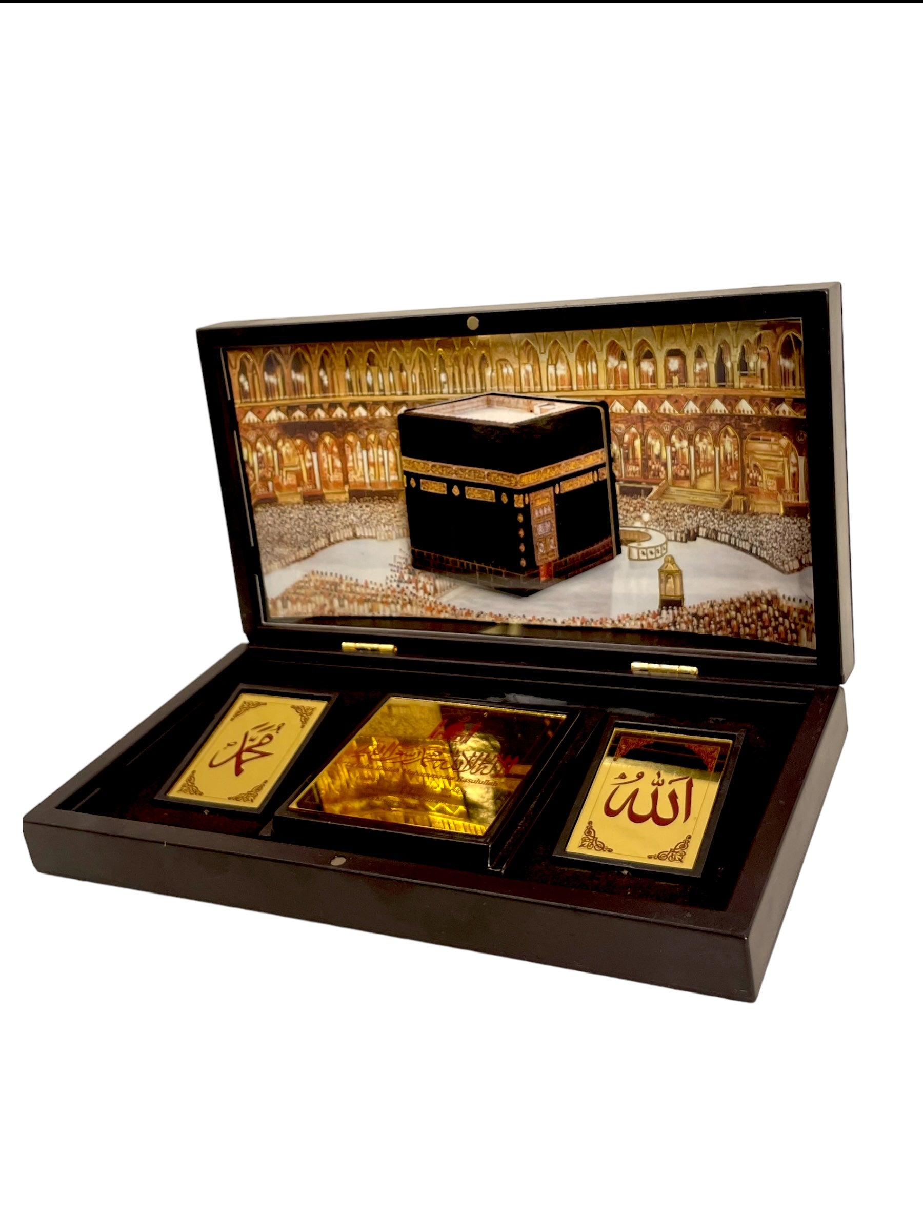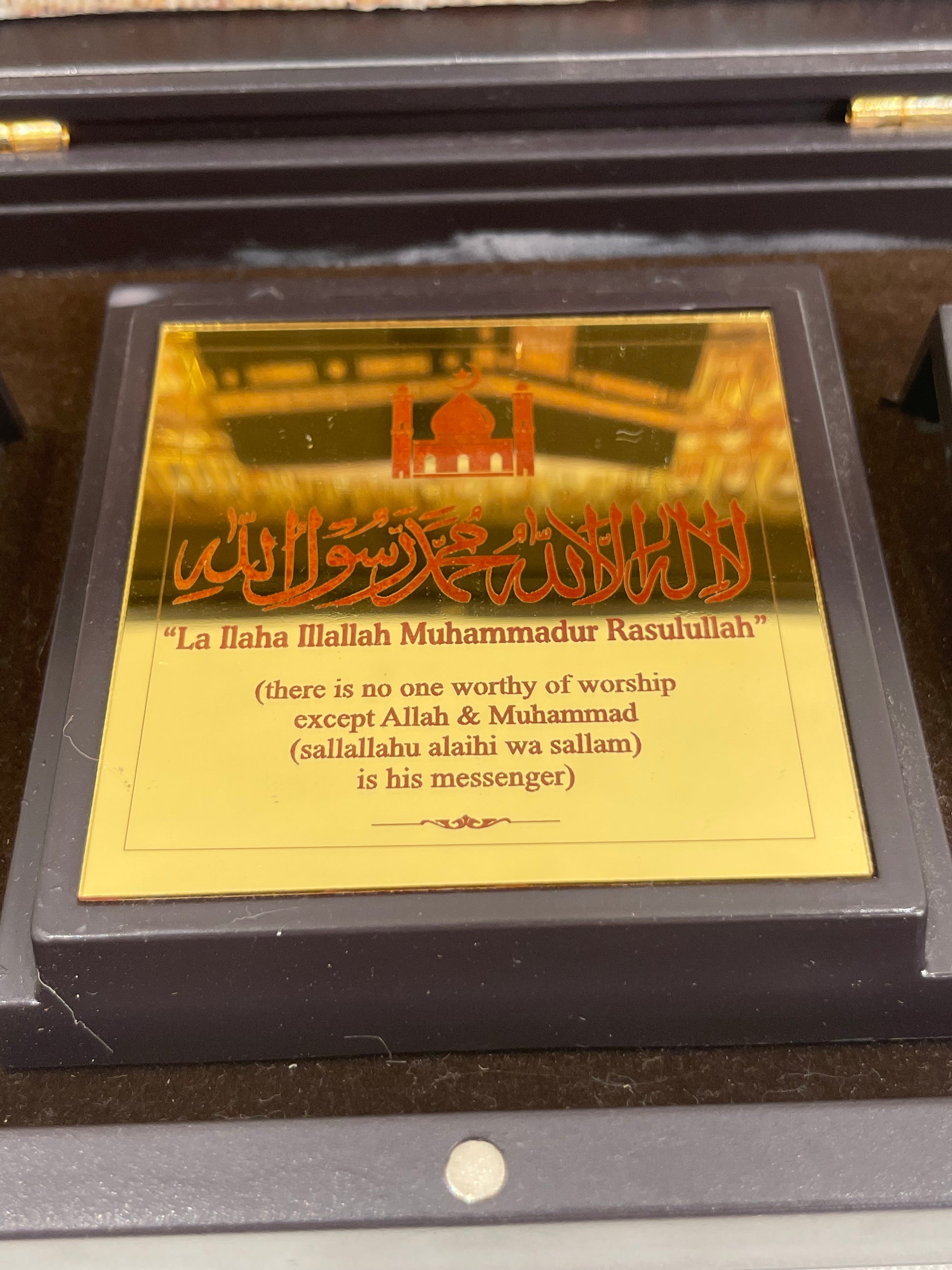 The Islamic Mecca gift box is a beautifully curated product that includes a photo of Mecca, one of the holiest cities in Islam, and the sacred phrase "La ilaha illallah Muhammadur rasulullah" (There is no god but Allah, and Muhammad is the messenger of Allah). This gift box is an ideal present for Muslim friends and family, especially during religious occasions like Ramadan, Eid, or Hajj. It serves as a meaningful reminder of faith, devotion, and the central tenets of Islam, bringing spiritual inspiration and blessings to any home.
