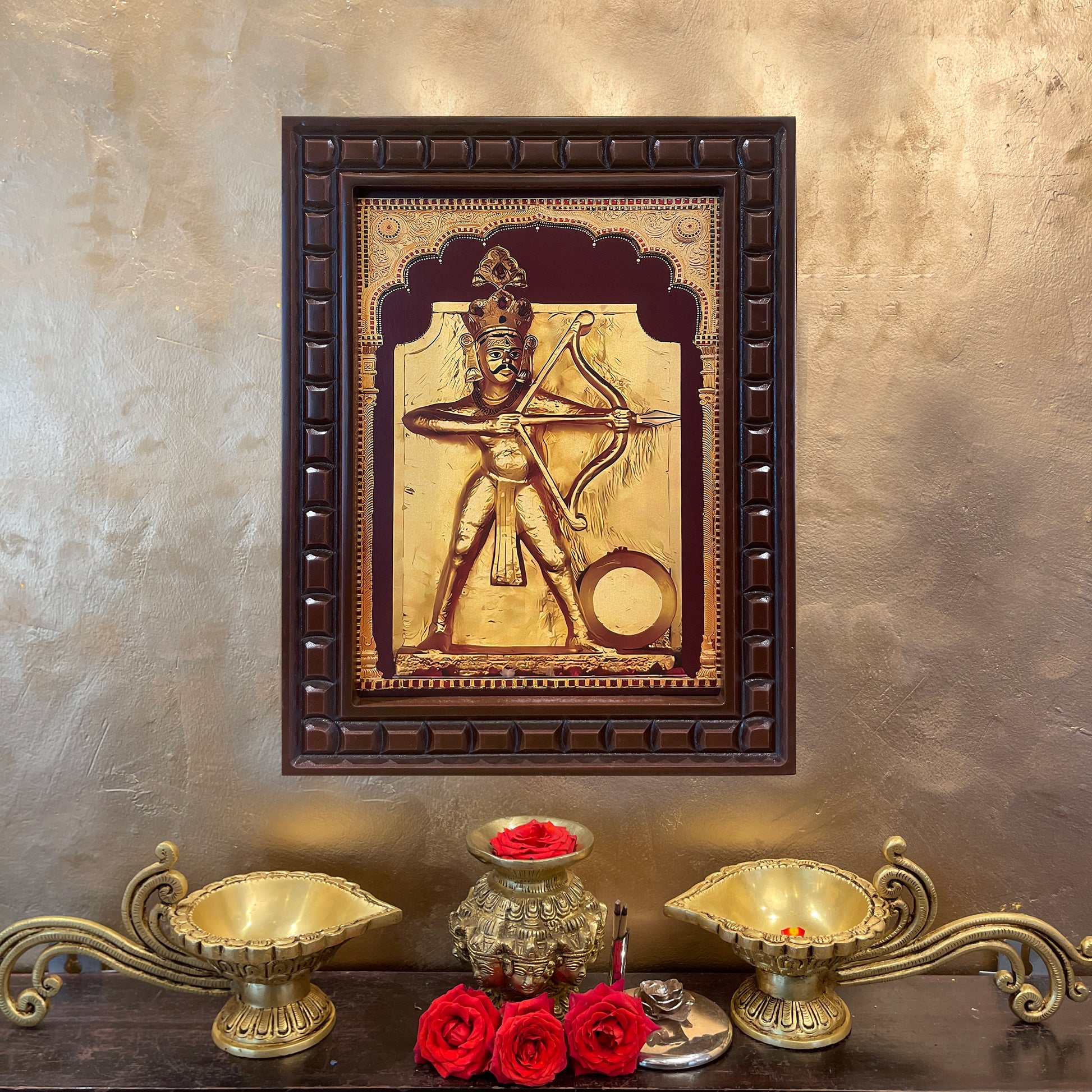 Set within an ornate temple-inspired frame and highlighted against a deep contrasting background, the gold leaf relief brings the deity’s commanding presence to life. The bold posture, symbolic bow, and intense expression represent vigilance, justice, and divine protection, making this piece ideal for spiritually charged interiors.
