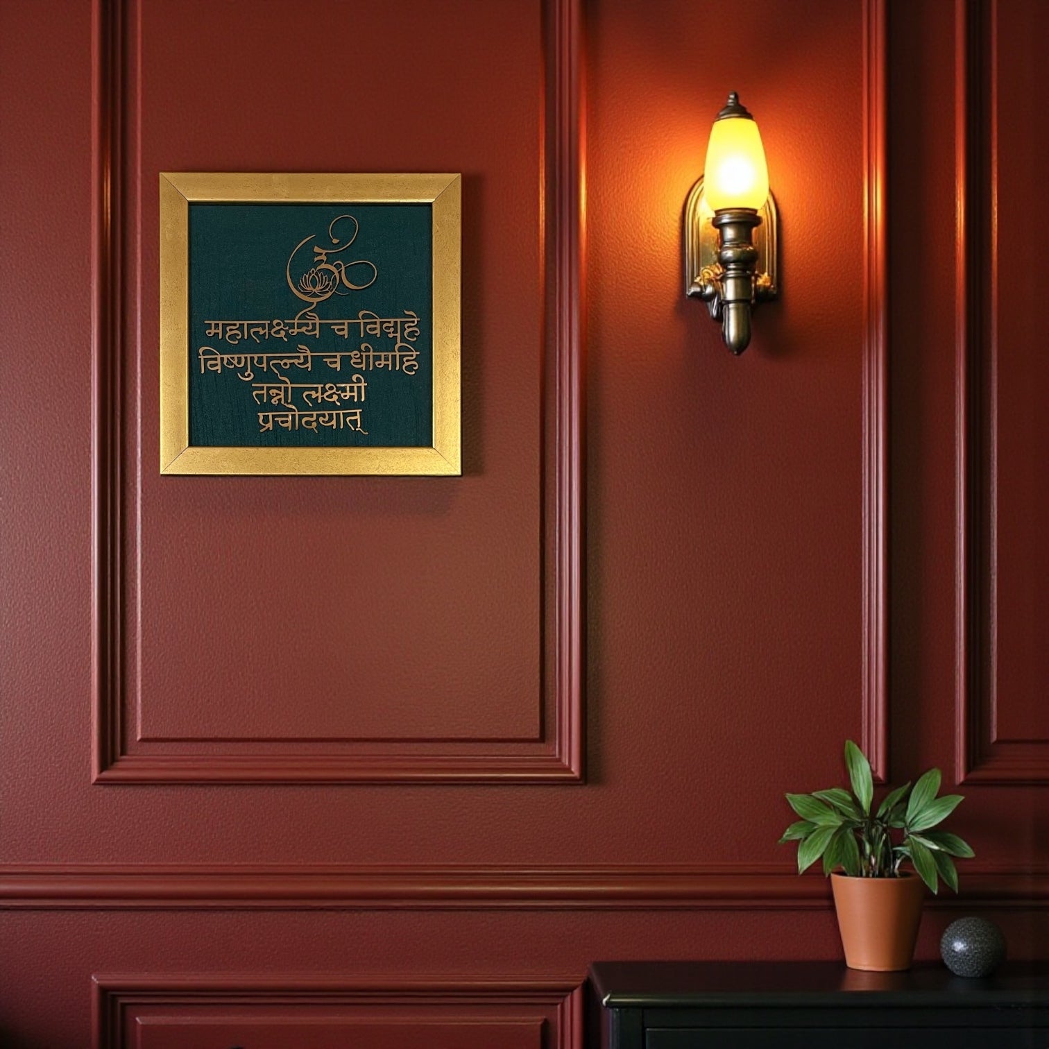 Invite abundance and harmony into your home with this elegant Mahalakshmi Gayatri Mantra wall frame. Featuring the sacred Lakshmi Shloka on a deep green backdrop with a golden border, this artwork symbolizes prosperity, wisdom, and divine blessings. Perfect for pooja rooms, living spaces, offices, or as a meaningful spiritual gift.