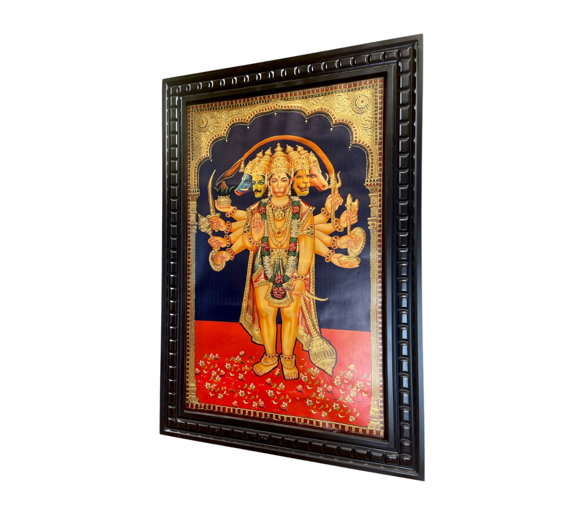 Standing Panchamukhi Hanuman Gold leafed artwork in wooden frame