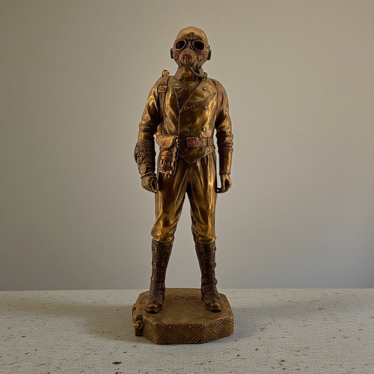 This steampunk-style chemical warfare soldier figurine is crafted with a rich brass finish, featuring intricate details such as a gas mask, utility gear, and period-inspired uniform. Drawing inspiration from early 20th-century warfare aesthetics blended with steampunk fantasy, the piece evokes resilience, caution, and the darker chapters of human innovation.