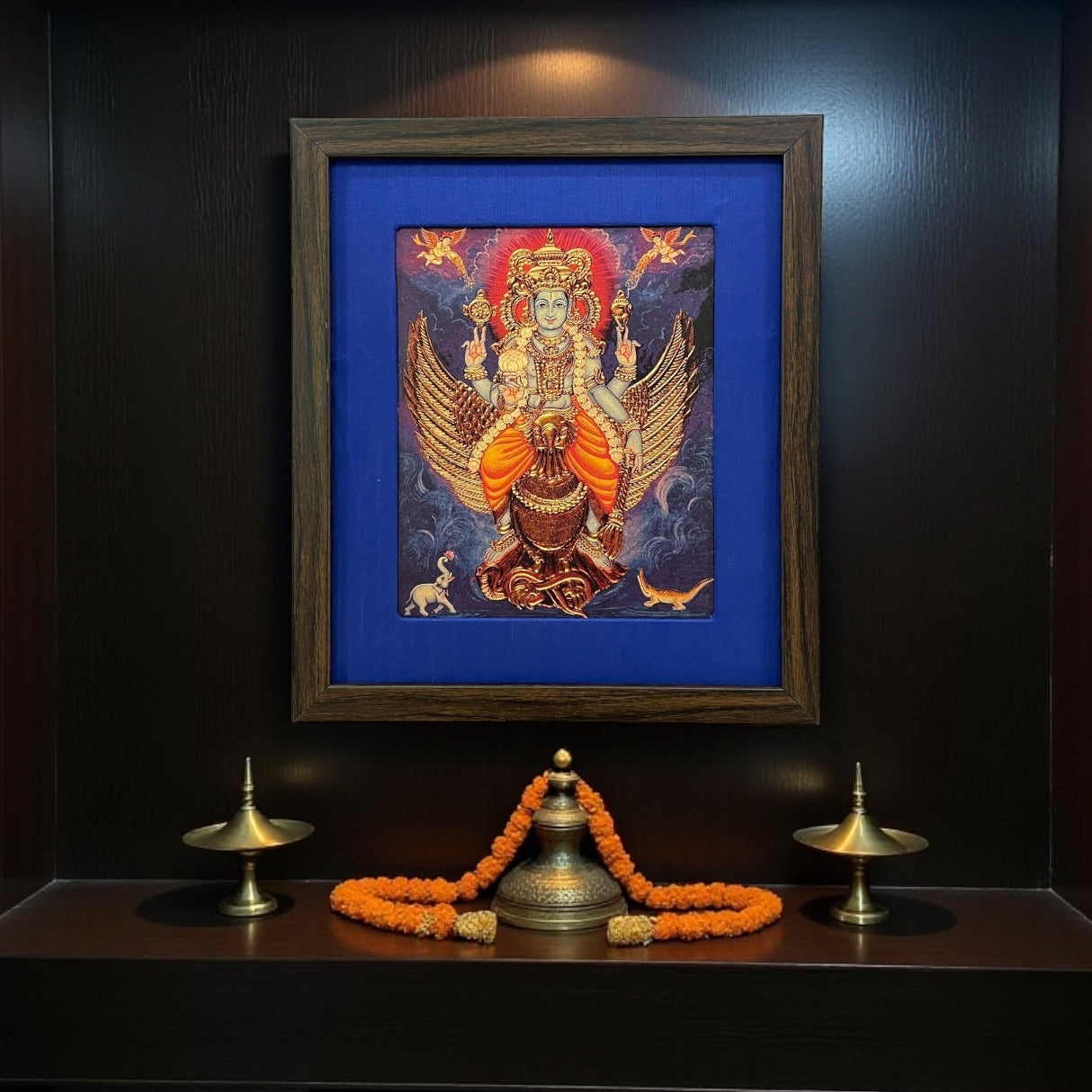 Presenting the divine presence of Garuda Bhagavan, adorned in tranquil blue silk and framed elegantly in rich brown, this sacred artwork emanates spiritual energy and timeless grace. The serene blue silk mont drapes gracefully around the deity, symbolizing serenity, wisdom, and unwavering devotion, while intricate details in the divine attire and ornaments showcase artistic mastery. Encased in a finely crafted brown frame, this depiction not only enhances aesthetics but also serves as a focal point for spiritual contemplation, blending earthly warmth with a divine aura. Bring home the divine energy and blessings of Garuda Bhagavan with this beautifully adorned artwork, creating an atmosphere of tranquility, devotion, and profound sacred connection in your sacred space.