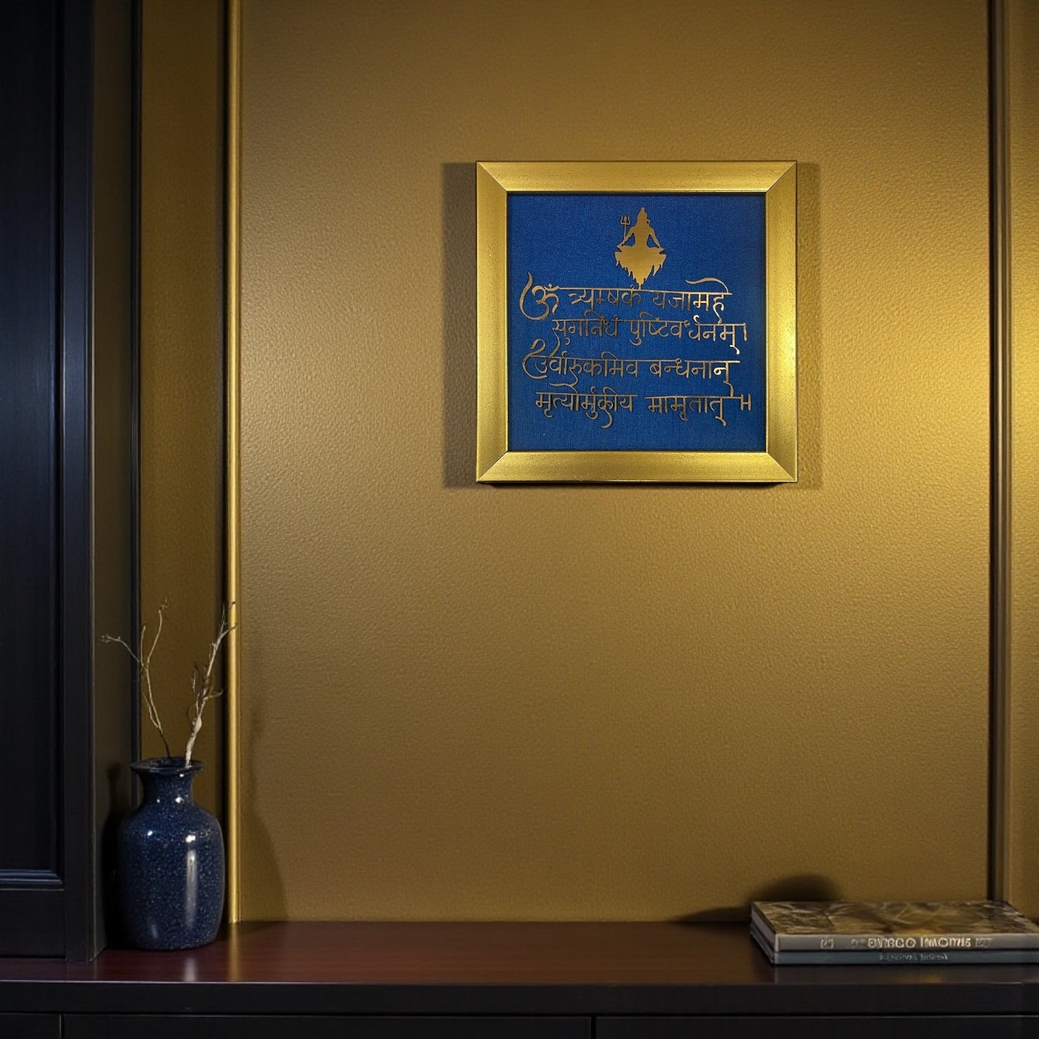 Invite divine strength and blessings with this elegant Shiva Mahamrityunjaya Mantra wall frame. Featuring the sacred chant on a rich blue backdrop with a golden border, this artwork symbolizes healing, protection, and spiritual growth. Perfect for pooja rooms, meditation spaces, offices, or as a meaningful spiritual gift for loved ones.