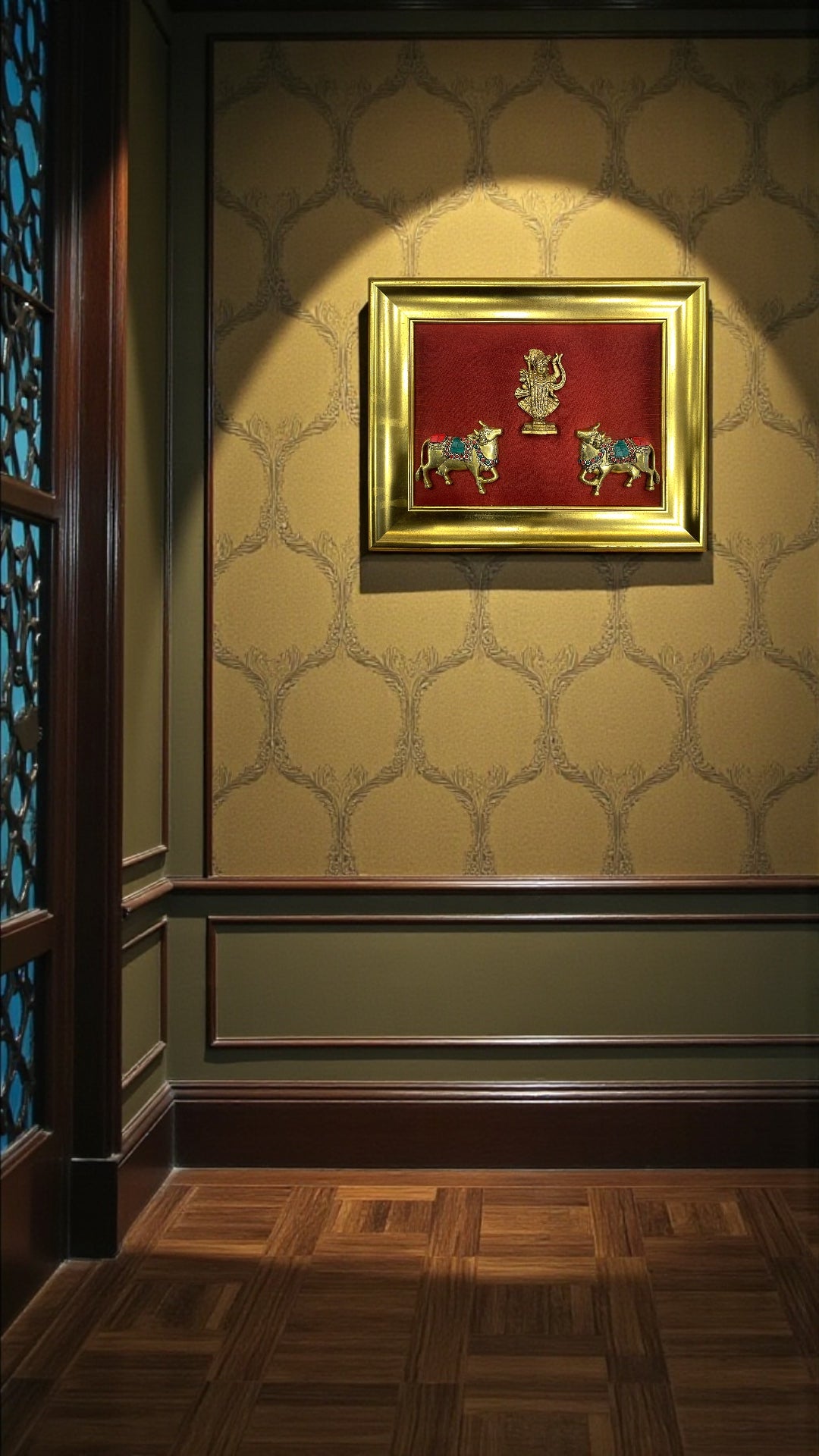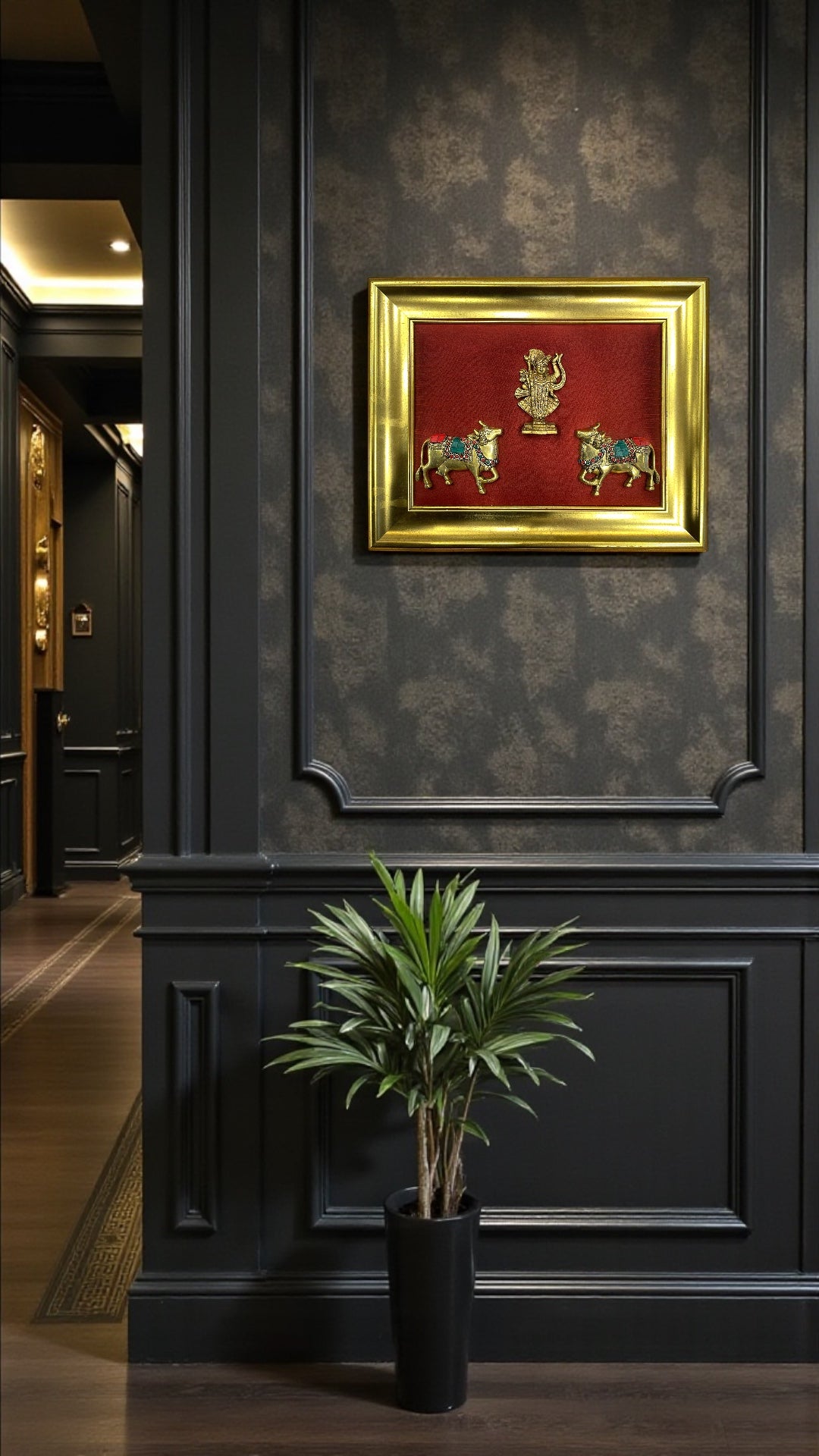 This elegant wall frame represents devotion, protection, and fulfillment of wishes. The presence of Kamadhenu on both sides enhances positive energy, wealth, and harmony, making it an ideal choice for your pooja room, living space, office, or entrance wall.