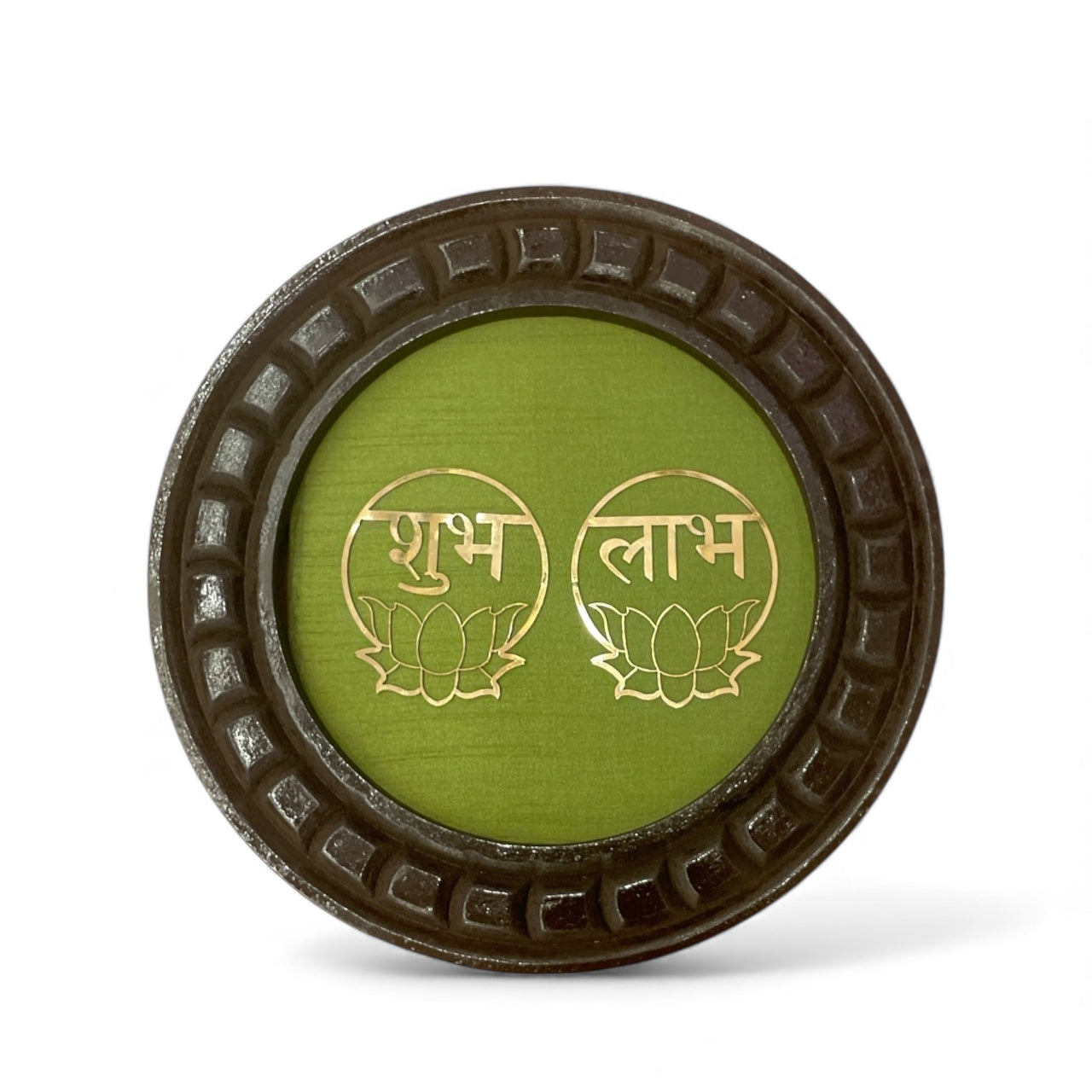 Shubh Labh Wooden Circular Frame – 10 Inches Diameter | Green Backdrop | Auspicious Wall & Temple Décor