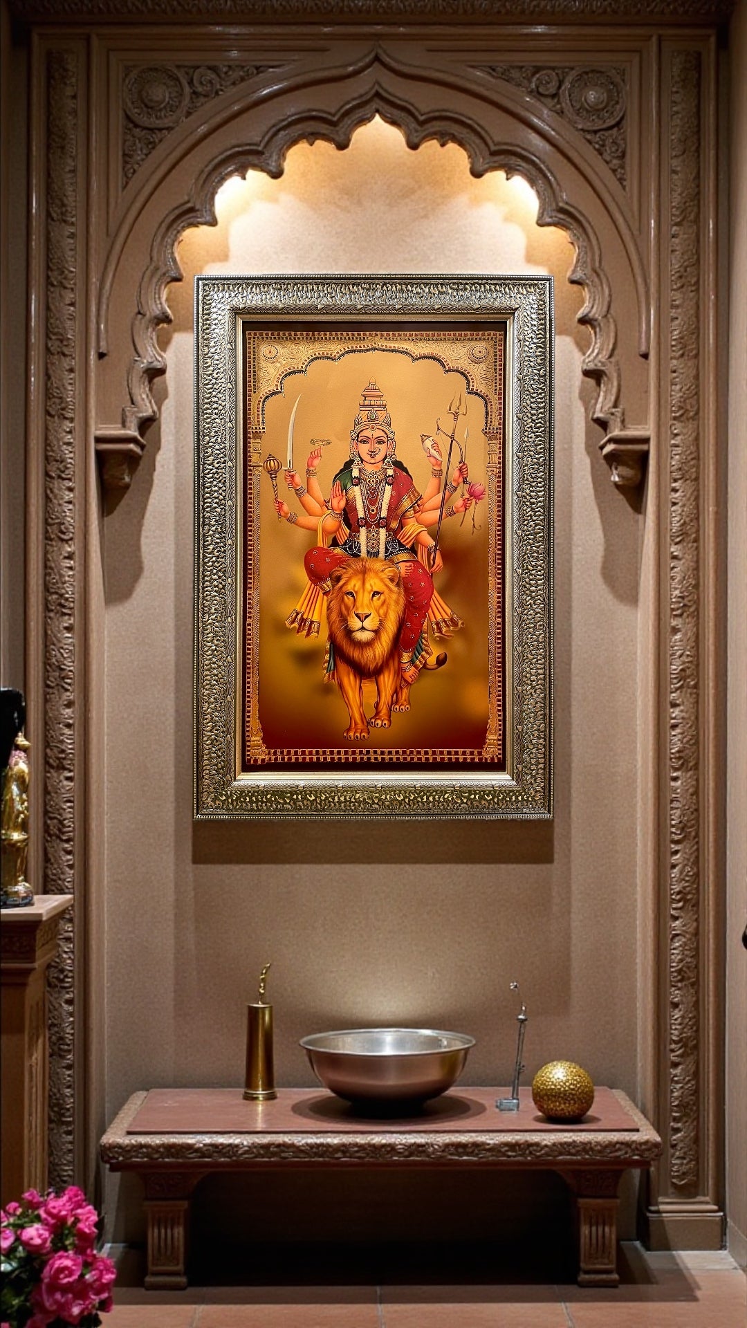 Invite strength, protection, and positive energy into your home with this beautifully crafted Silver Molded Goddess Durga Wall Art Frame. Designed in a sleek contemporary style, this sacred artwork features Maa Durga, the symbol of power, courage, and victory of good over evil.