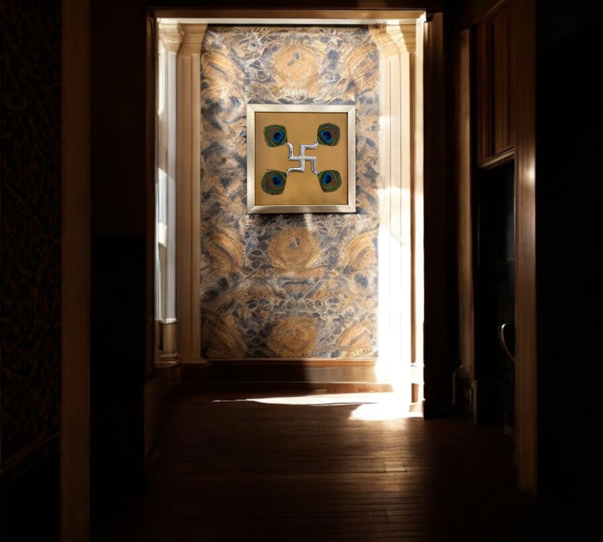 Enhance your home or office with this exquisite Silver Swastik symbol, beautifully set against a luxurious gold silk backdrop and framed in a classic antique gold frame. The swastik symbol is an ancient emblem of good fortune, prosperity, and positive energy, making it a perfect addition to any space seeking harmony and blessings. The radiant gold silk adds warmth and richness, while the antique gold frame brings a timeless vintage appeal to the piece. Ideal for those seeking spiritual inspiration or traditional elegance, this artwork serves as a meaningful gift or a statement piece to elevate your decor.