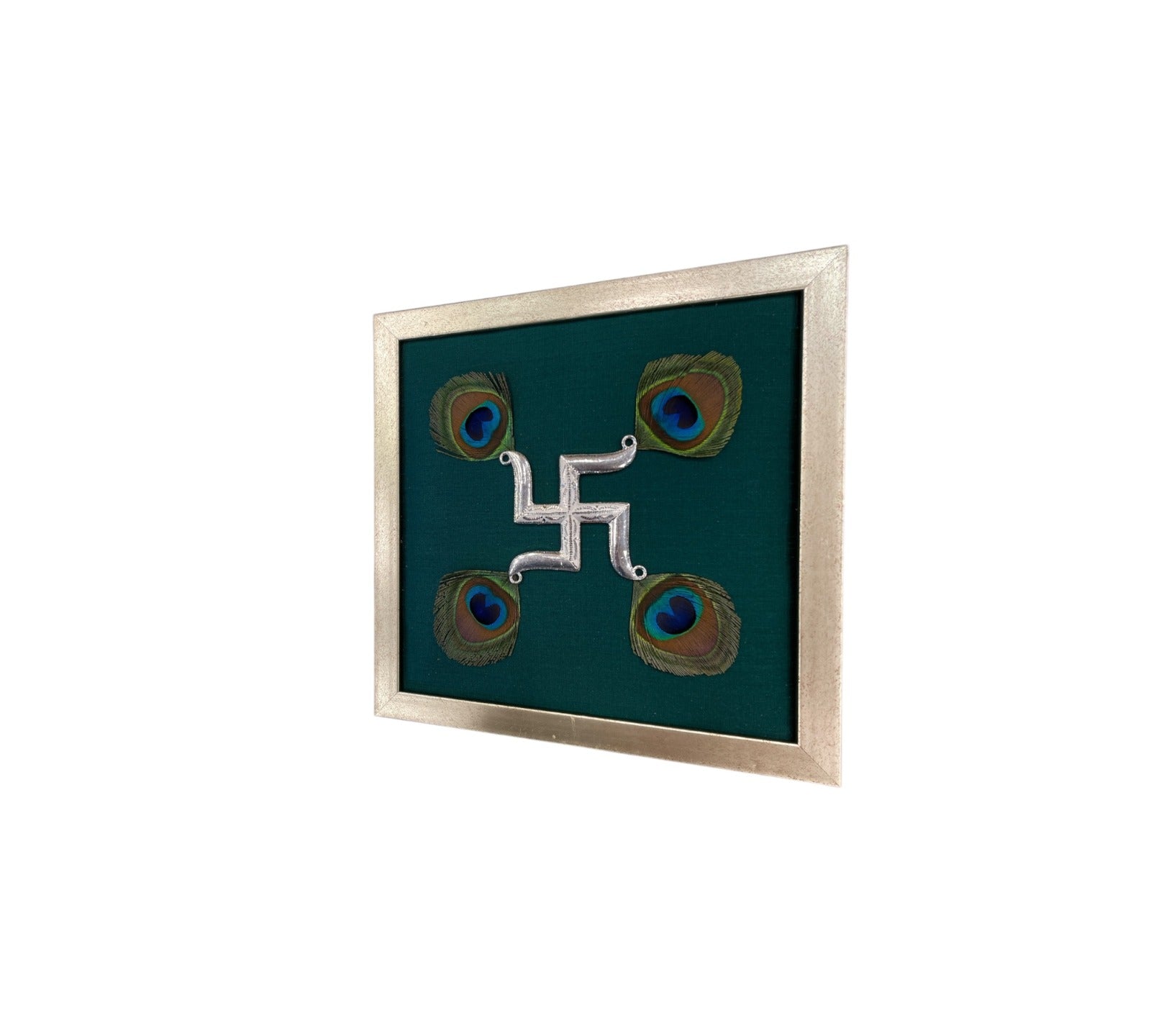 This exquisite artwork features a beautifully crafted silver swastik symbol on a rich green silk backdrop, enclosed in an elegant antique gold frame. Perfect for enhancing the spiritual ambiance of your home or office, this unique piece blends tradition with luxury. The silver swastik is known for its auspicious significance in various cultures, symbolizing prosperity, good fortune, and well-being. The green silk adds a touch of vibrant color, while the antique gold frame offers a timeless, vintage feel to the piece. Ideal for gifting or as a statement decor piece, this artwork is a must-have for those who appreciate spiritual symbols and traditional artistry.