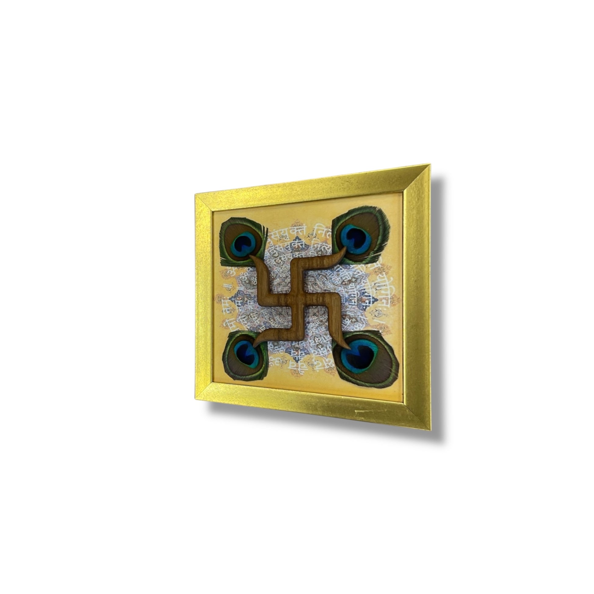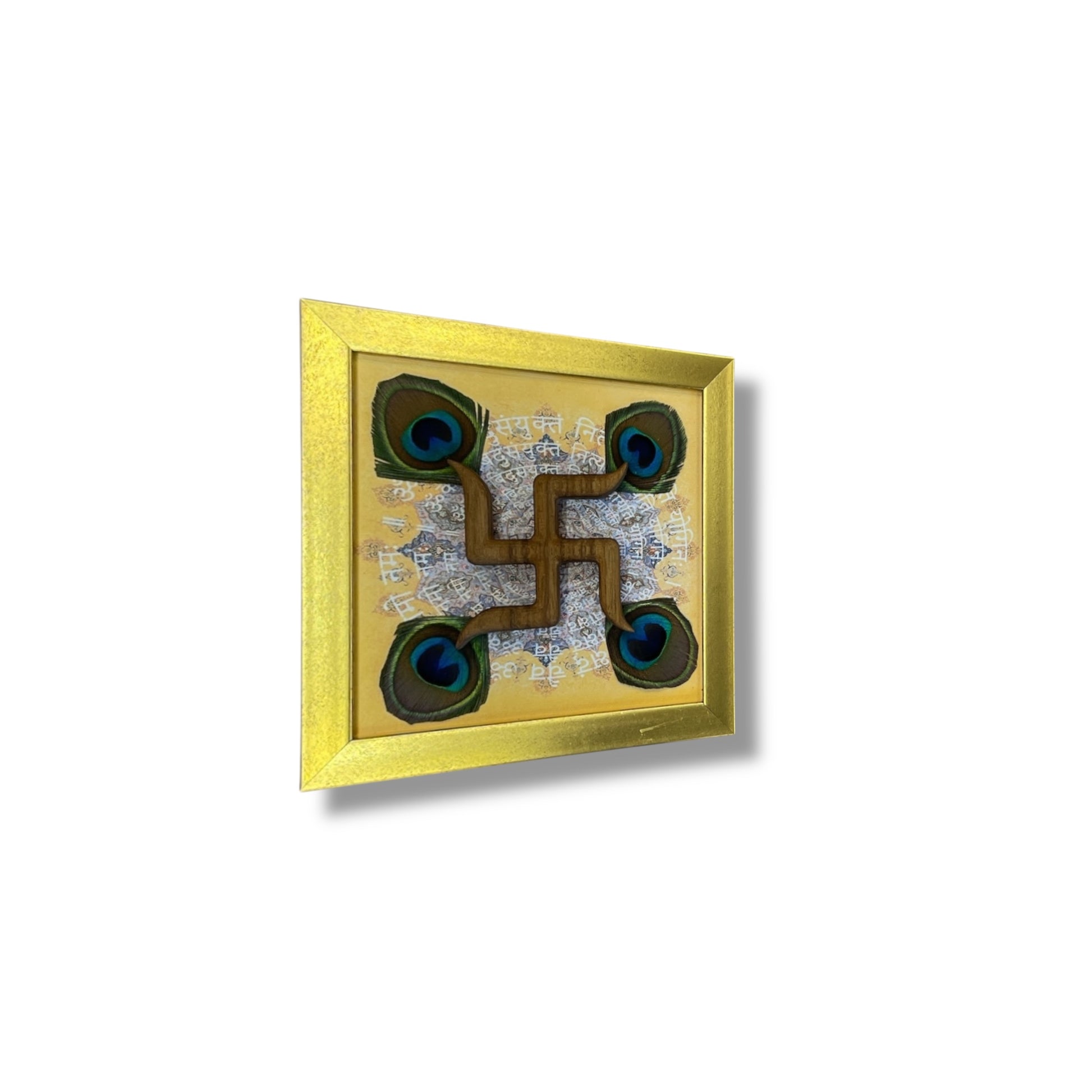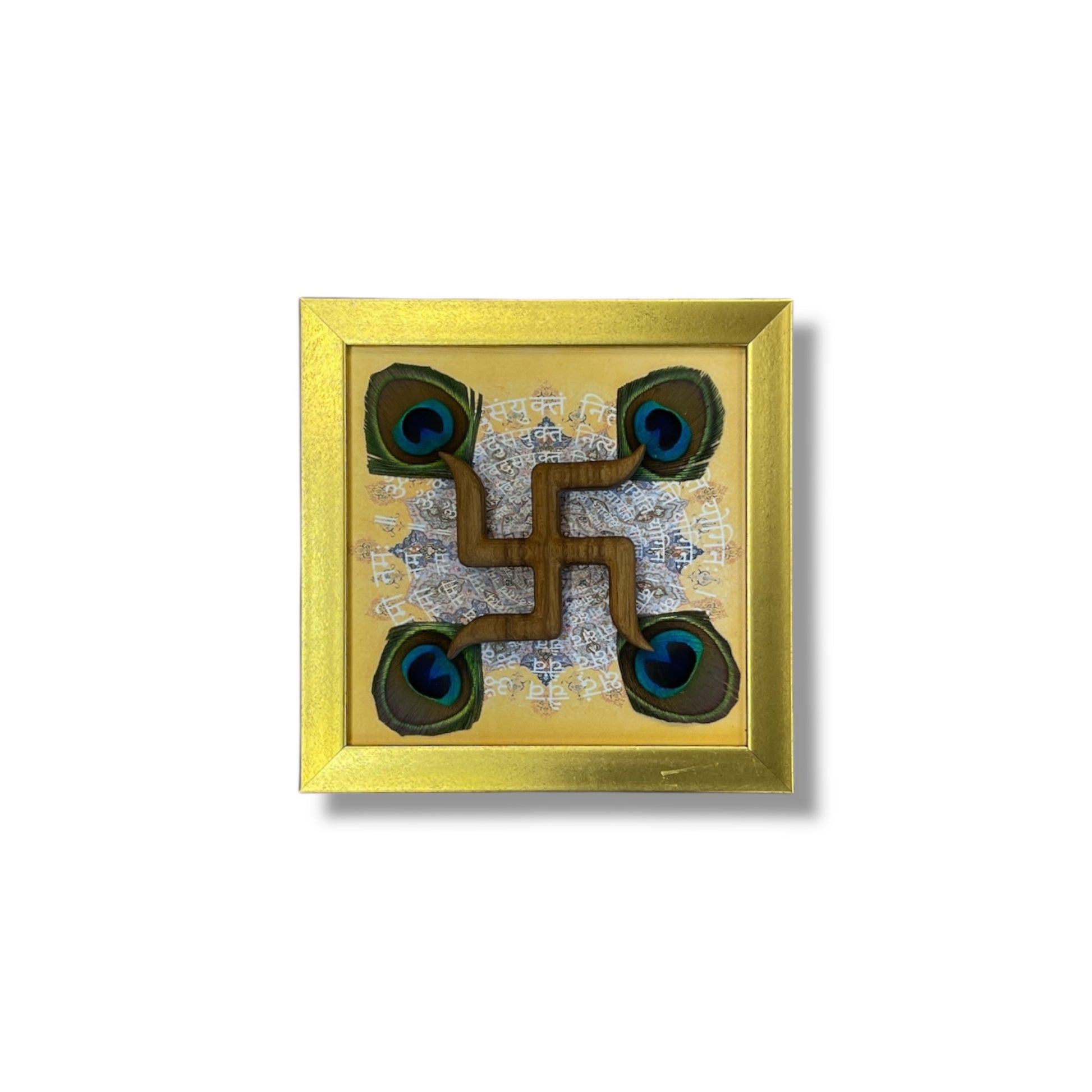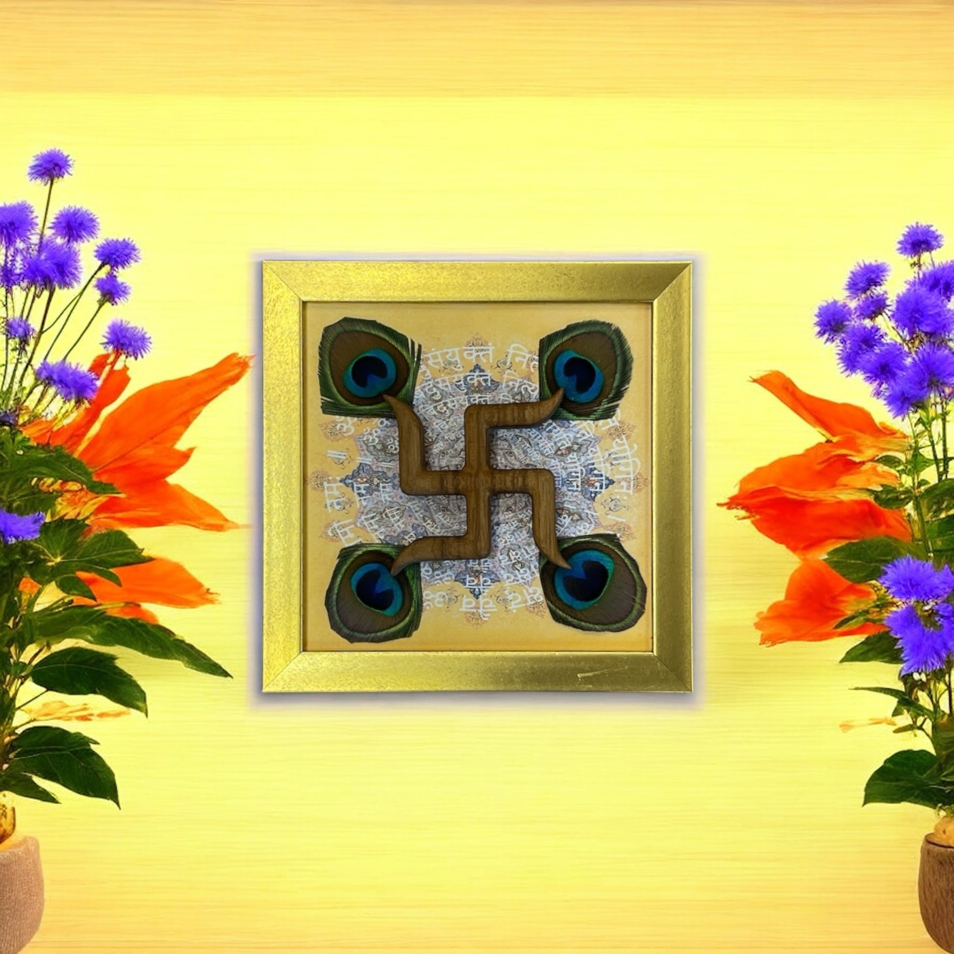 A symbol of auspiciousness, this handcrafted Swastik in premium teak wood is set against a serene Omkara mantra backdrop on canvas. Encased in a rich golden resin frame, this 8x8 inch wall decor blends tradition and elegance, ideal for enhancing positivity and good energy in your space.