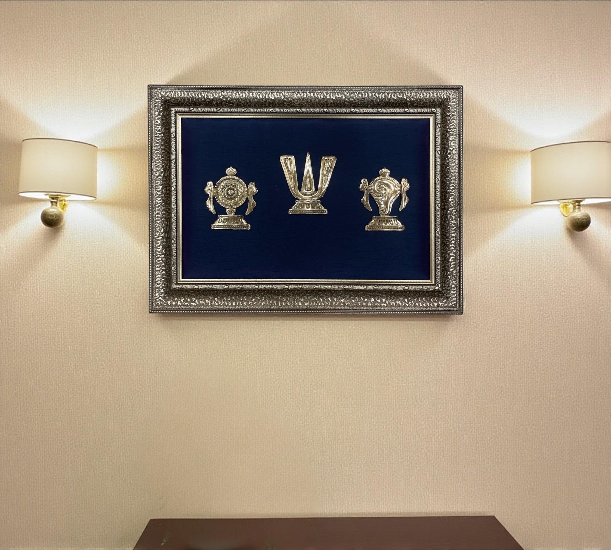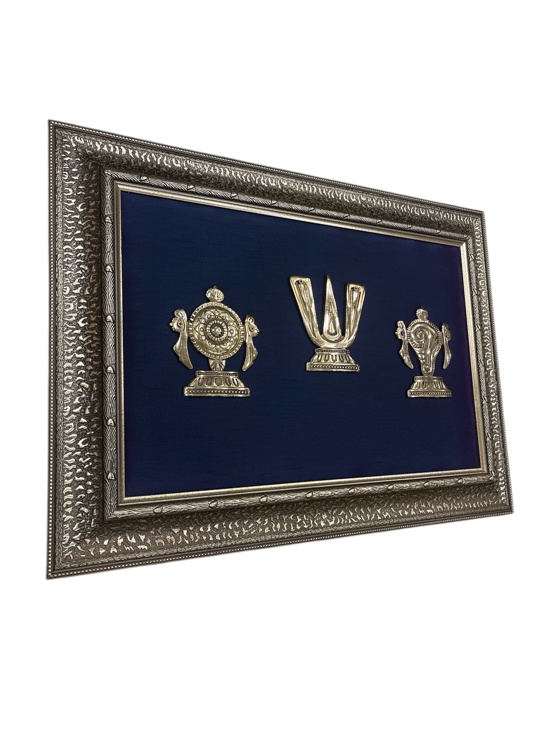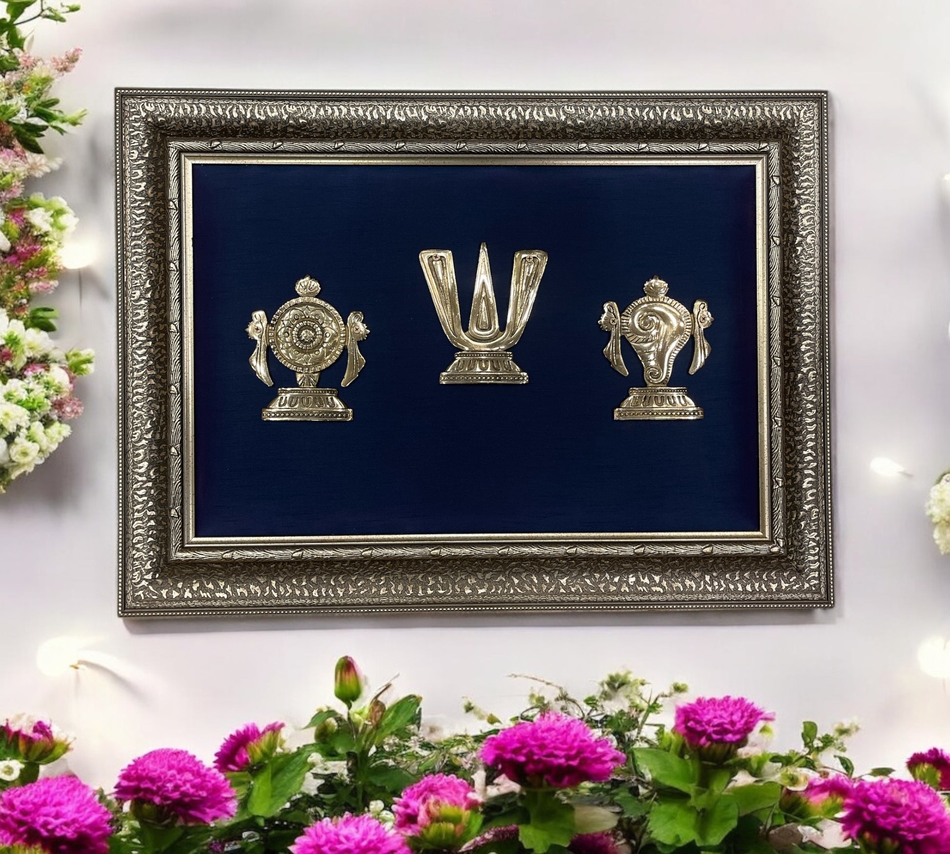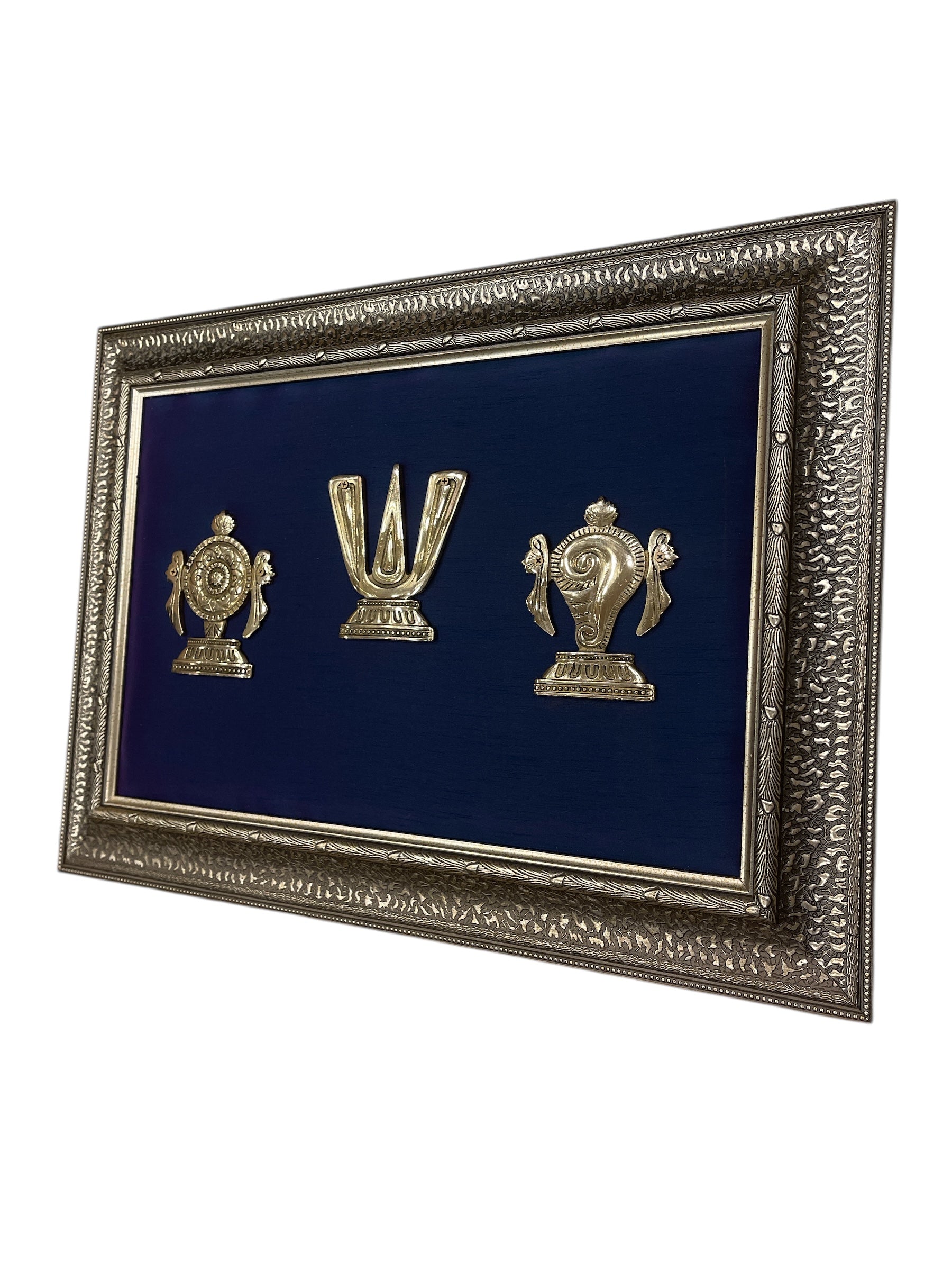 Tirupati Brass Shanku Chakra Namam with Blue Cushion in Moulded Frame