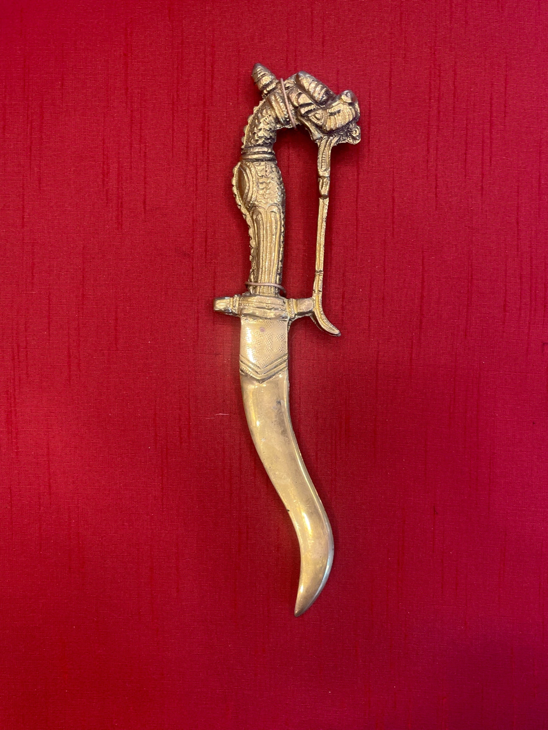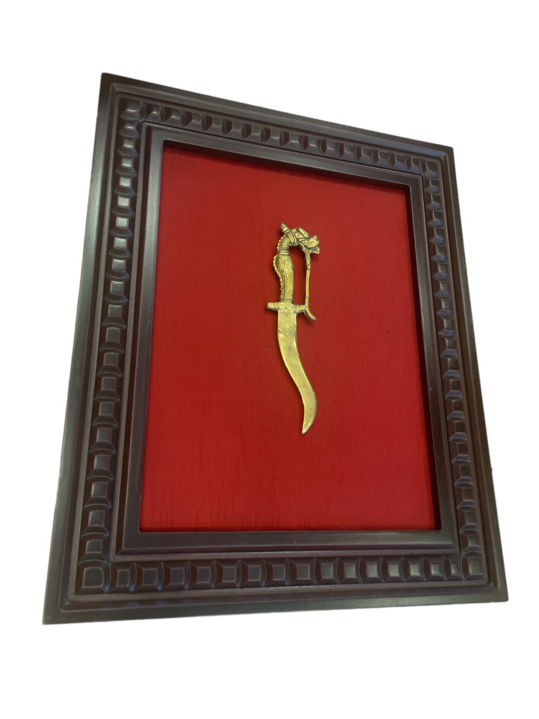 This traditional brass dagger features intricate detailing and a polished blade, encased in a sturdy wooden frame. The brass handle showcases fine craftsmanship, offering a blend of elegance and historical charm. Perfect as a display piece or for ceremonial use, this dagger is a symbol of heritage and artistry.