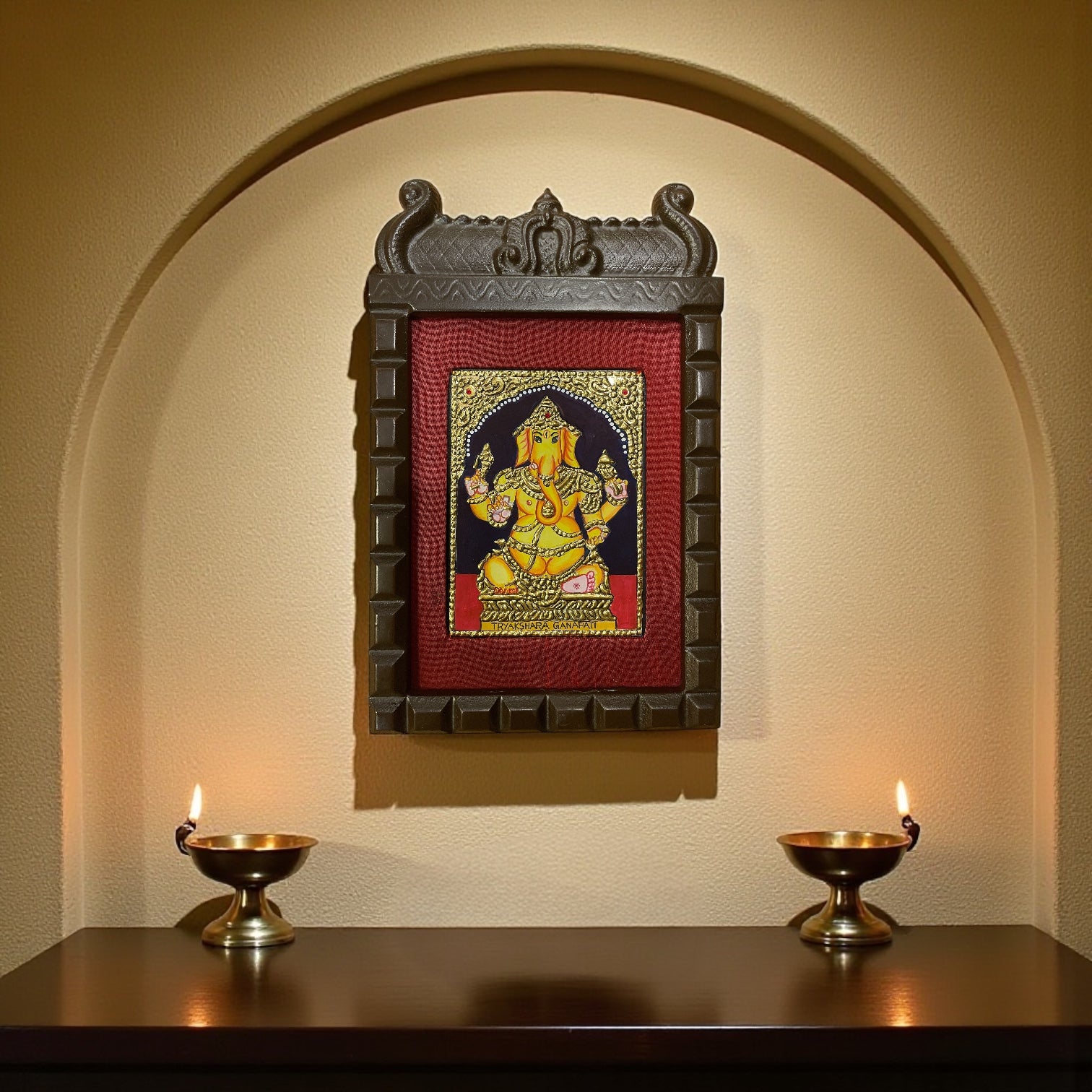Celebrate wisdom, success, and divine blessings with this exquisite Trayakshara Ganapati Tanjore Painting. Depicting Lord Ganesha in his sacred three-syllable (Trayakshara) form, this artwork symbolizes knowledge, prosperity, and the removal of obstacles. Handcrafted in the traditional Tanjore style, it features intricate gold foil detailing, embossed patterns, and vibrant colors that highlight the deity’s divine presence. The wooden frame adds a touch of elegance, making it perfect for pooja rooms, homes, or auspicious gifting.