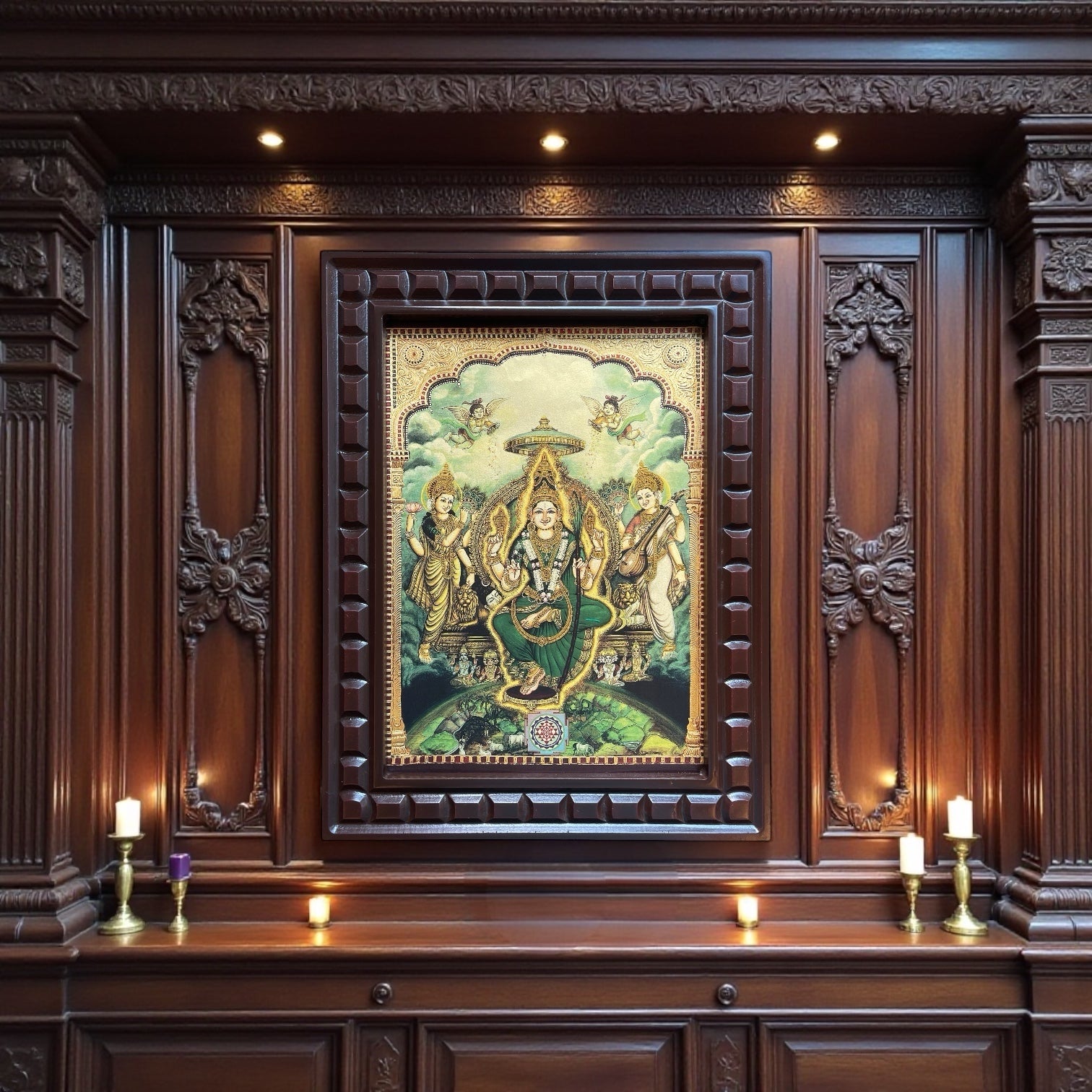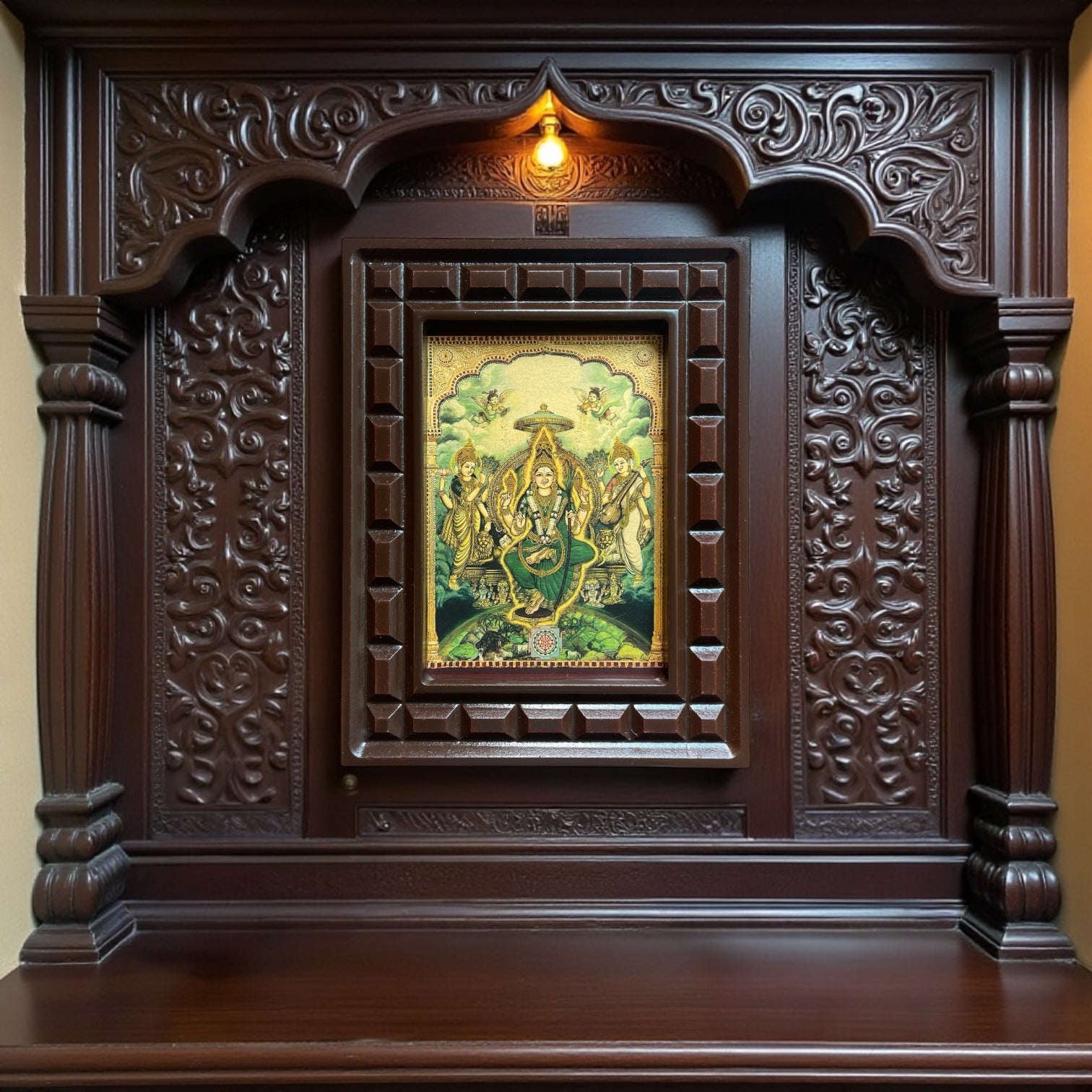 The piece is set within a durable, intricately carved wooden frame, making it a perfect addition to pooja rooms, living spaces, meditation corners, or as a meaningful spiritual gift. The gold-foil background enhances the depth and brilliance of the artwork, adding a luxurious and devotional touch to any setting.