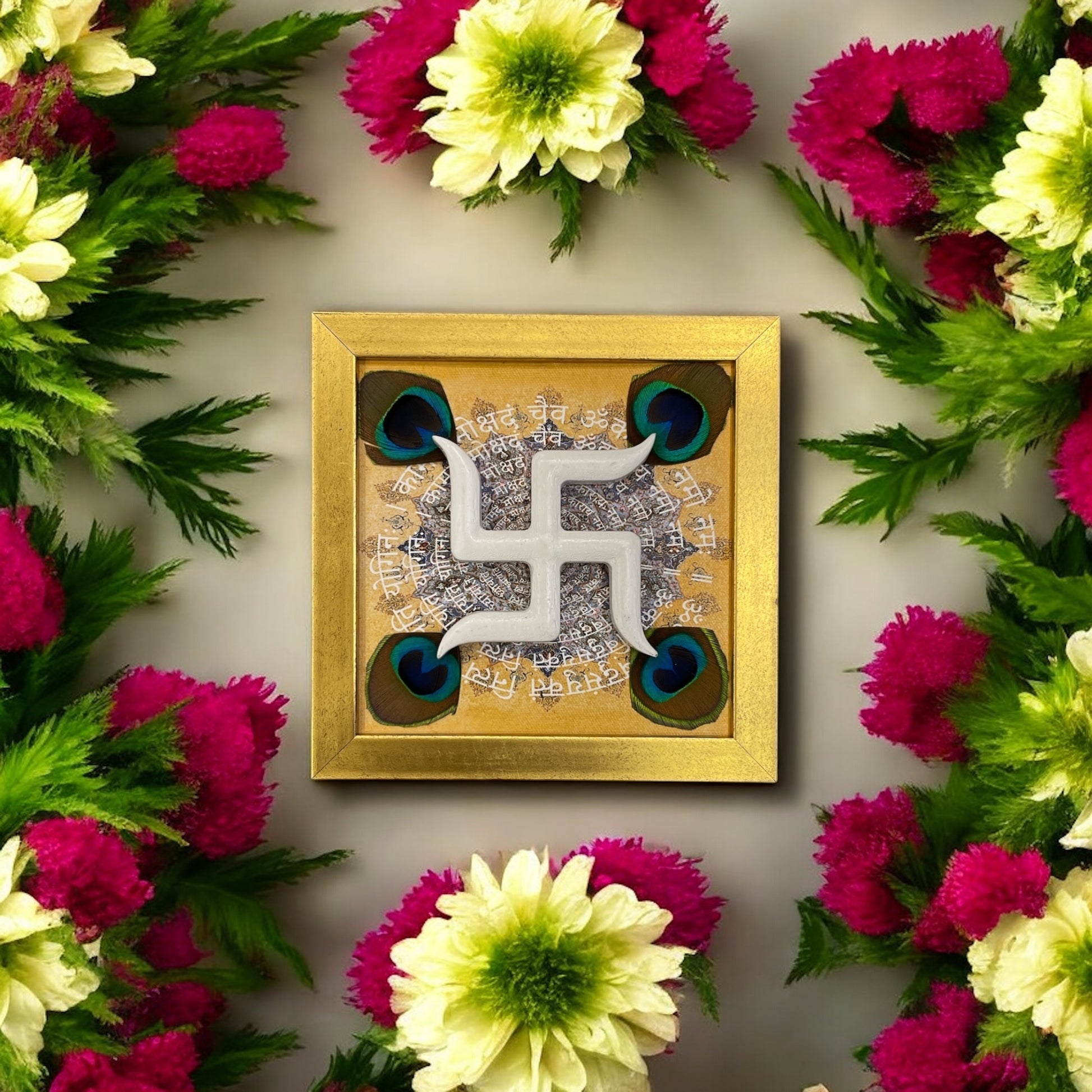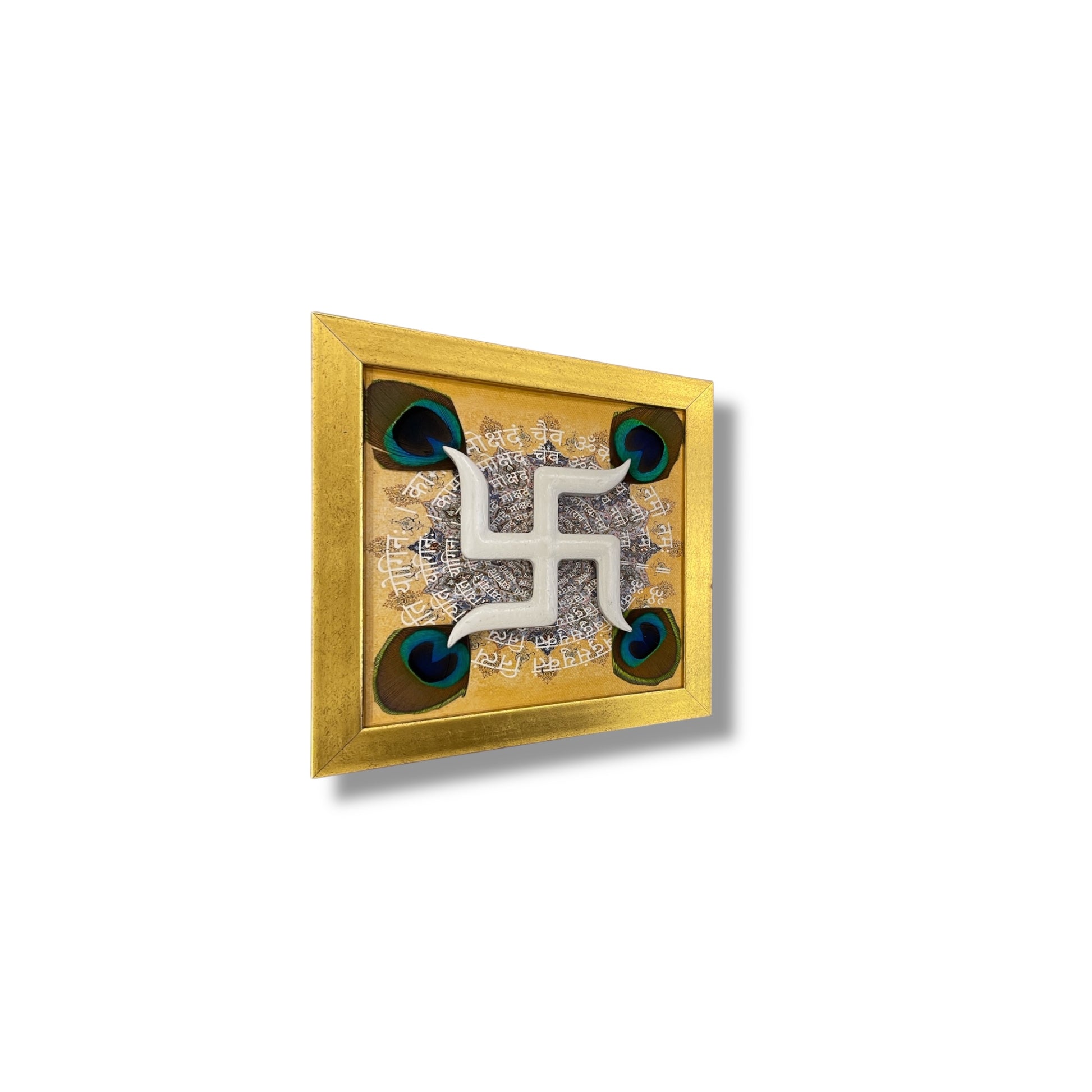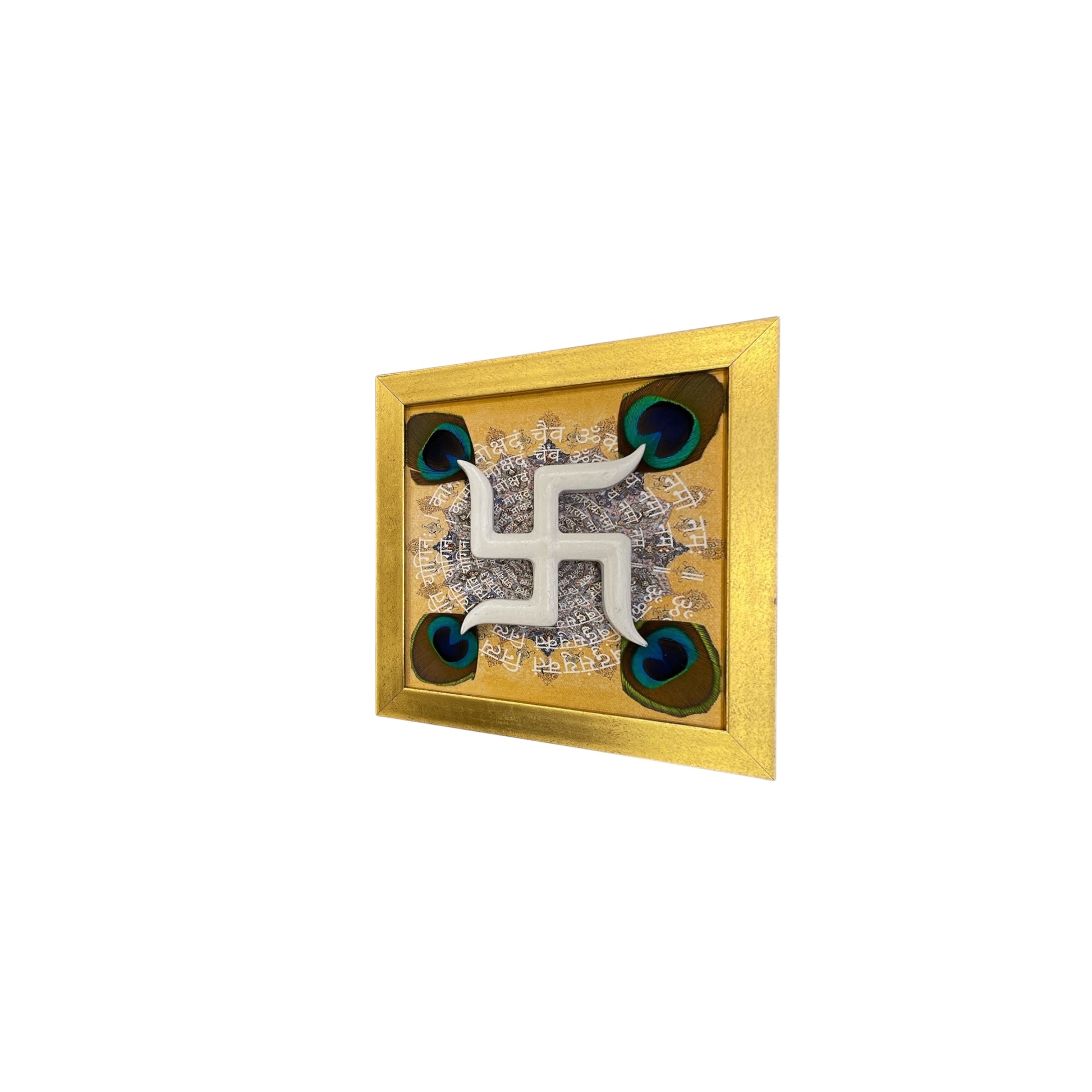 White Wooden Swastik with Peacock Feathers on Omkara in Gold Frame