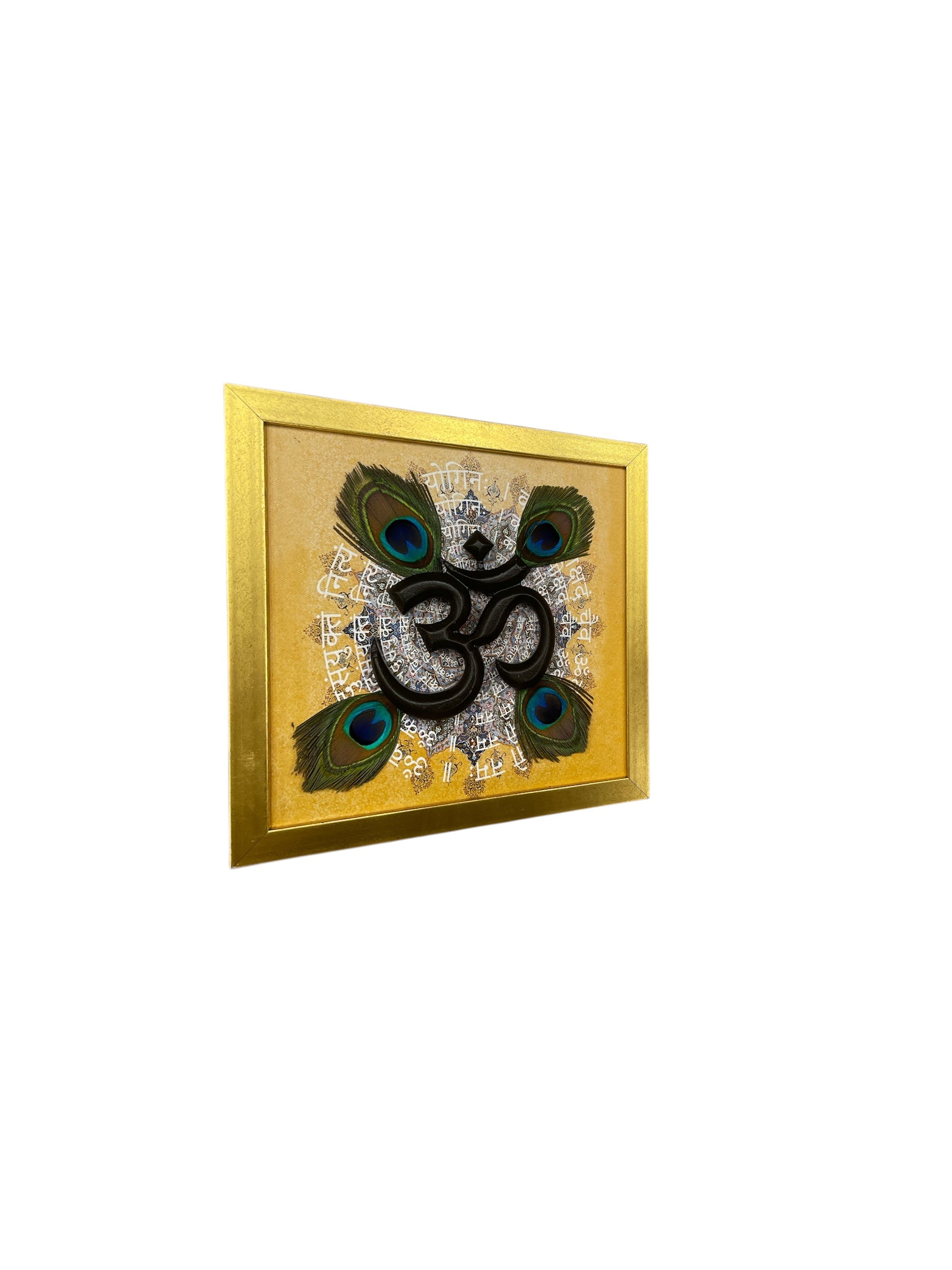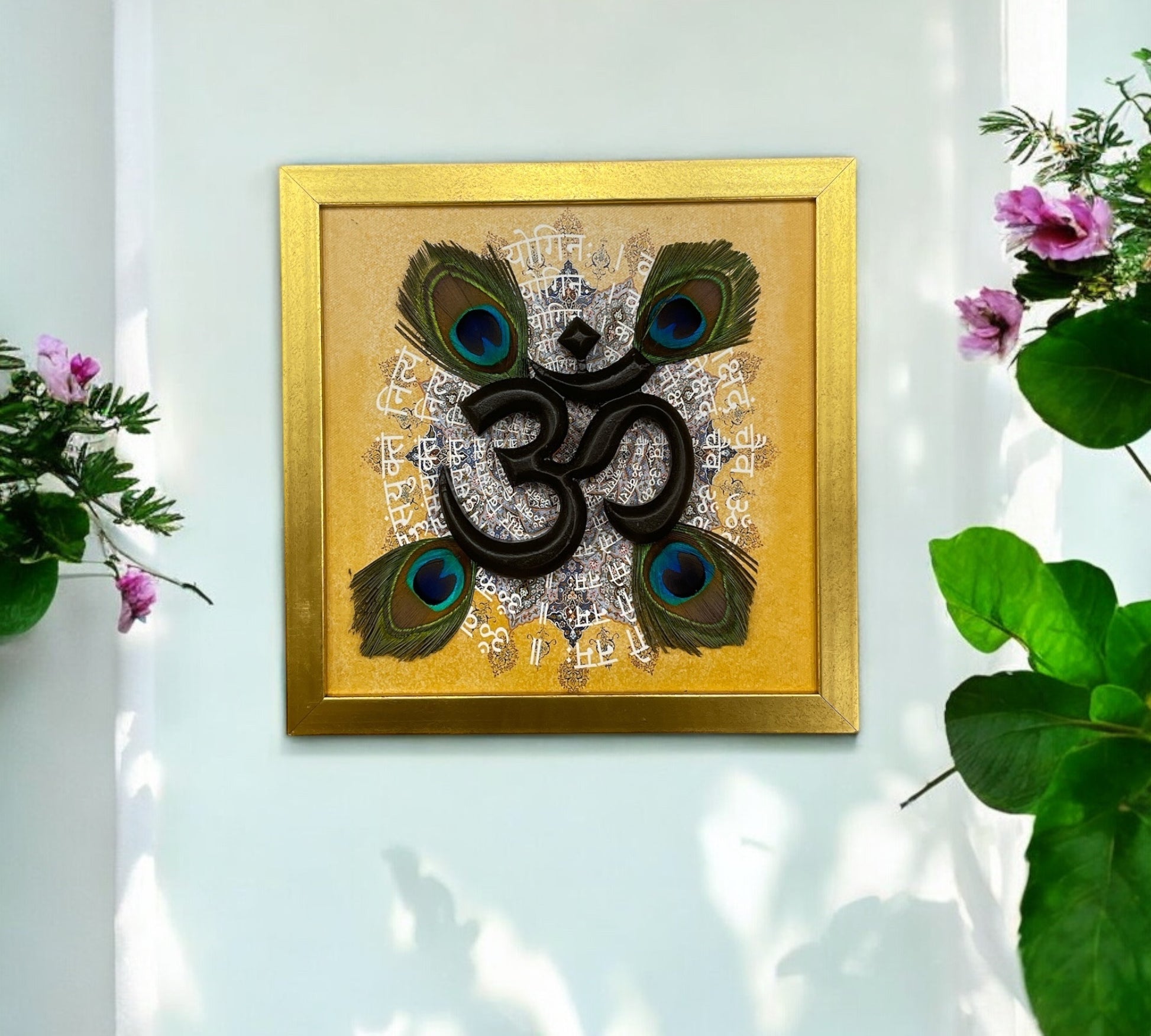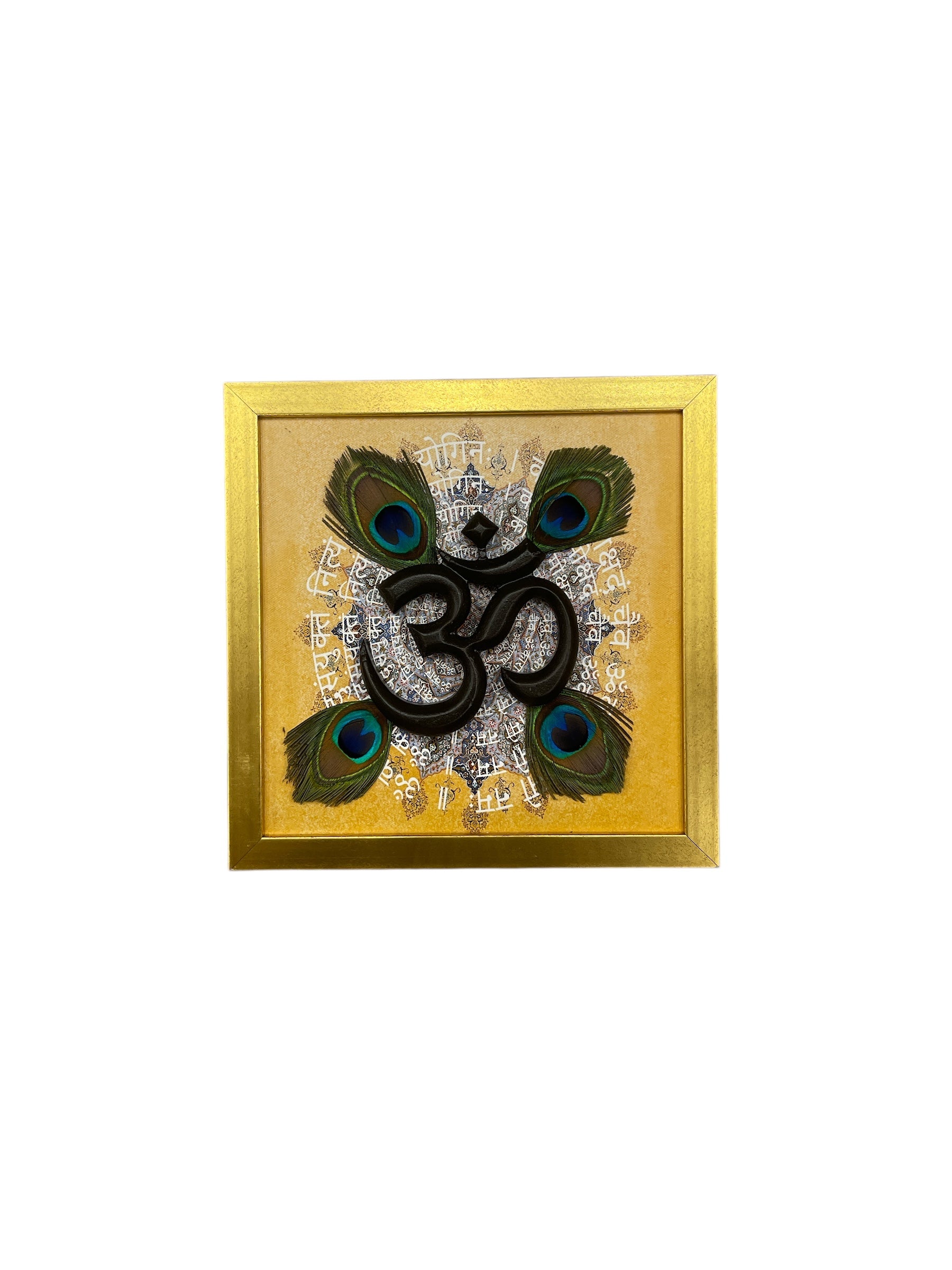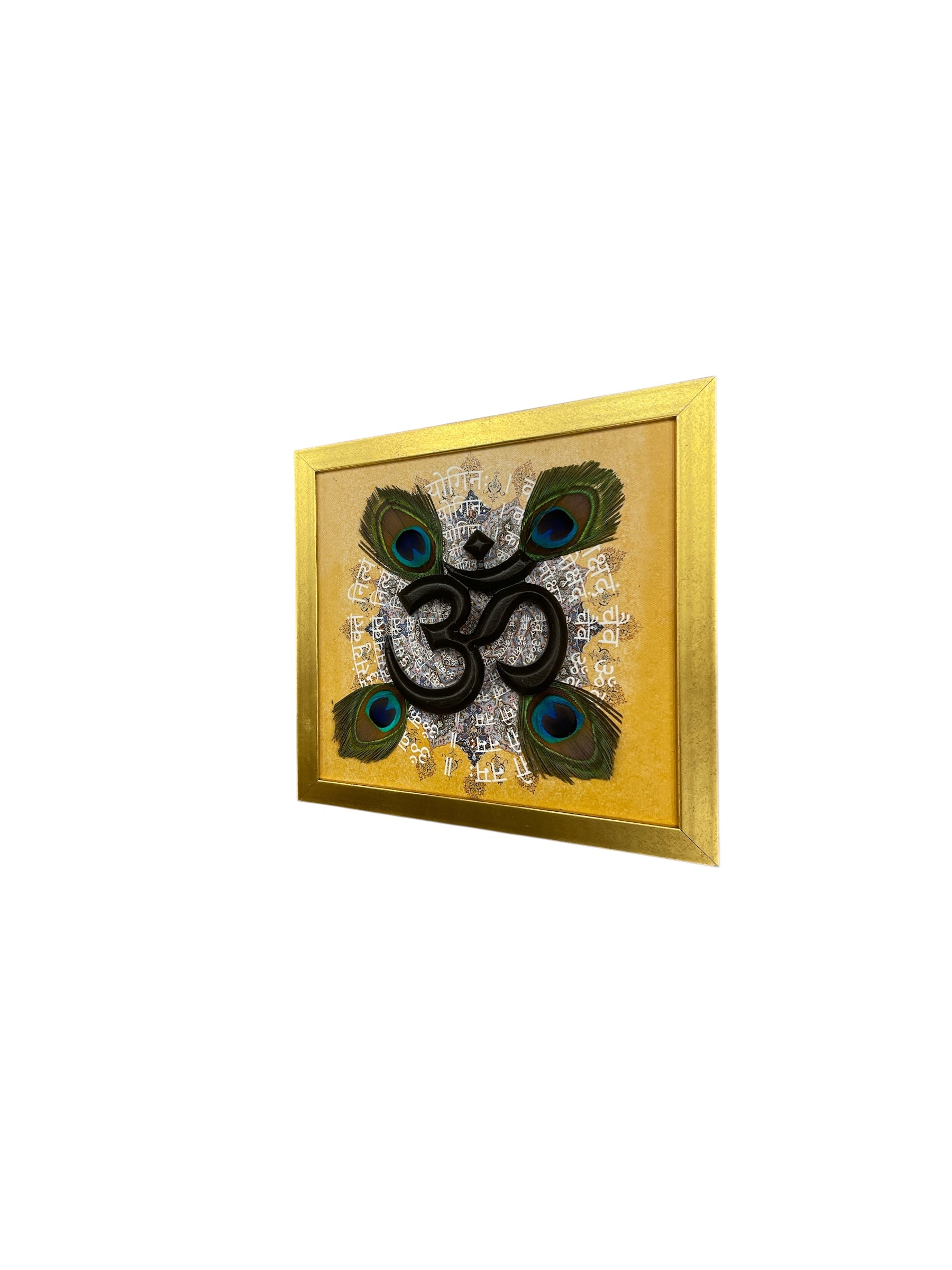 Wooden om with Peacock feather & Omkara mantra in Gold frame